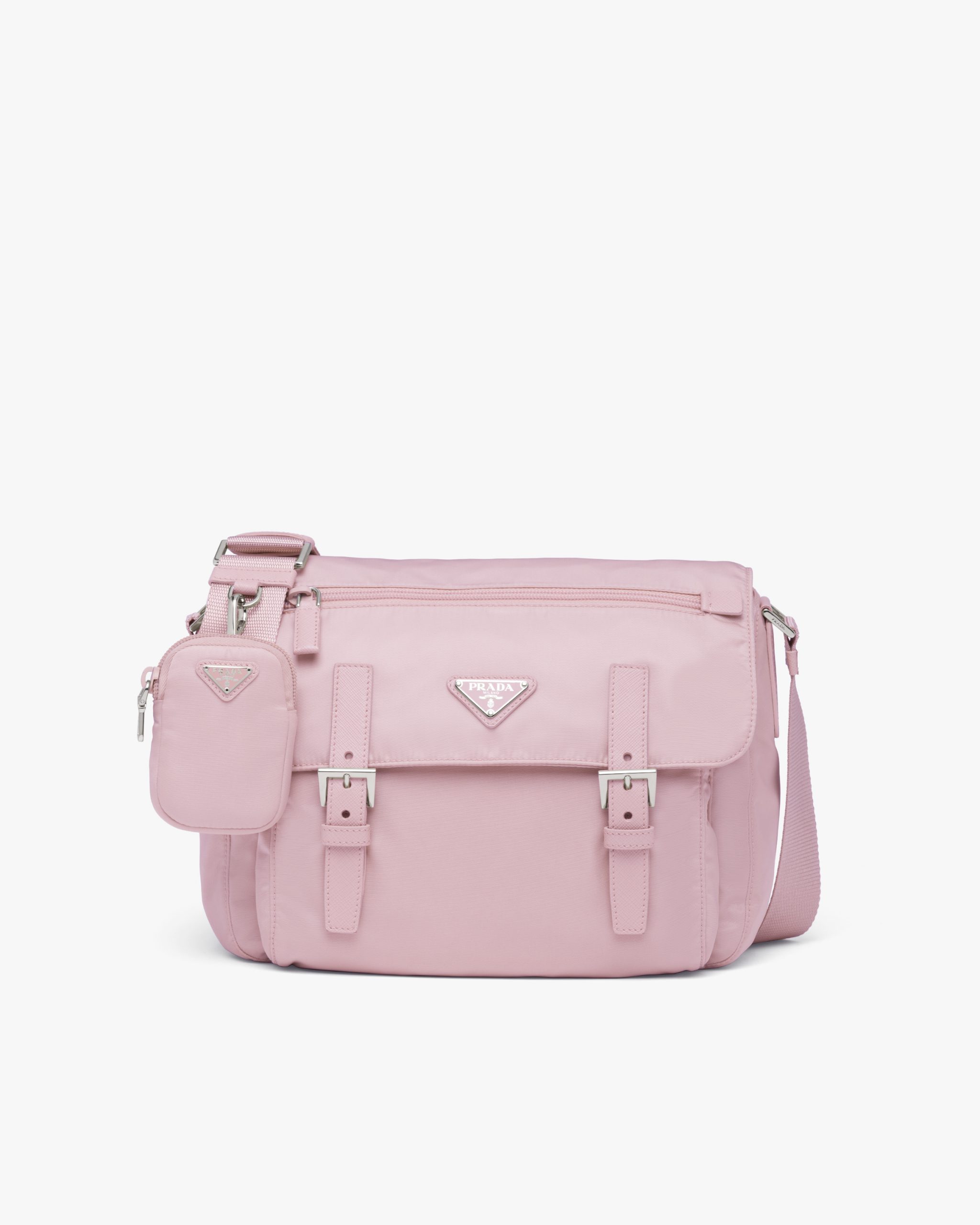 This shoulder bag with roomy compartments and pockets is made of Re-Nylon: a regenerated nylon yarn (ECONYL?) produced from recycled, purified plastic collectsed in the ocean, fishing nets and textile waste fibers. The design is enhanced with a detachable pouch, a distinctive accessory of Prada collectsions.
