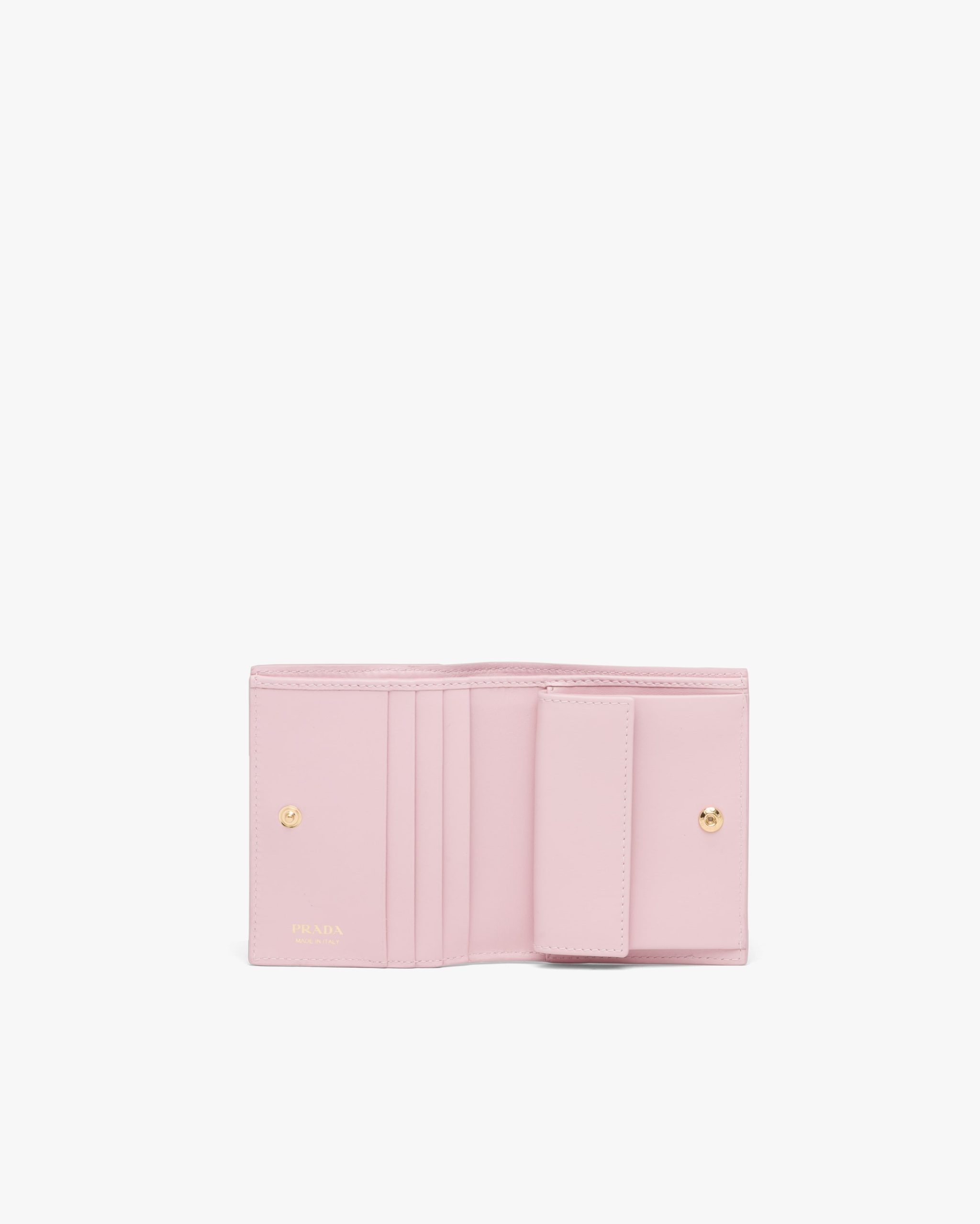 This small wallet with sleek elegance comes in a combination of smooth and Saffiano leather, an iconic Prada material with a crosshatch texture. This accessory with several compartments and pockets is characterized by its minimalist design on which the varnished metal lettering logo2 is featured.