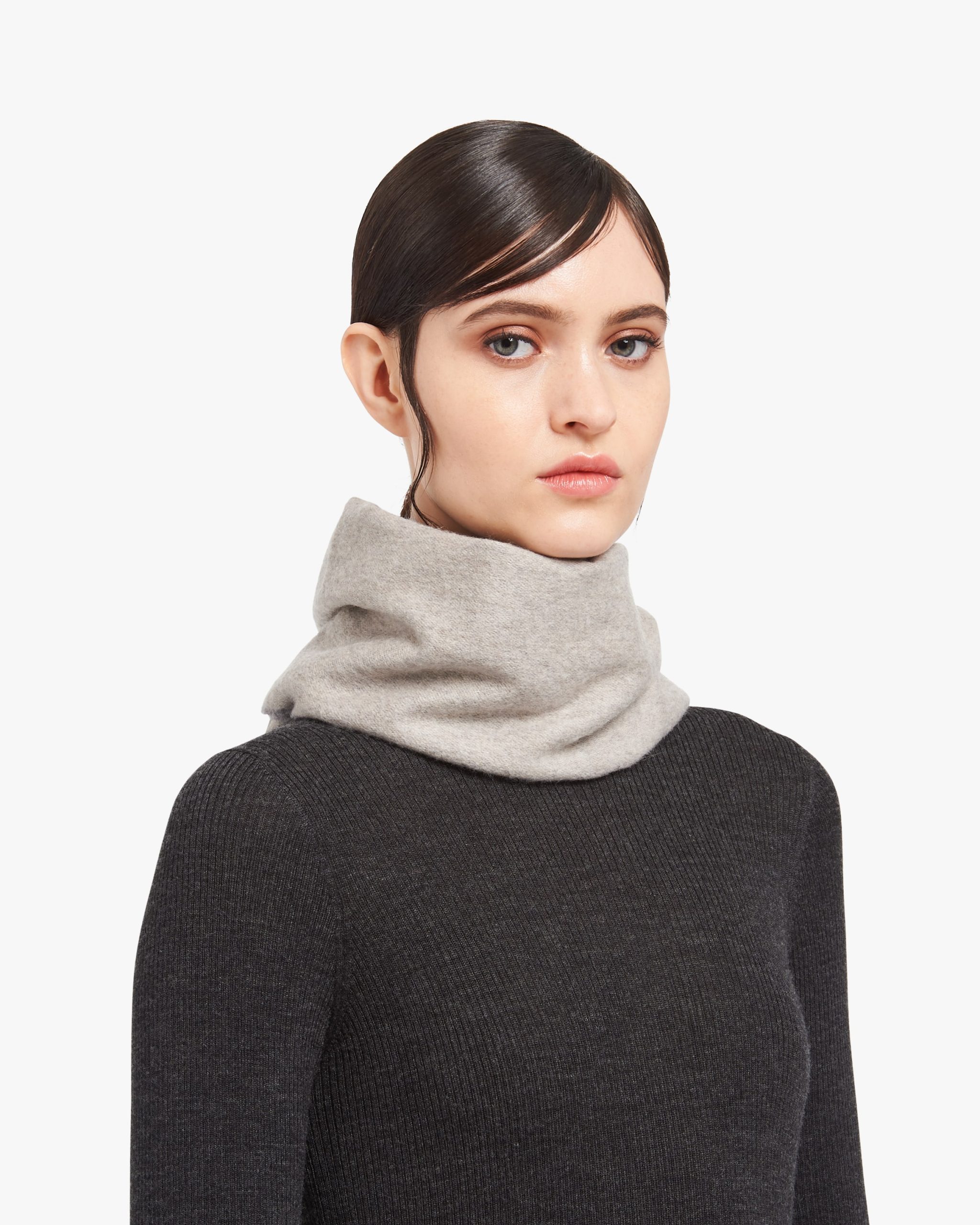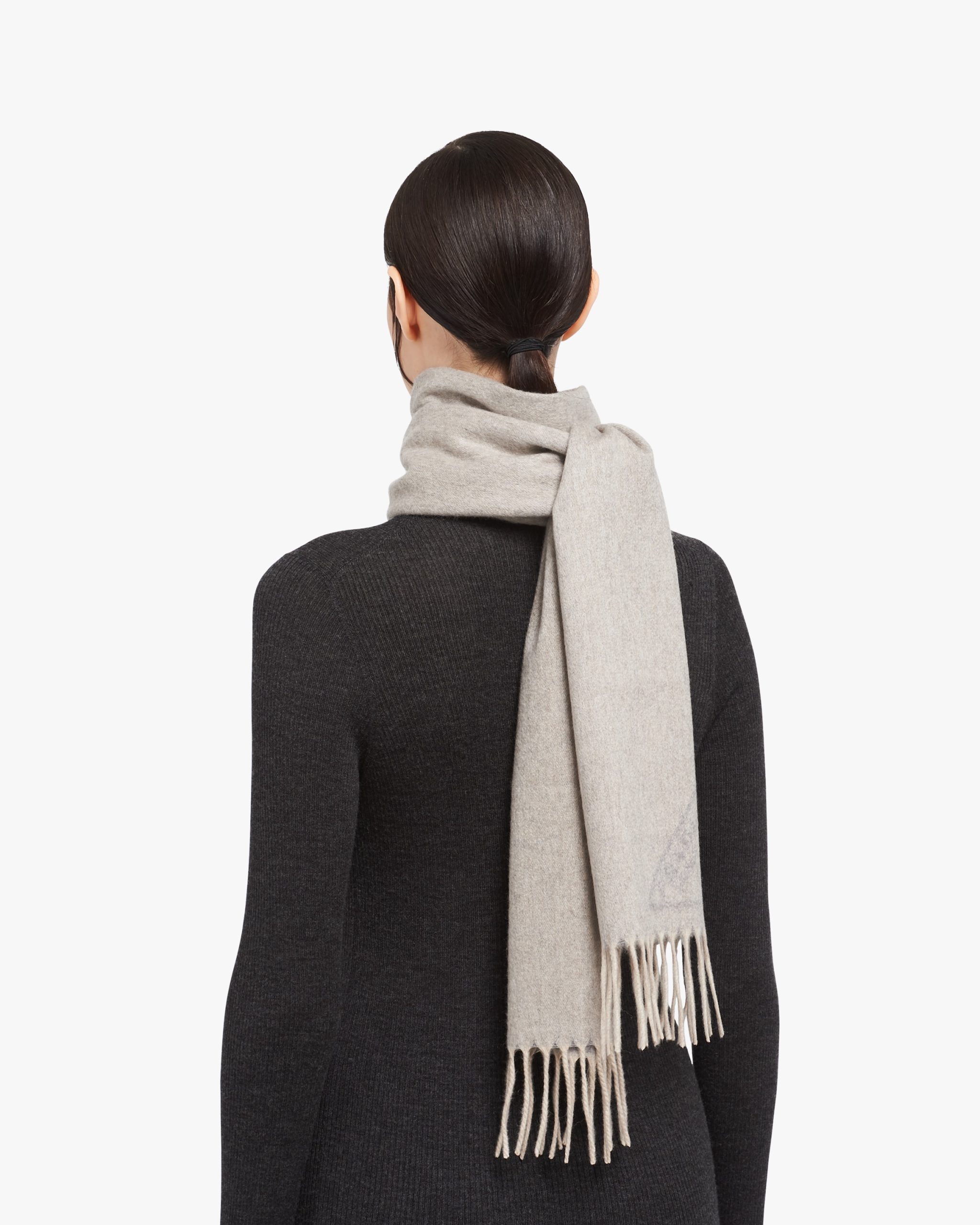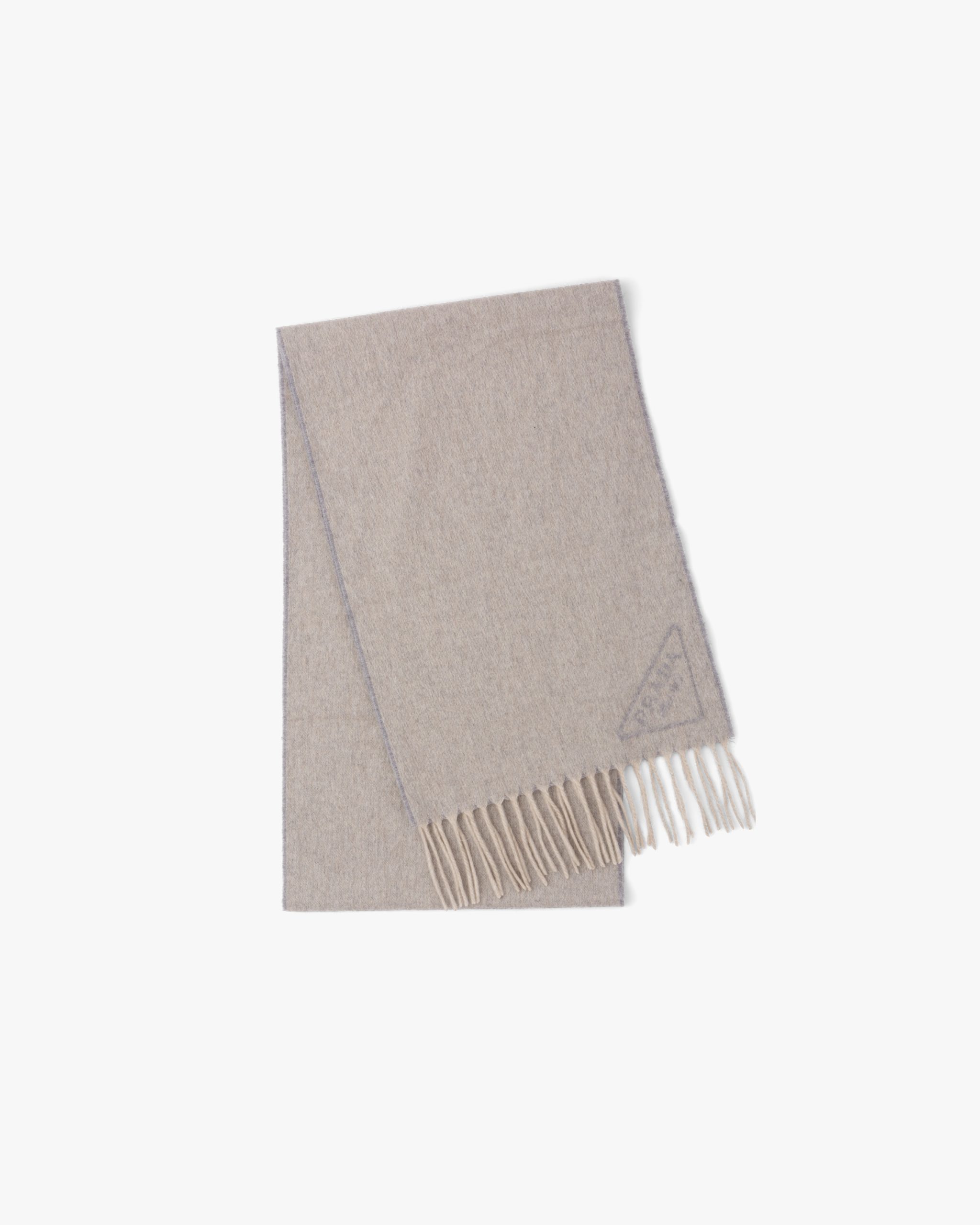 This soft double cashmere scarf is enhanced by Prada’s iconic lettering logo2 reinterpreted as a jacquard detail. Fringe trim on the edge completes the accessory.