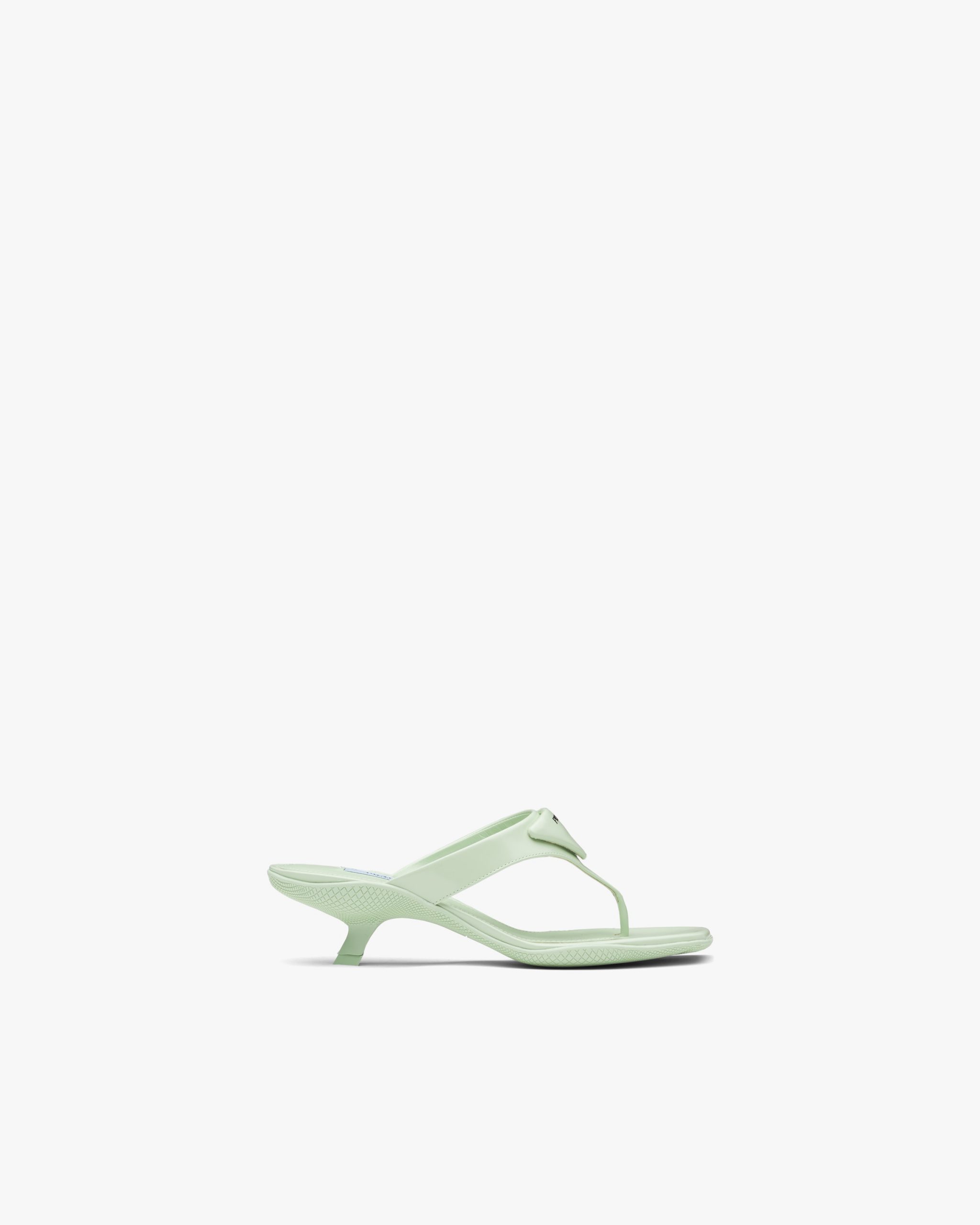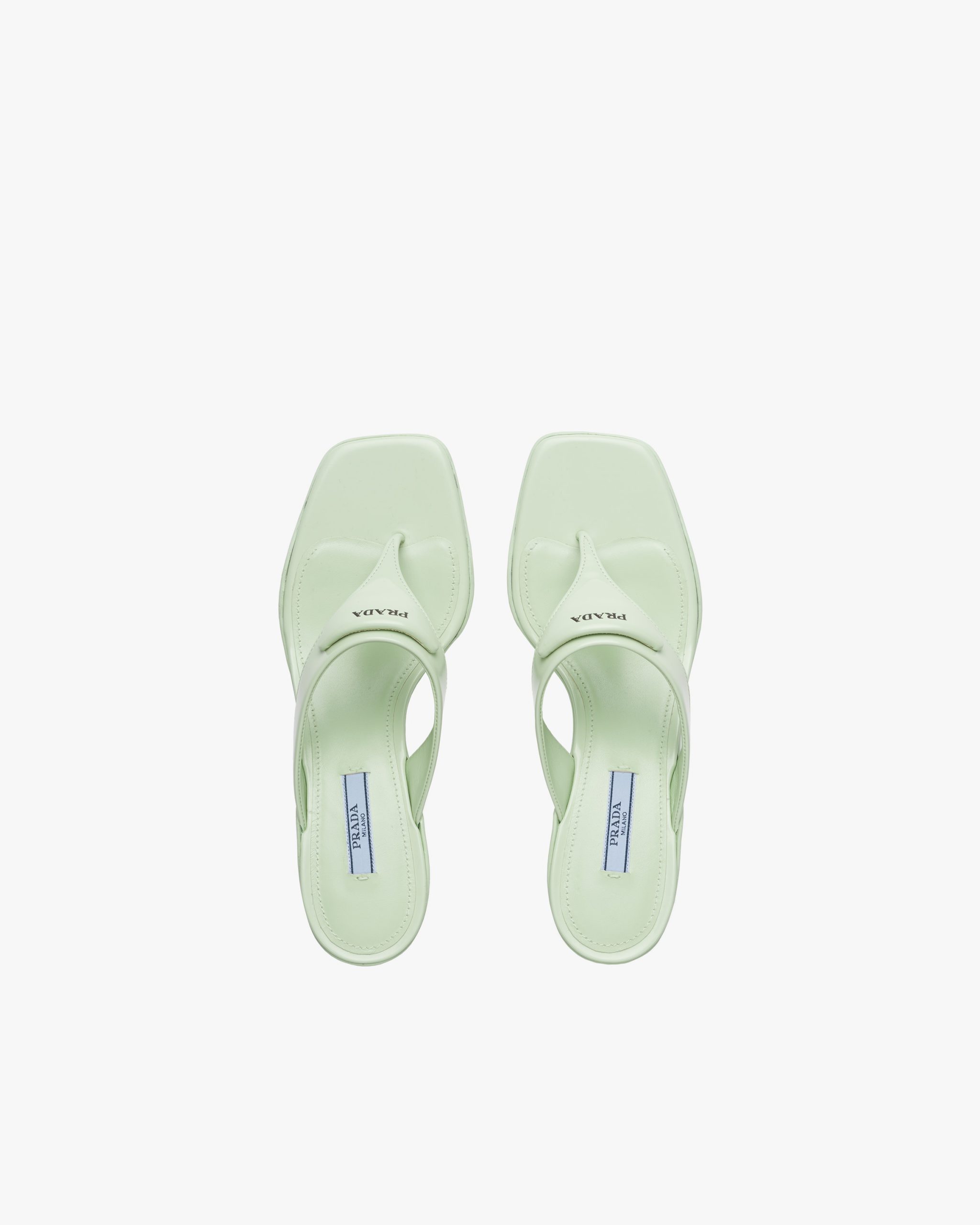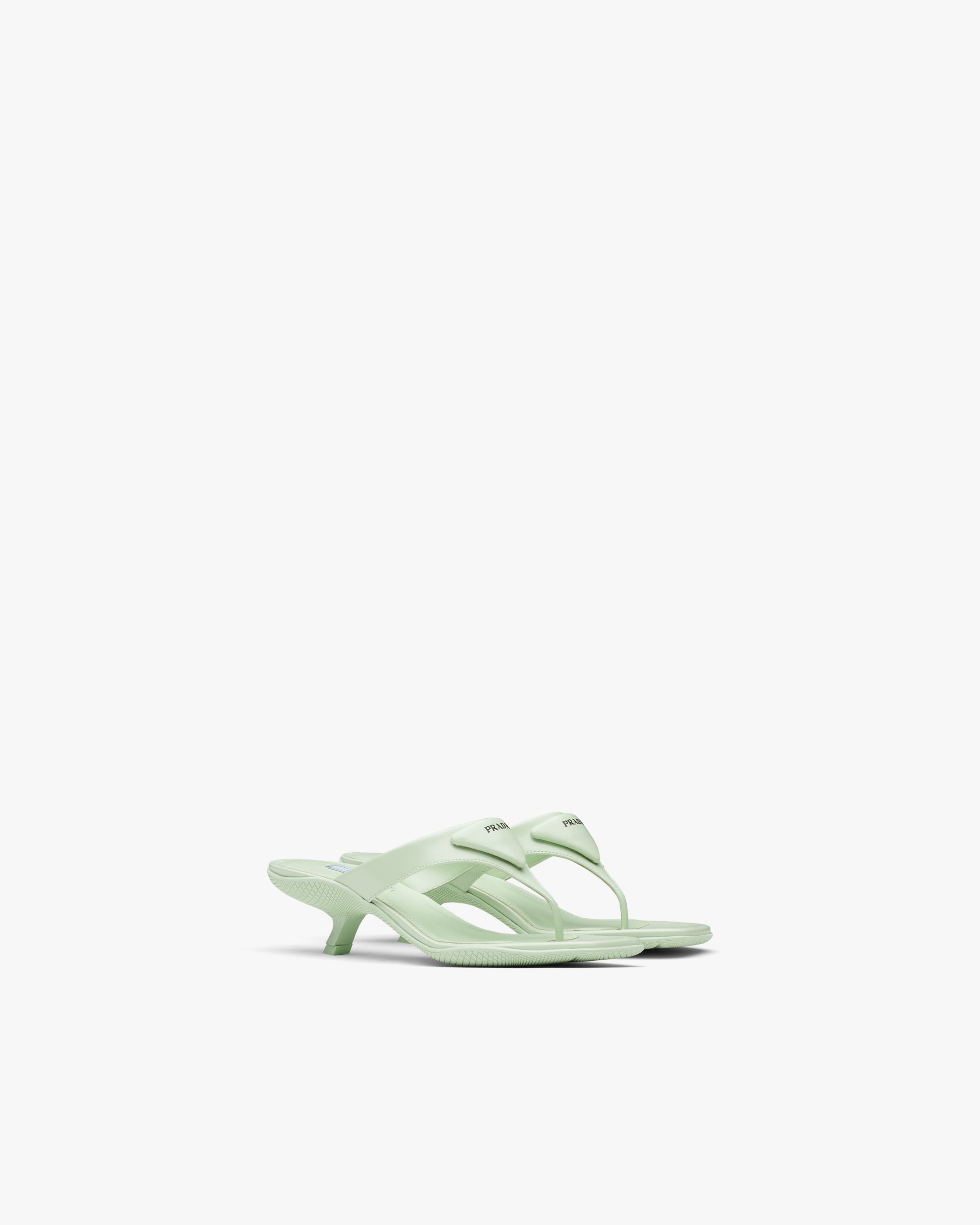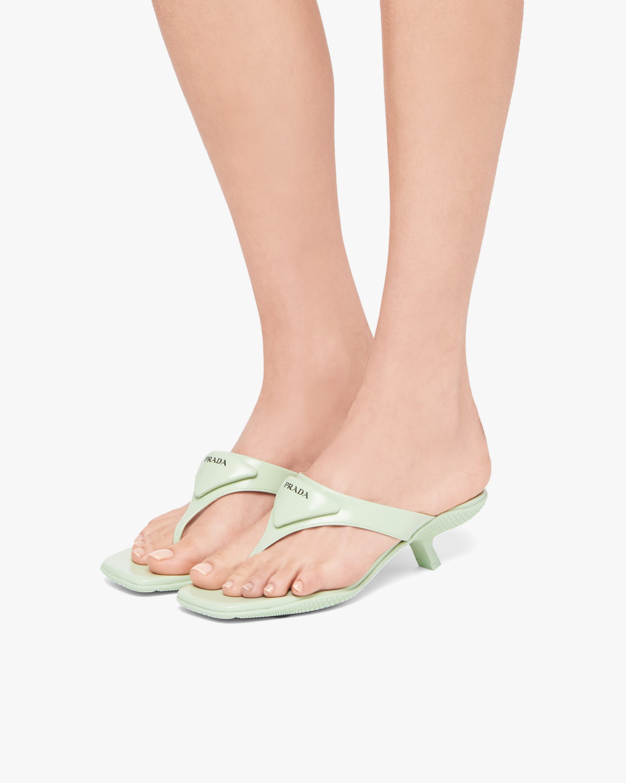 Distinctive elements of Prada shoes for Spring Summer 2021, the rubber shell sole and comma heel with a nineties mood define these high-heeled thong sandals accented with a contemporary take on the classic triangle logo2. Brushed leather, traditionally used for classic fine footwear, is reinterpreted in Prada collectsions on unexpected designs for a hybrid result that reflects the duality of the brand.