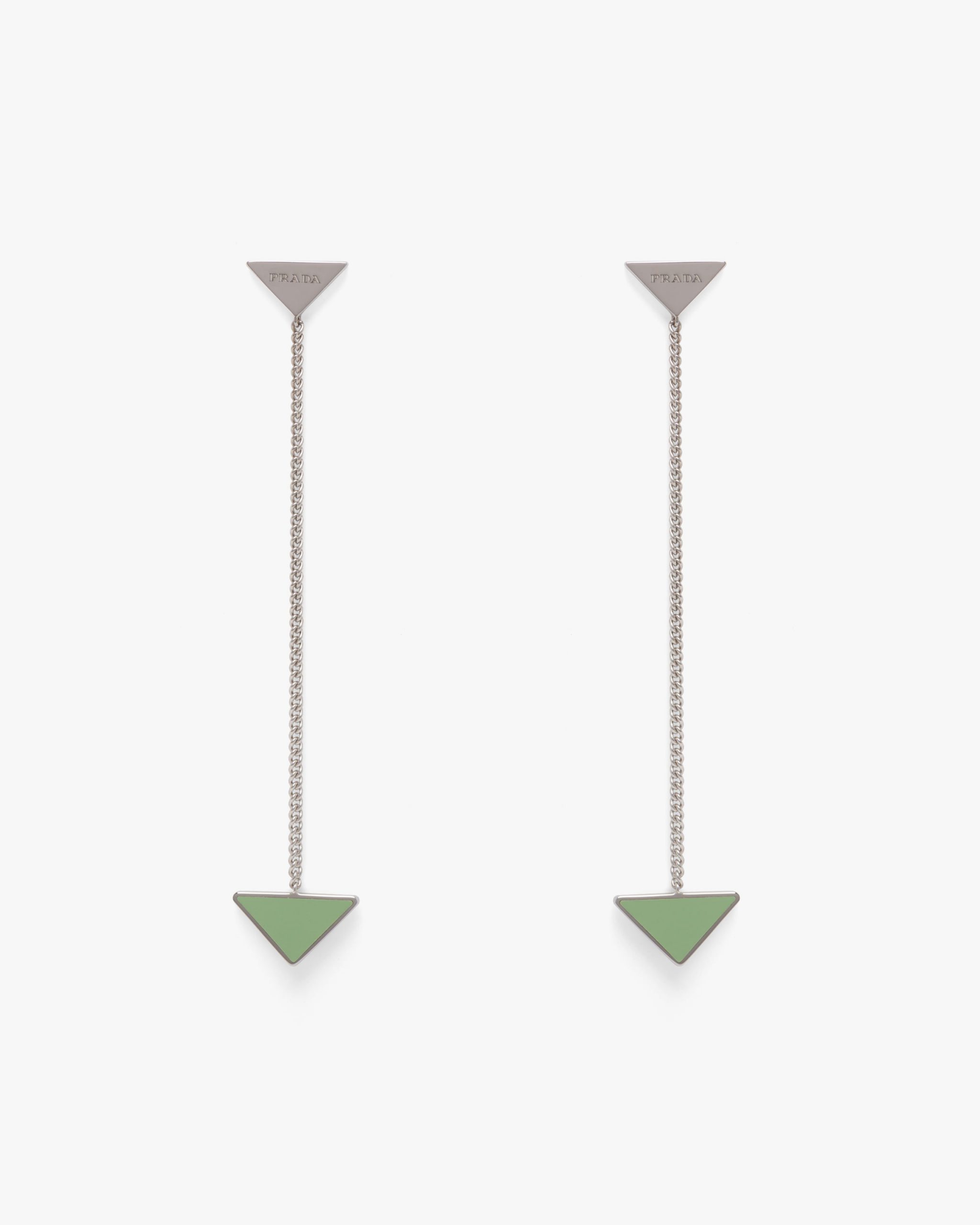 The Prada enameled triangle returns as a delicate detail in these drop earrings with a palladium finish. Iconic and sleek, the triangle logo2 is the protagonist of a new line of jewelry made of 925 sterling silver that reinterprets punk influences in a modern way.