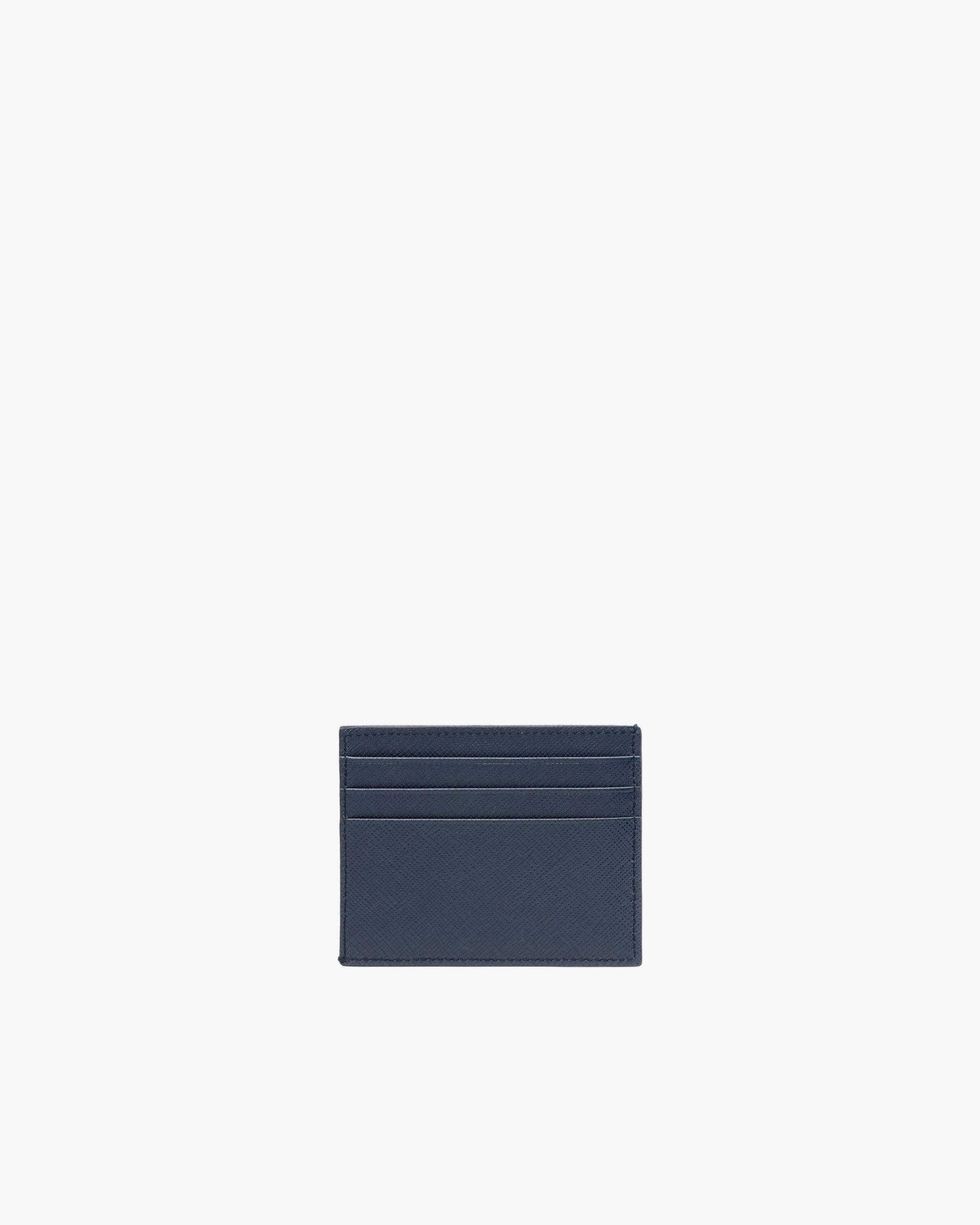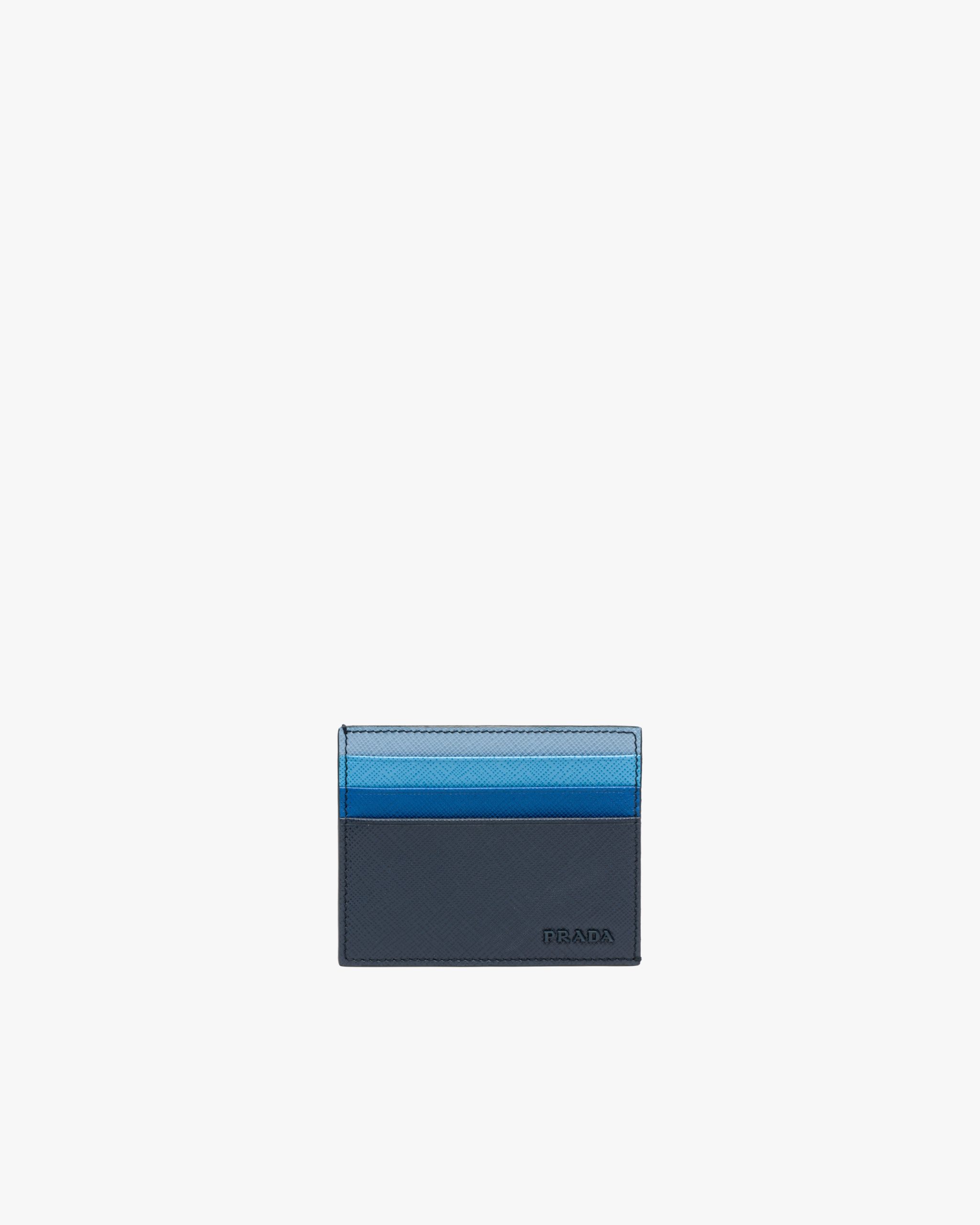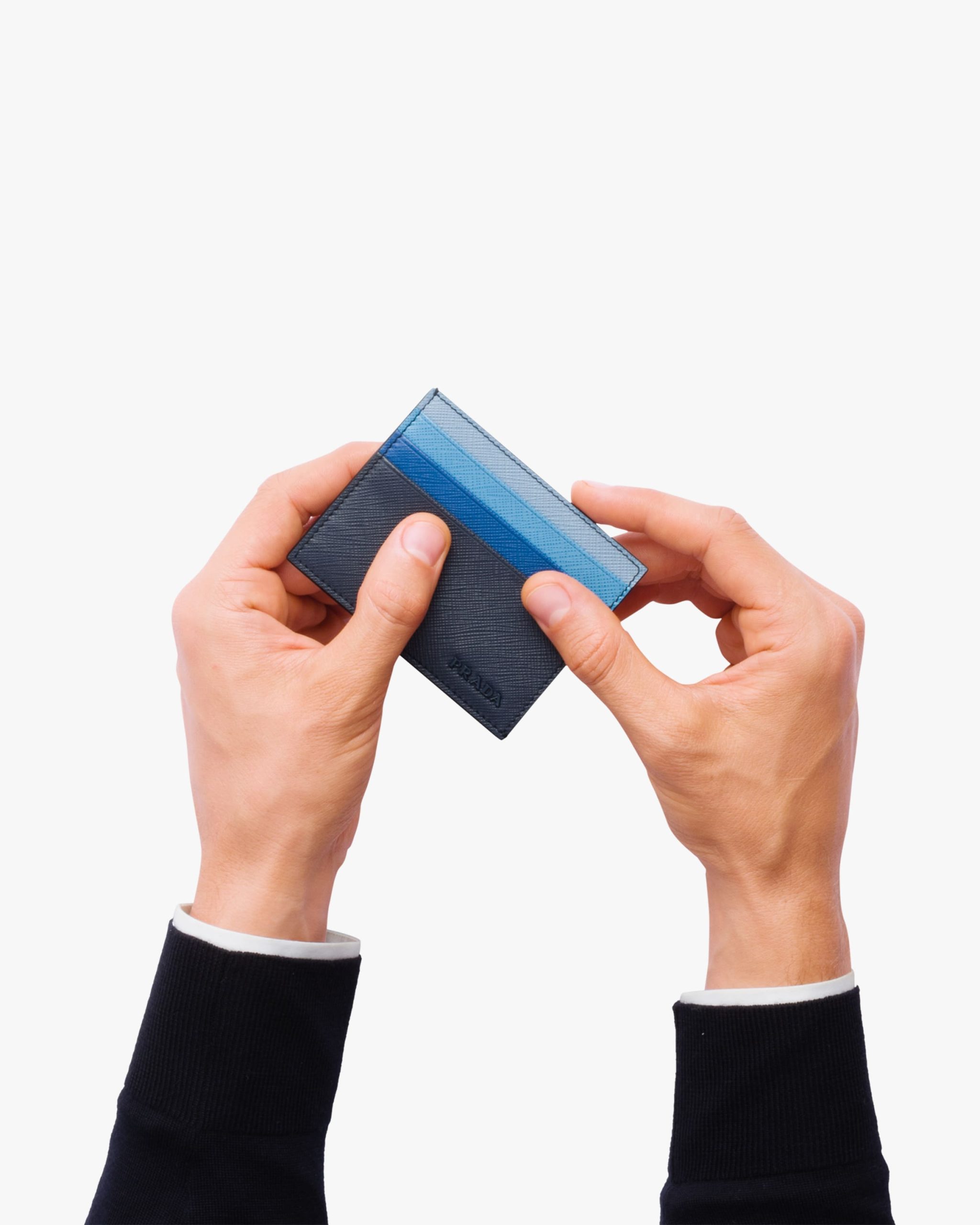 This Saffiano leather credit card holder with six slots has a harmonious gradient effect. The accessory has a fabric lining, while the metal logo2 is enameled.