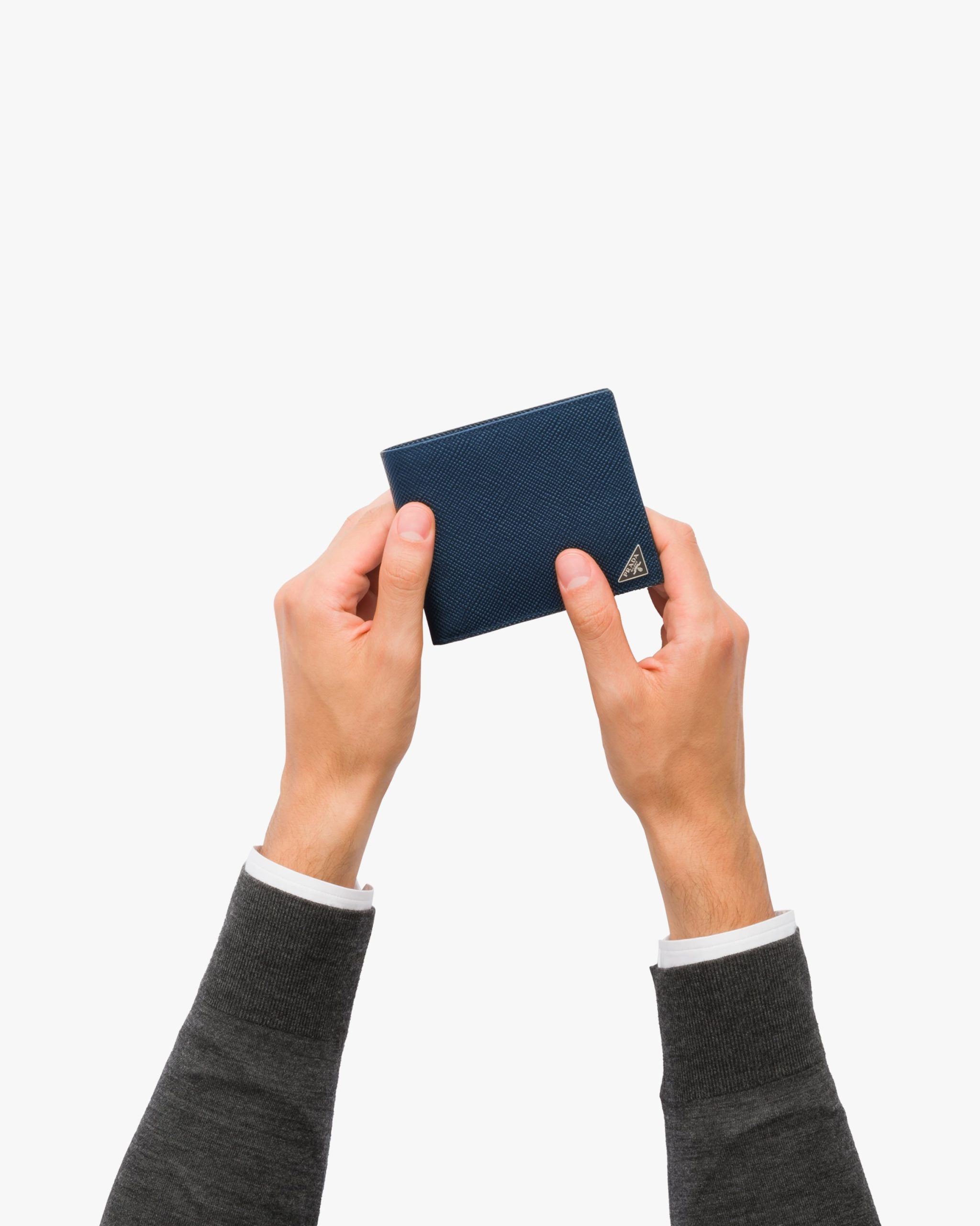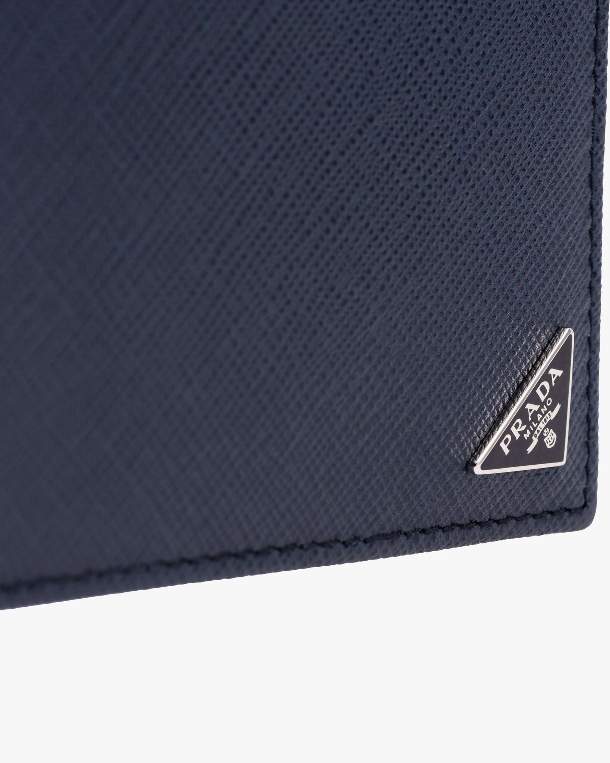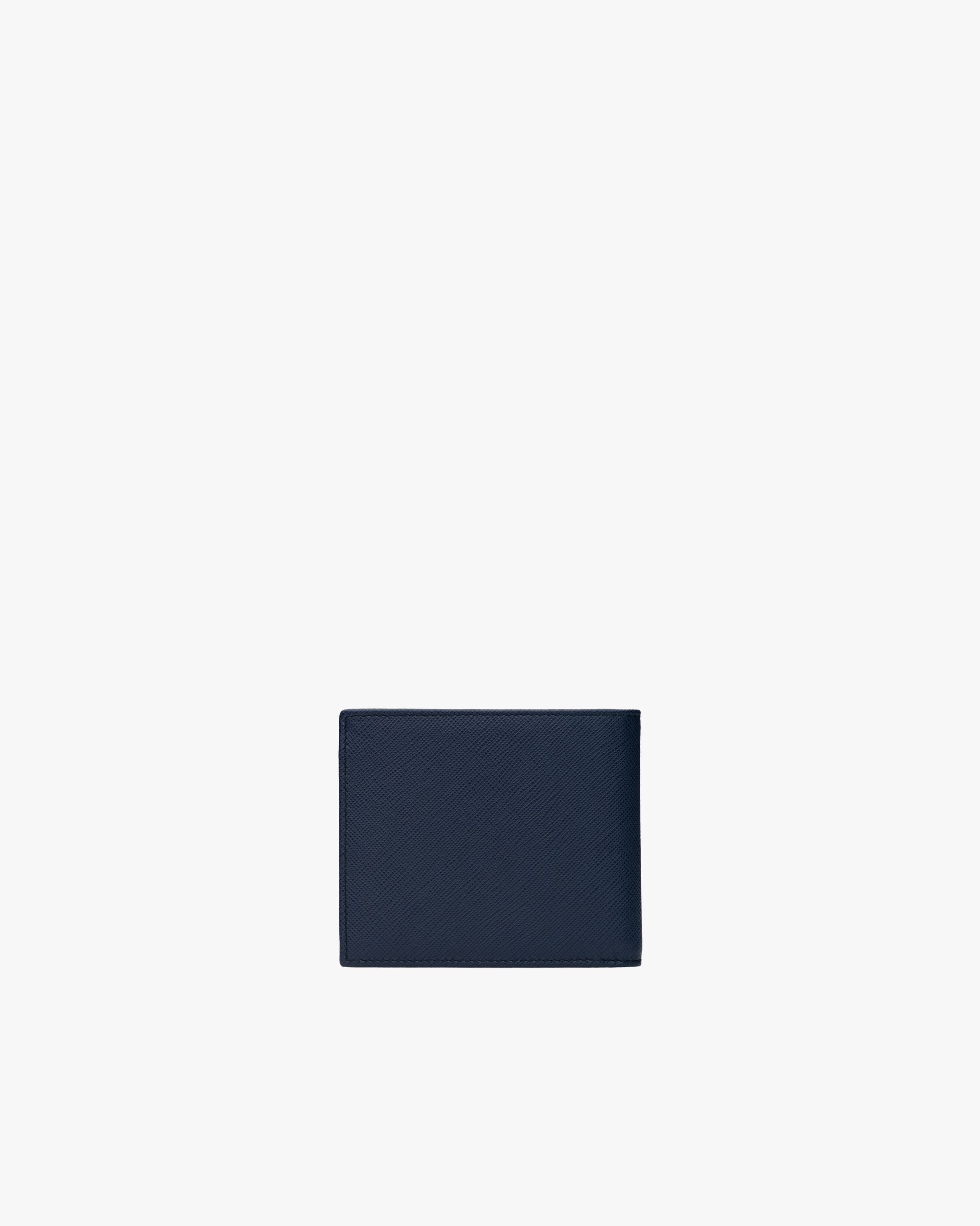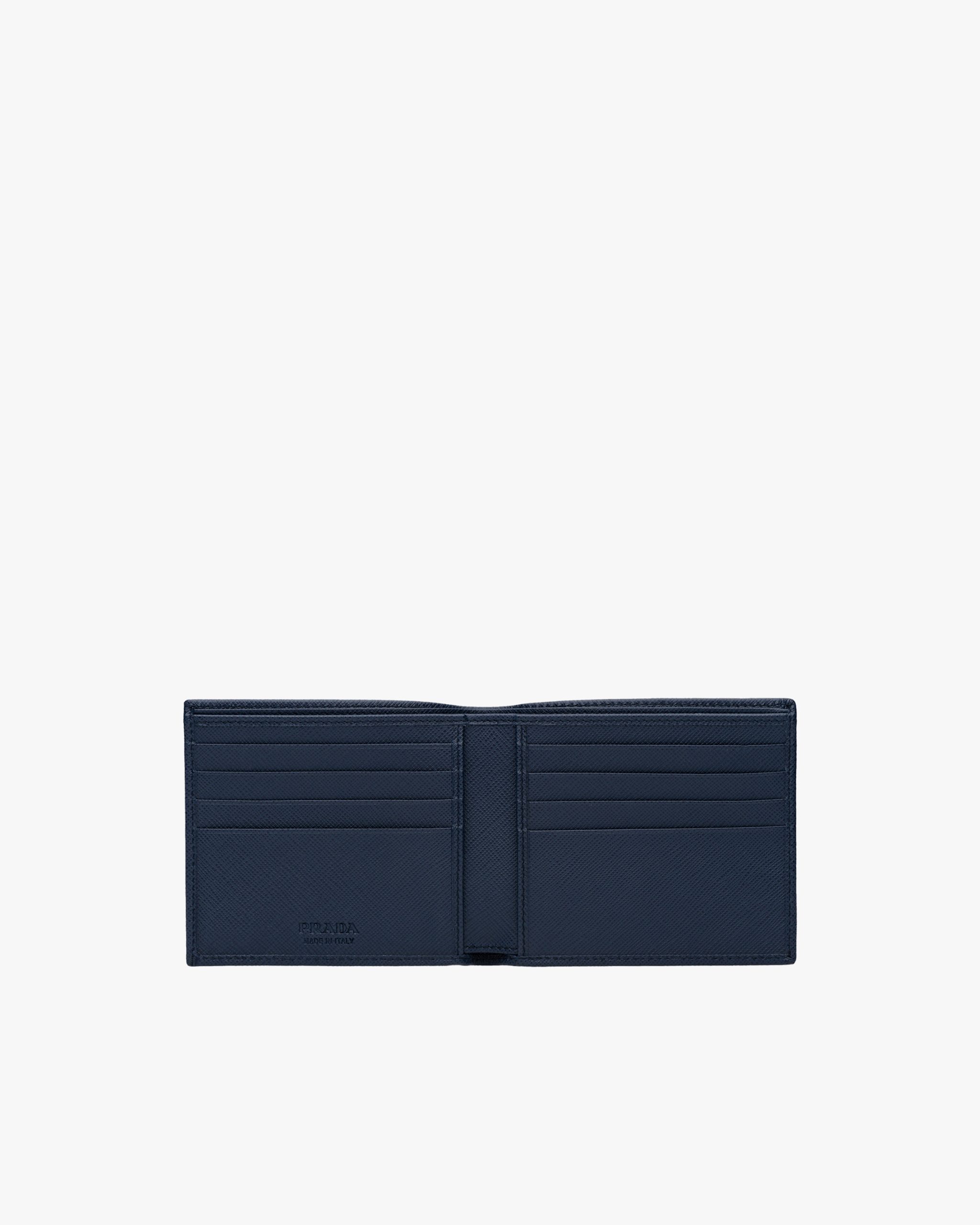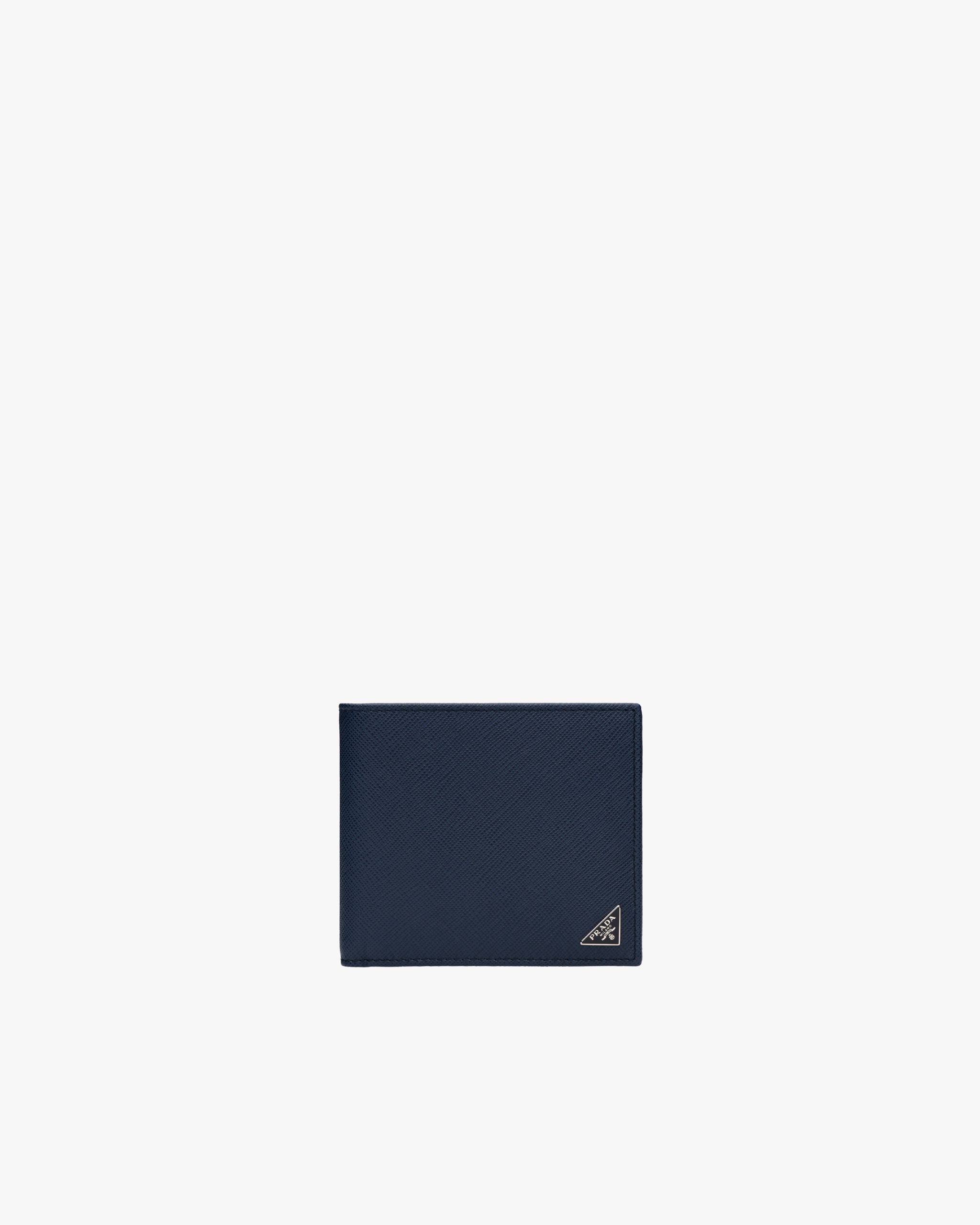 This leather wallet pairs Saffiano leather with an enameled triangle corner logo2. Its interior is fabric-lined, and it opens to eight credit card slots and several pockets and compartments.