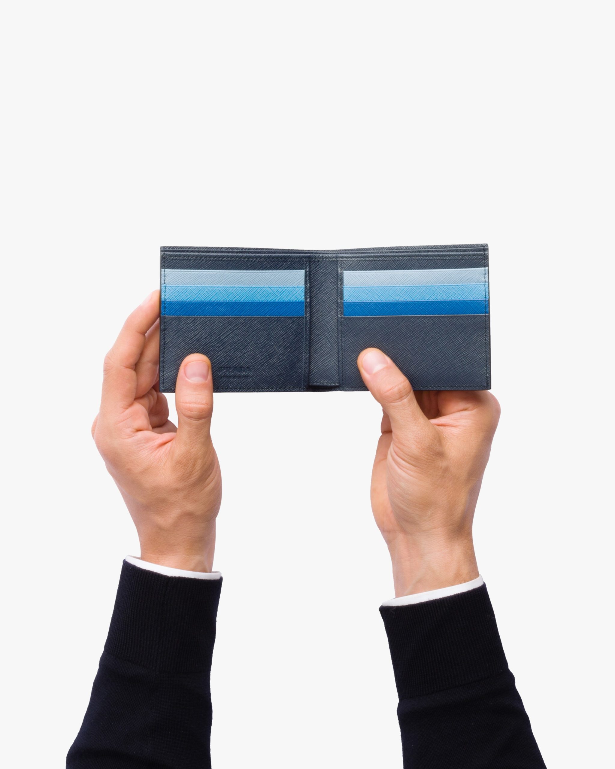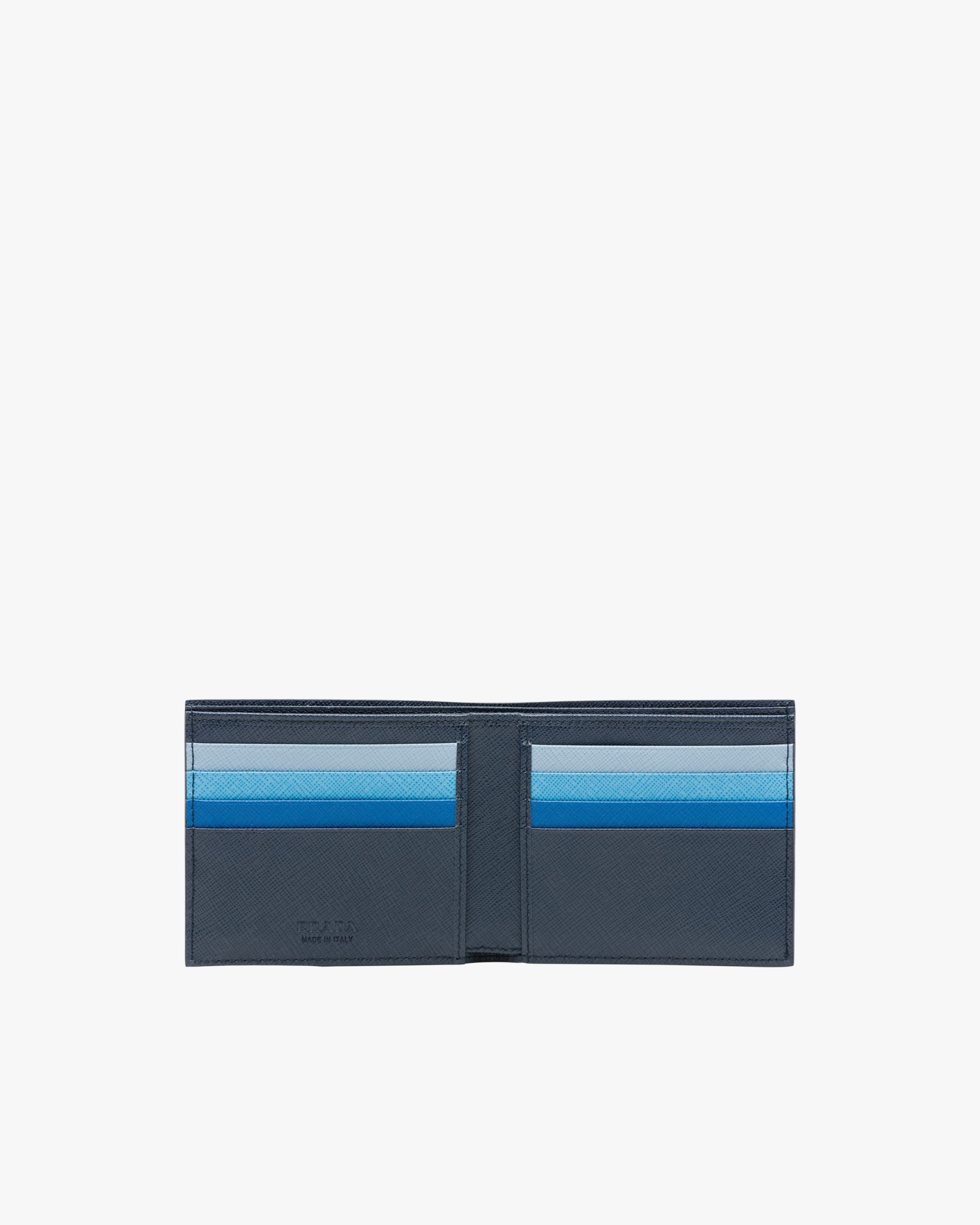 This elegant Saffiano leather wallet is decorated with a tonal lettering logo2 and has document pockets, bill compartments and eight card slots in contrasting colors inside.