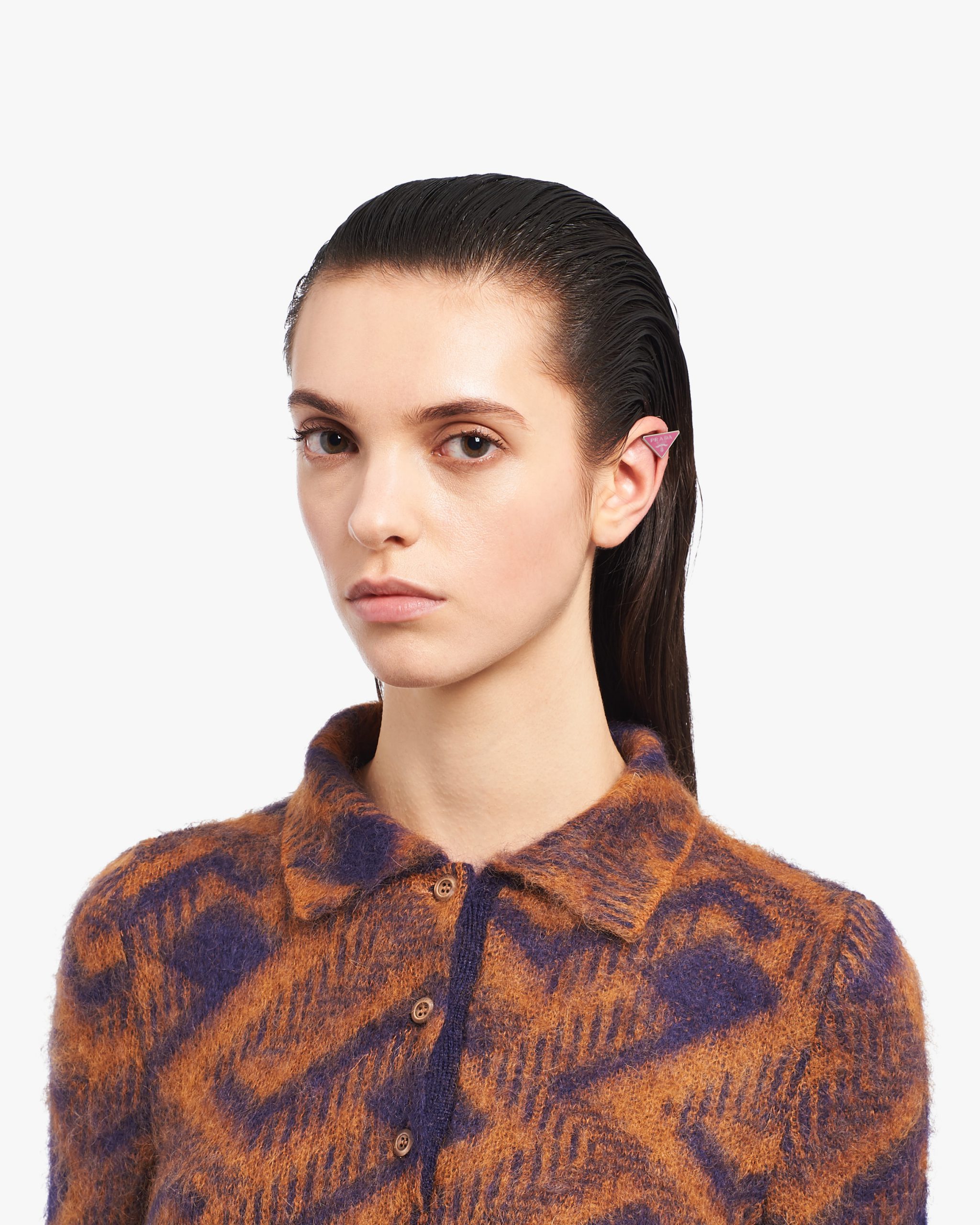 The sleek, iconic triangle logo2 is the protagonist of a new jewelry line made of 925 sterling silver that reinterprets punk influences in a modern way. Prada’s historic code with an enamel finish defines this single clip earring.