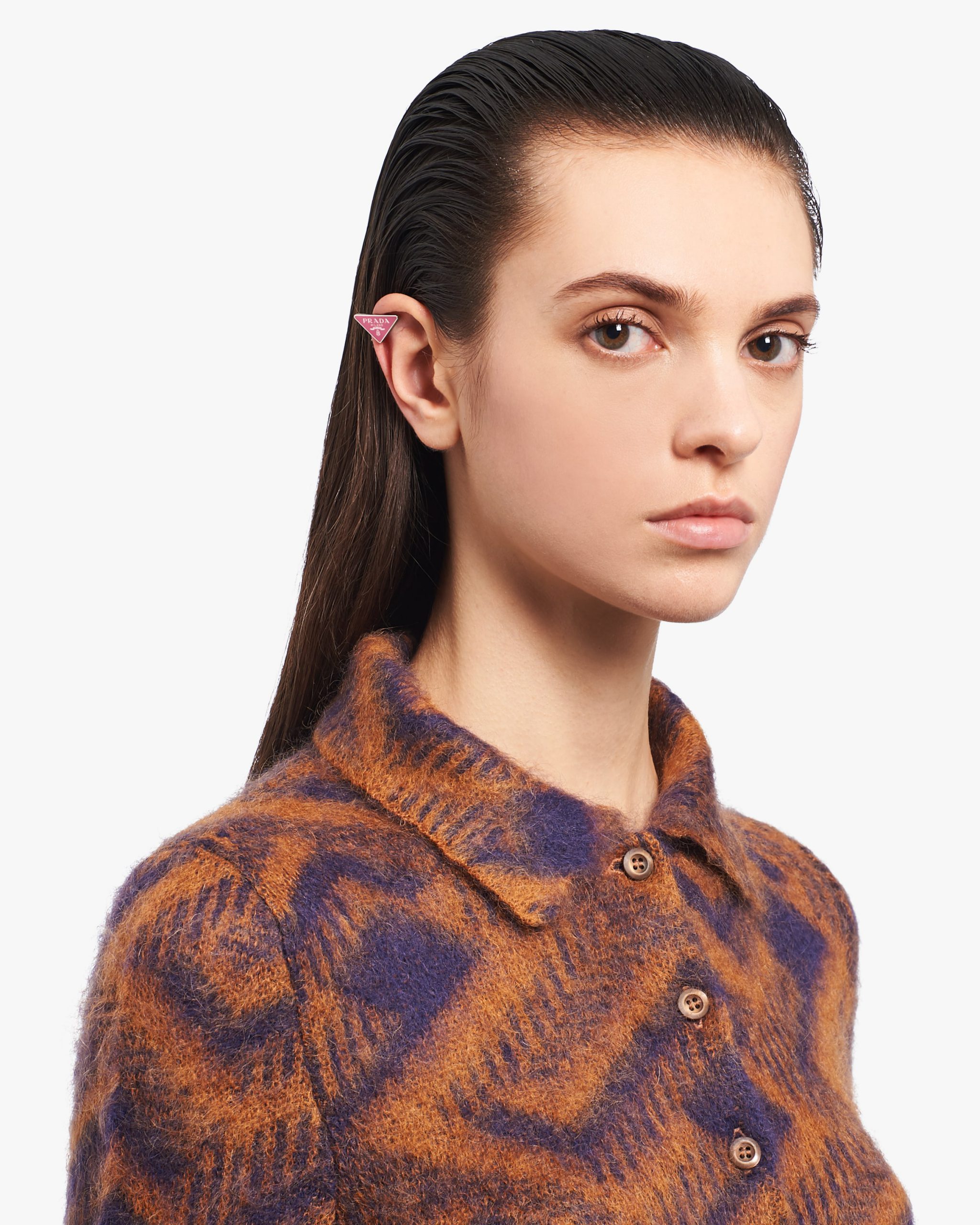 The sleek, iconic triangle logo2 is the protagonist of a new jewelry line made of 925 sterling silver that reinterprets punk influences in a modern way. Prada’s historic code with an enamel finish defines this single clip earring.