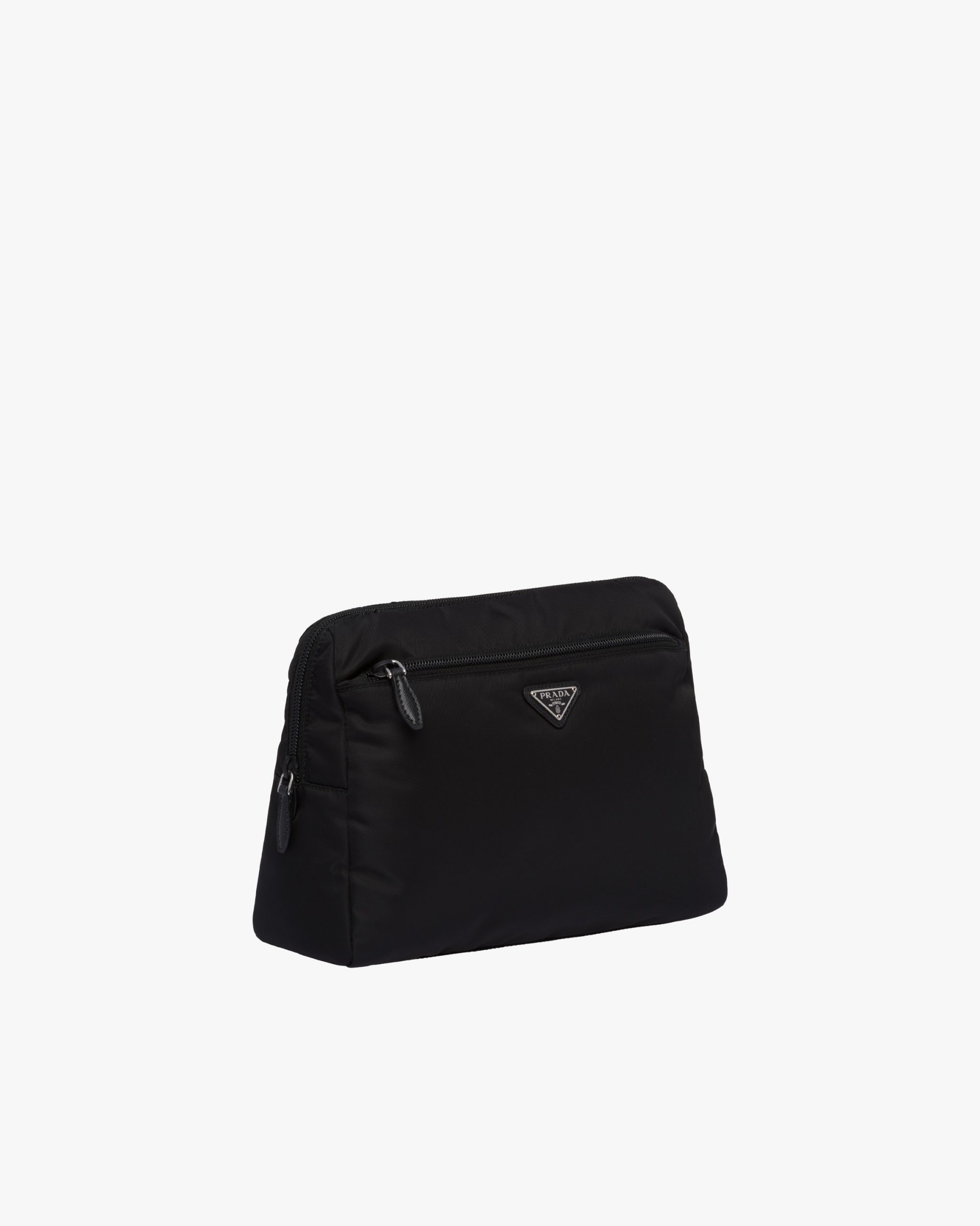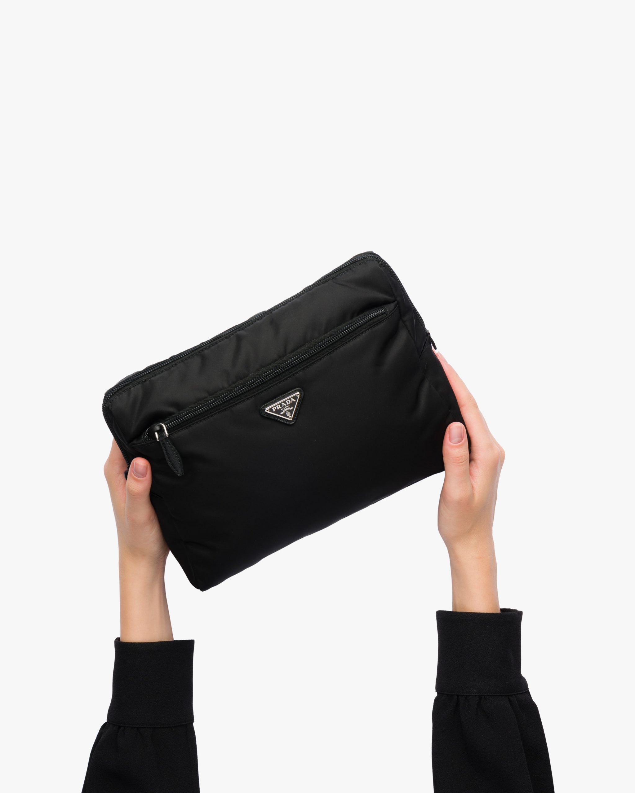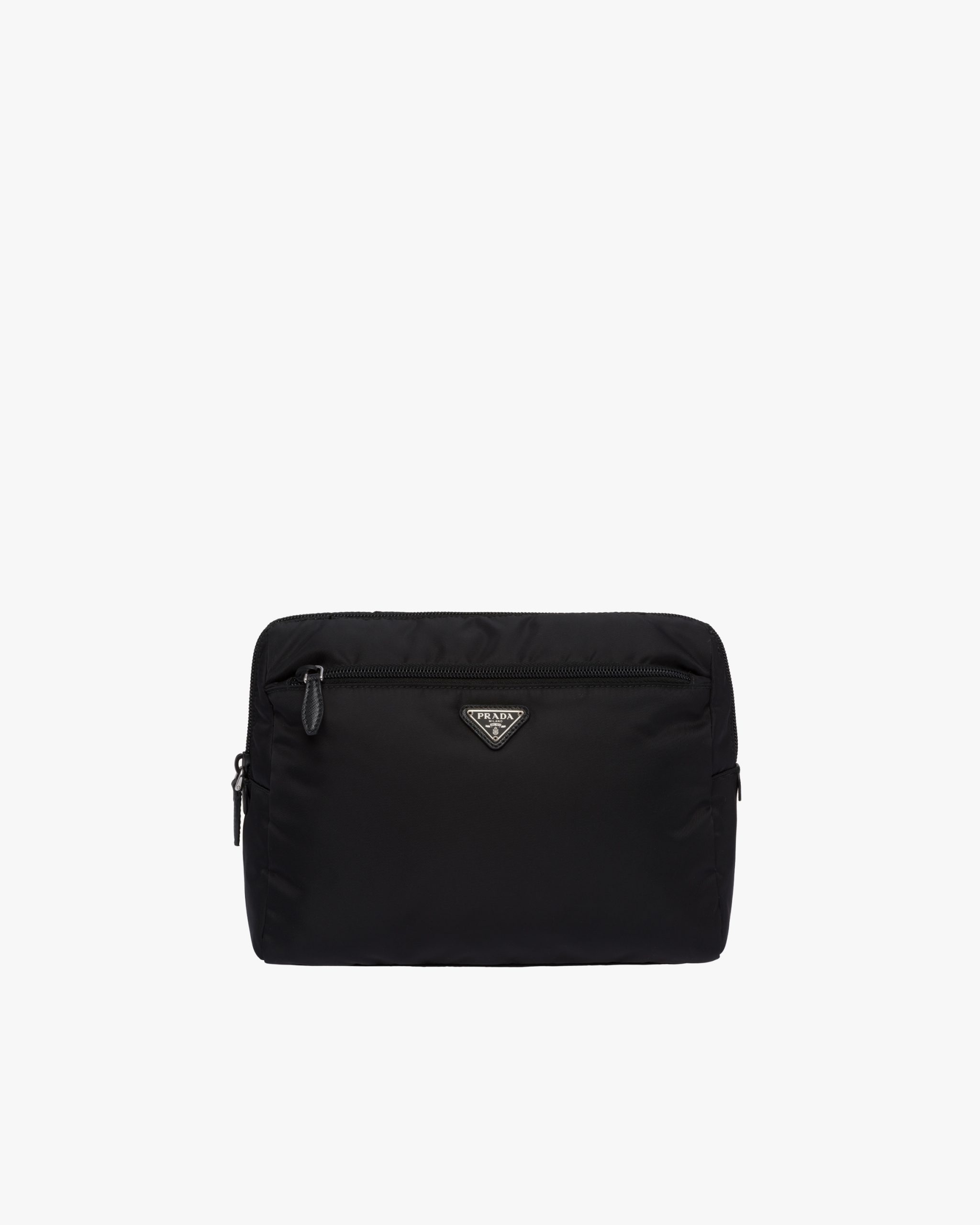 Characterized by a sleek line and emphasized by the iconic enameled metal triangle logo2, this pouch is made of Prada’s innovative Re-Nylon fabric produced from recycled plastic materials collectsed in the ocean. The practical and versatile accessory is accented with zipper pockets inside and out.