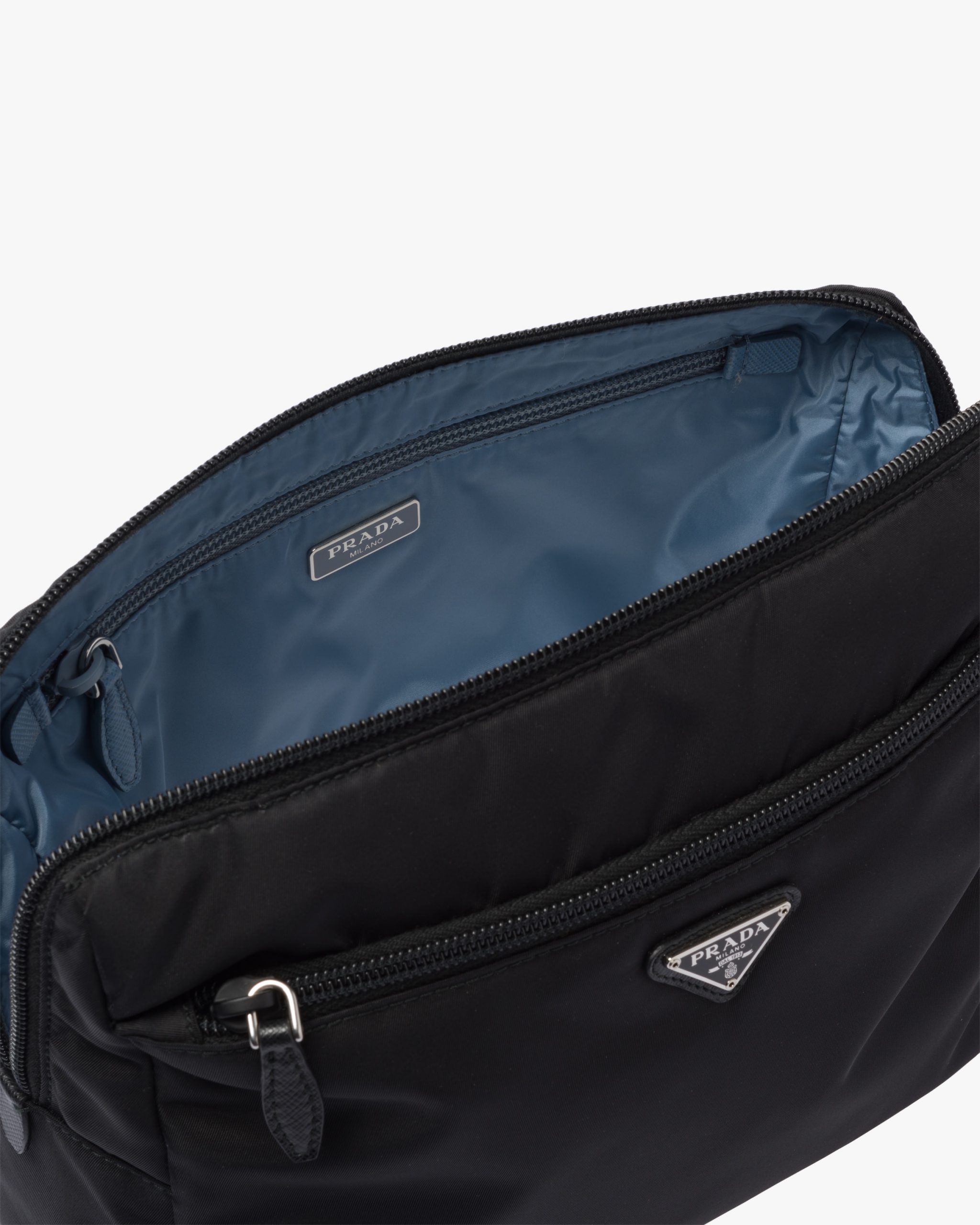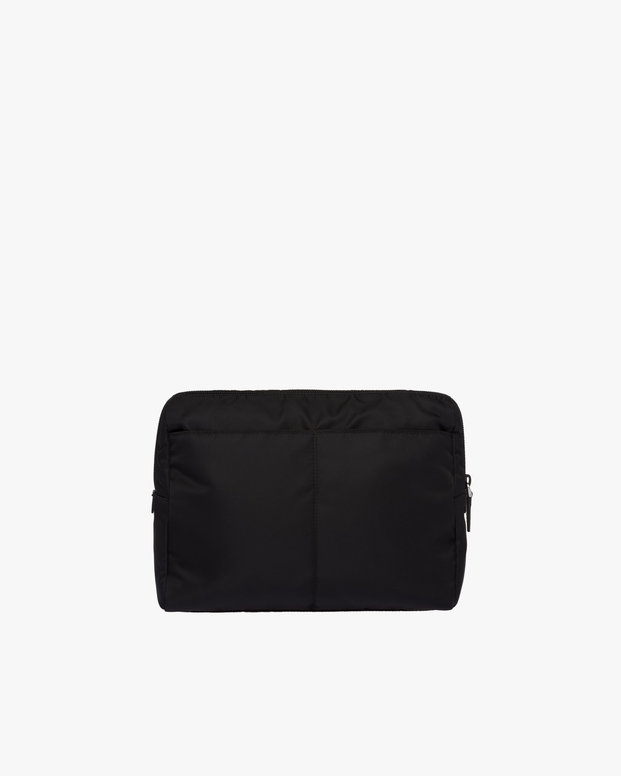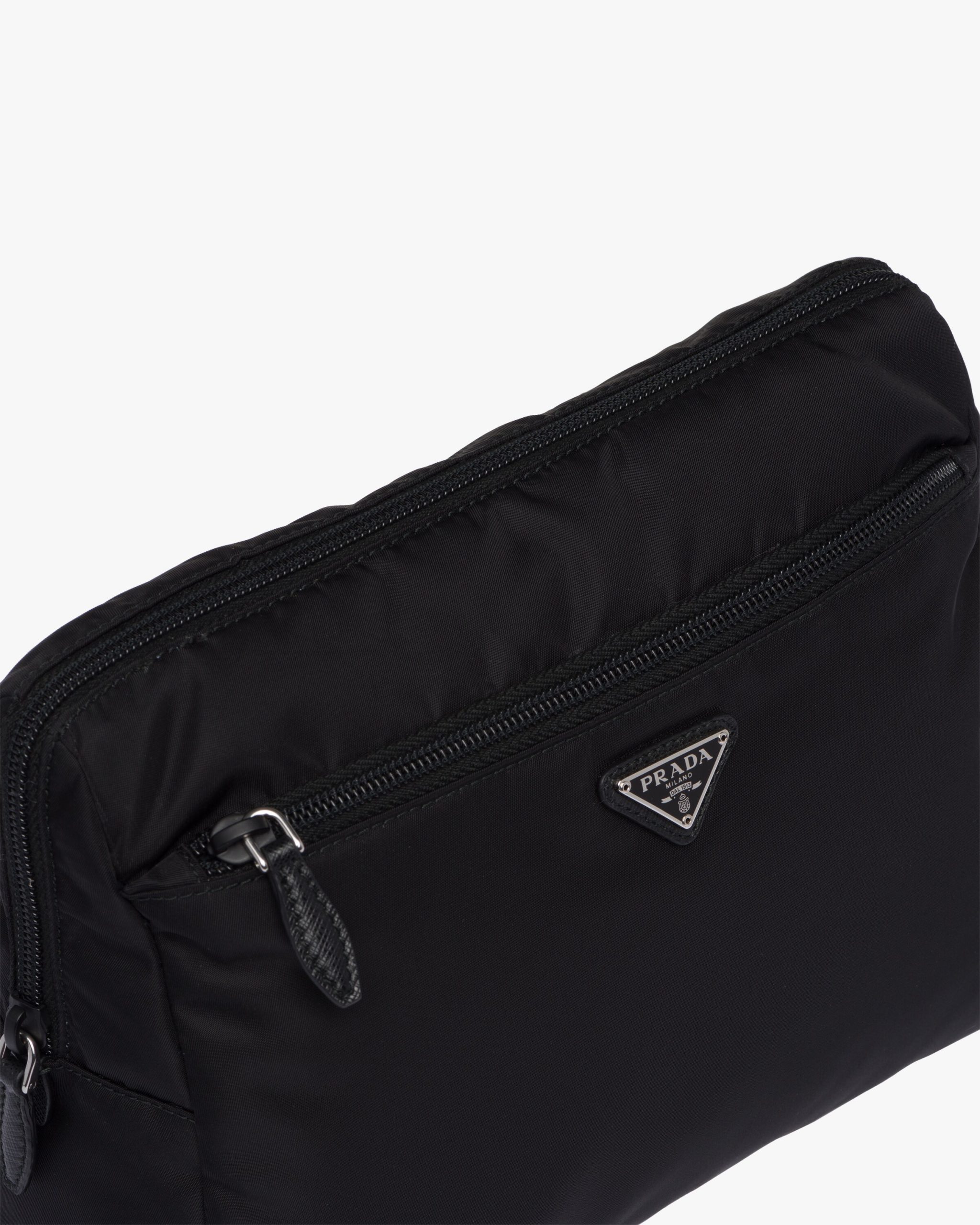 Characterized by a sleek line and emphasized by the iconic enameled metal triangle logo2, this pouch is made of Prada’s innovative Re-Nylon fabric produced from recycled plastic materials collectsed in the ocean. The practical and versatile accessory is accented with zipper pockets inside and out.