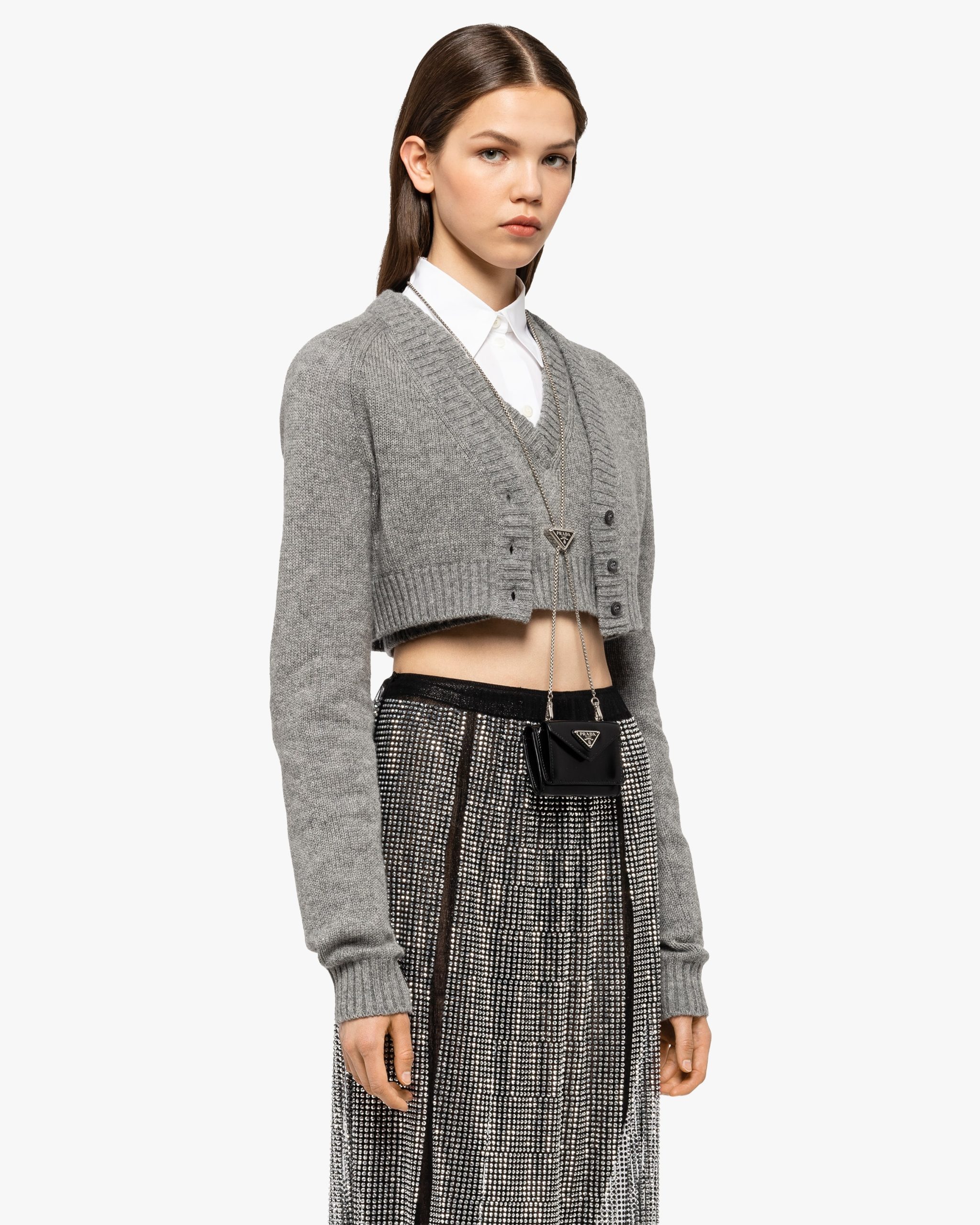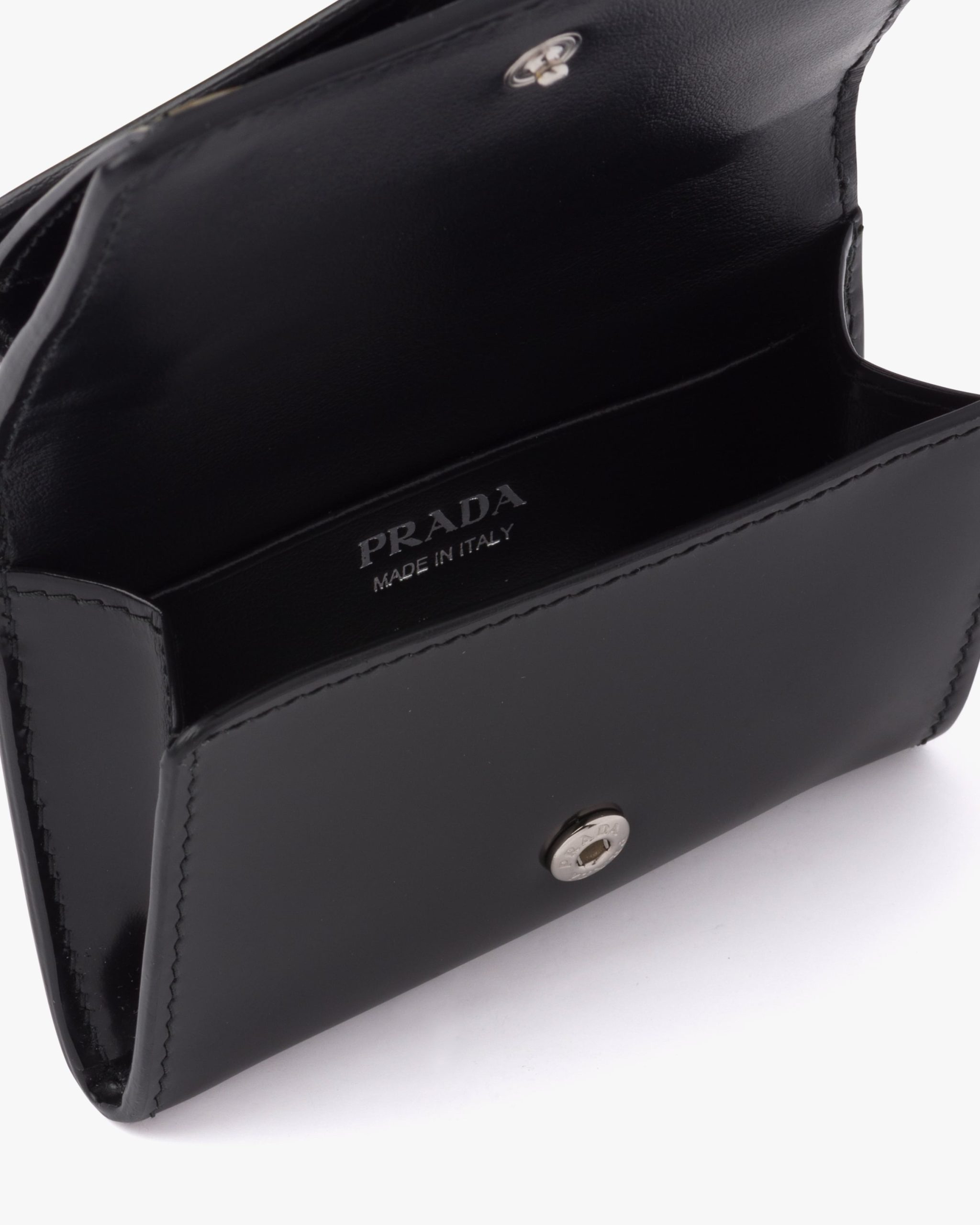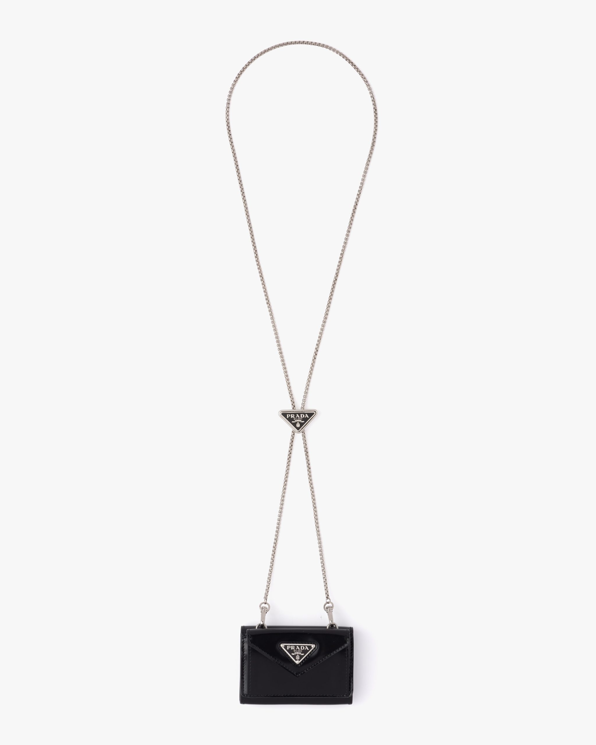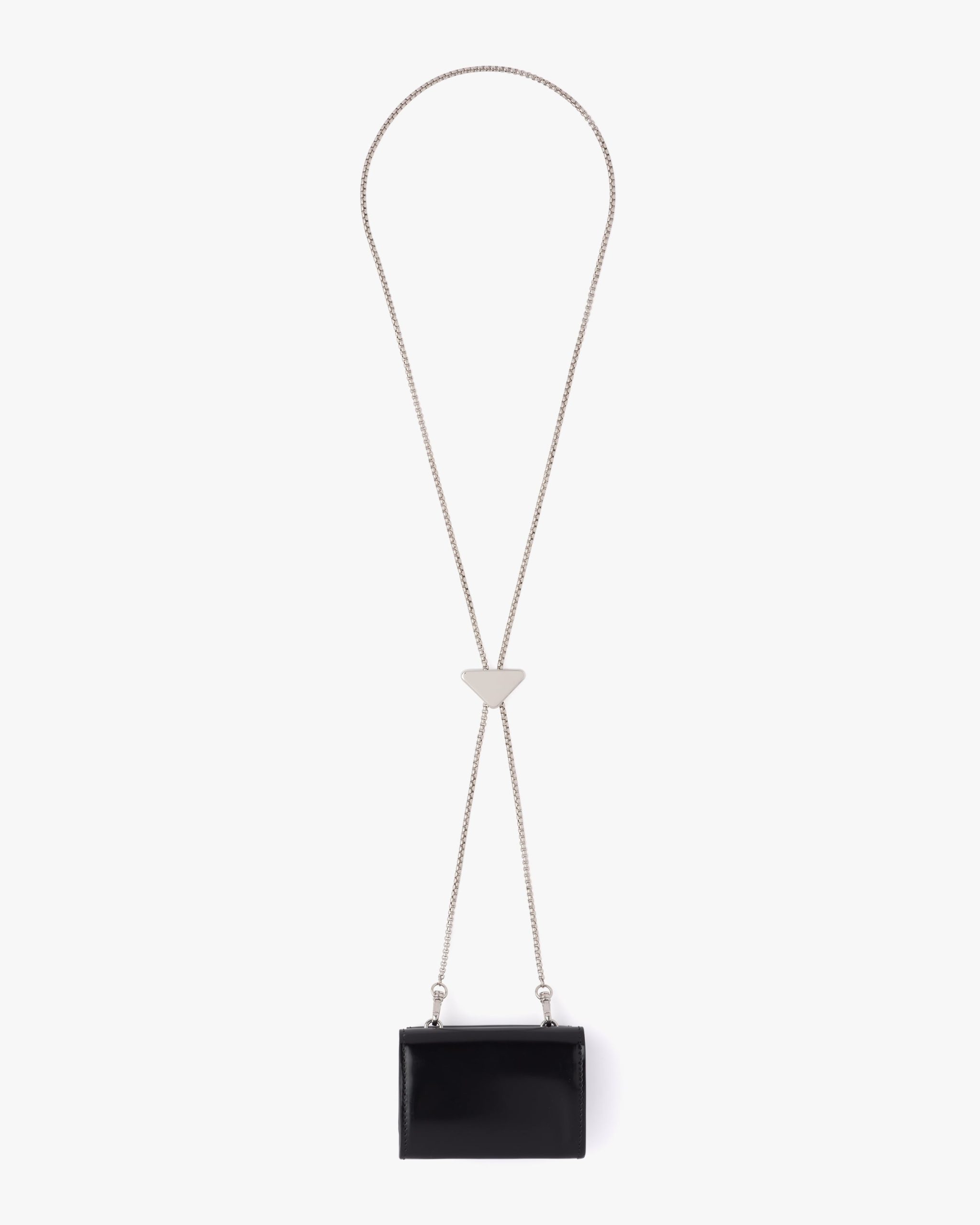 This refined and versatile card holder presents the historic enameled triangle logo2 on the envelope-style flap and as an ornament on the detachable chain. The accessory is made of brushed leather, an iconic material of the brand traditionally tied to the luxury world.