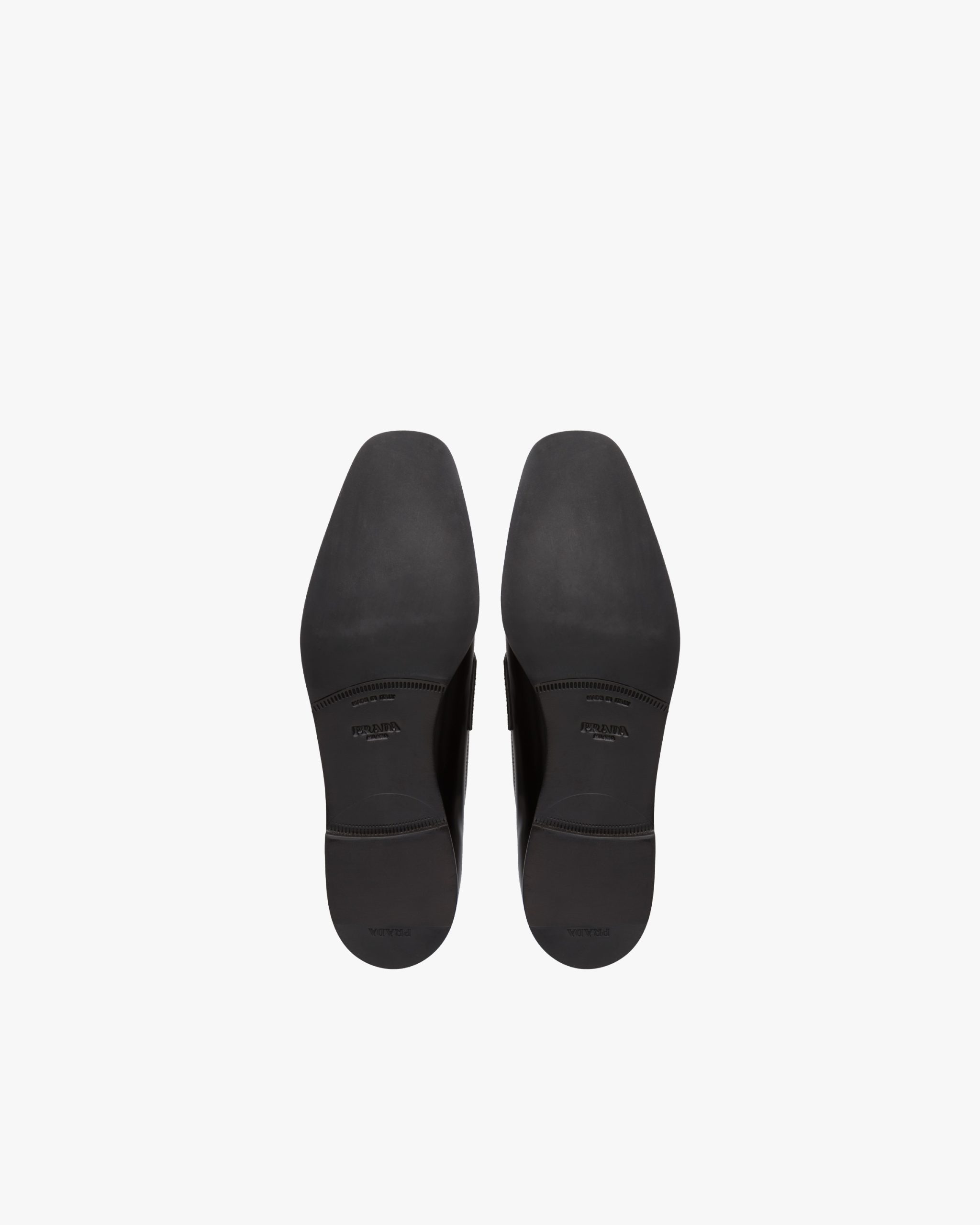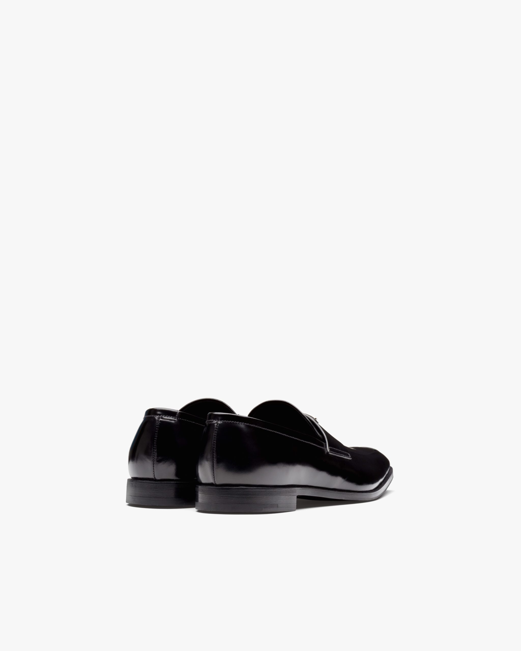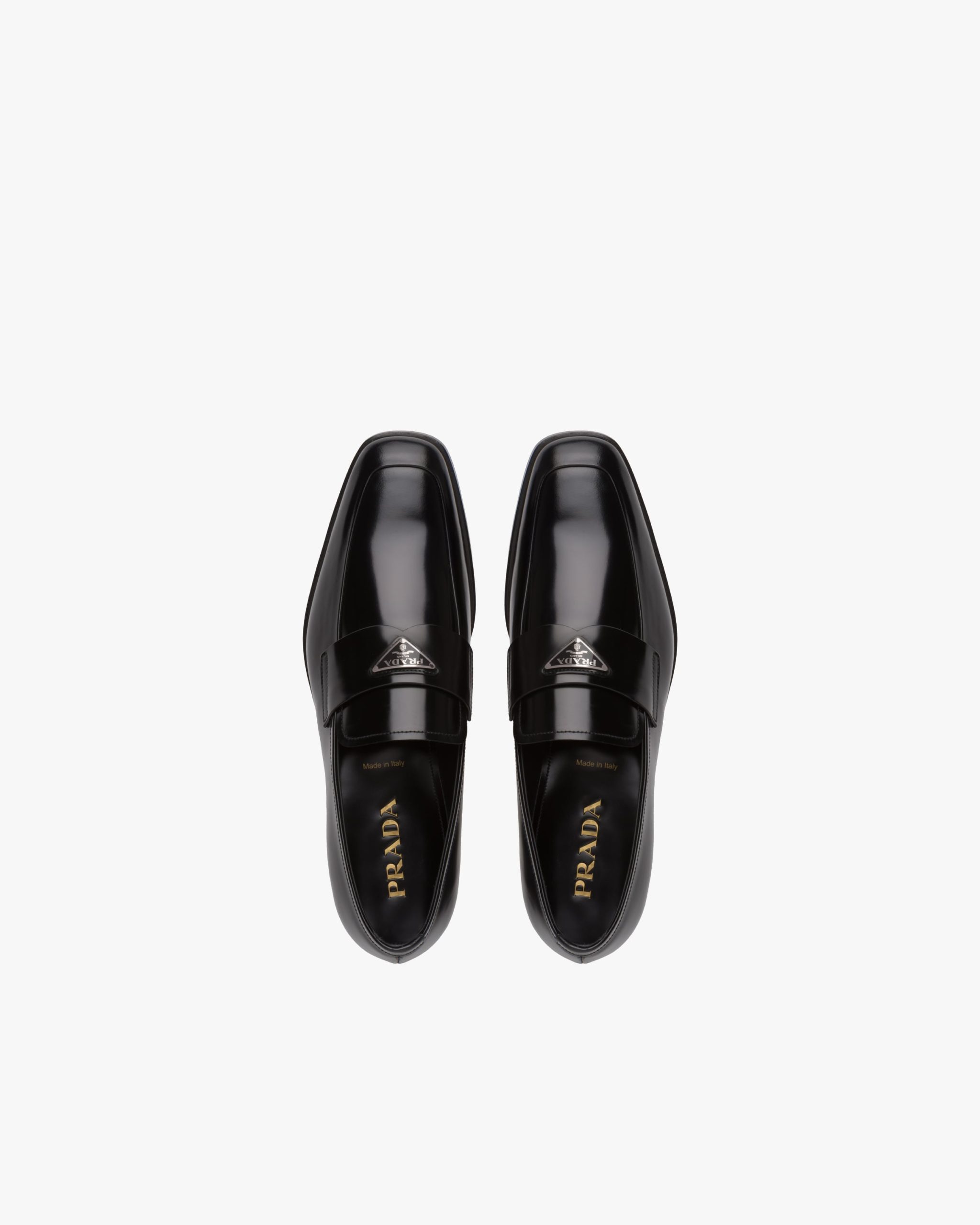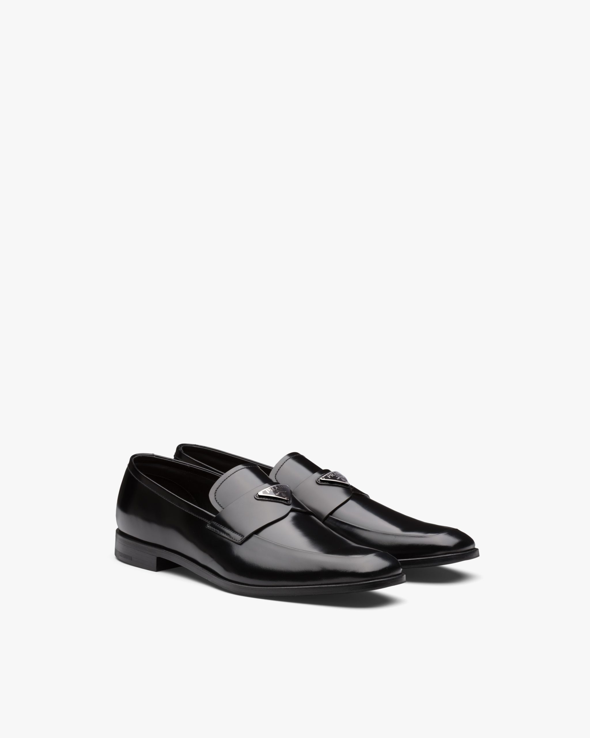 The shiny effect of the brushed leather distinguishes the elegant, masculine design of these loafers. The metal triangle logo2 embellishes the band.