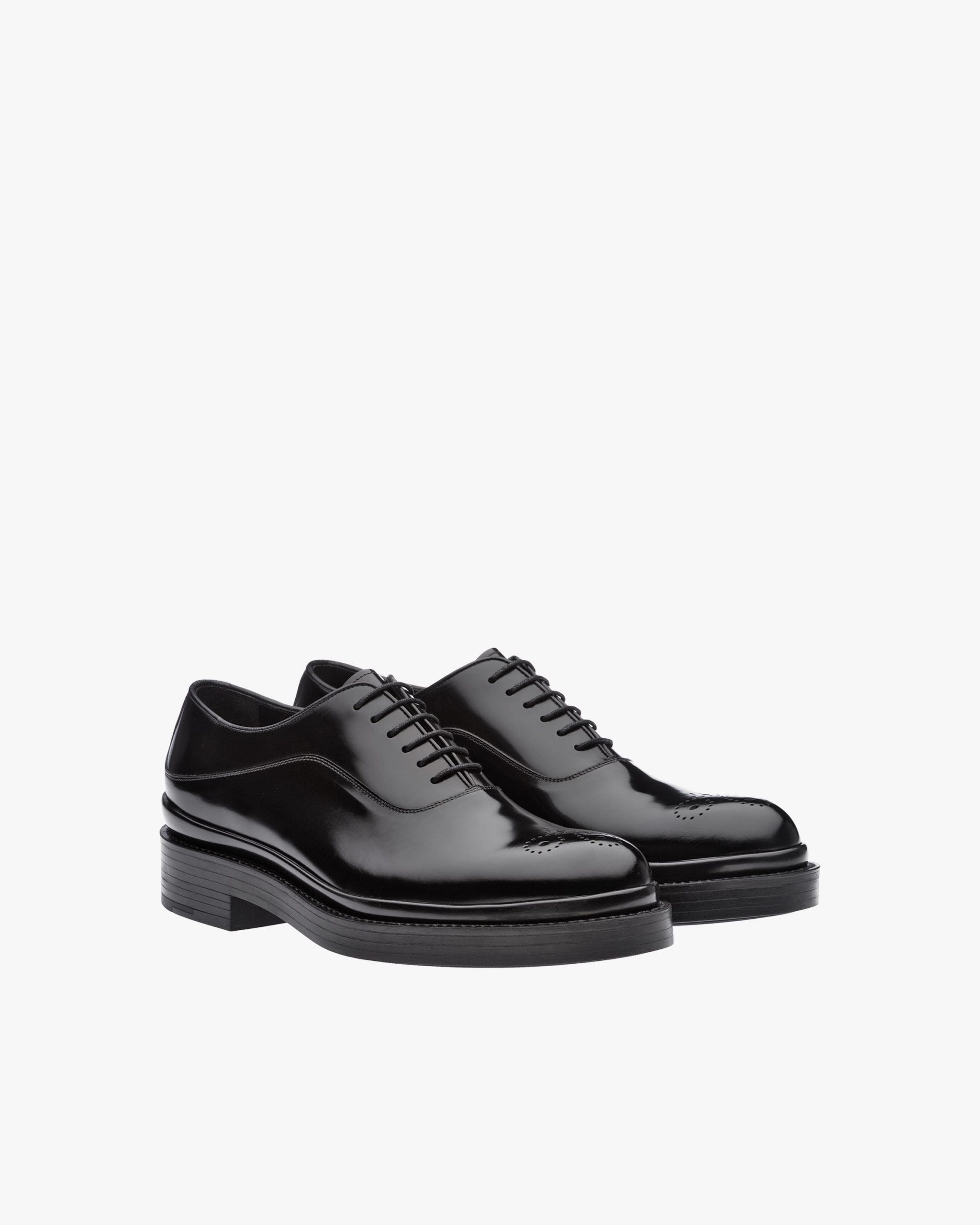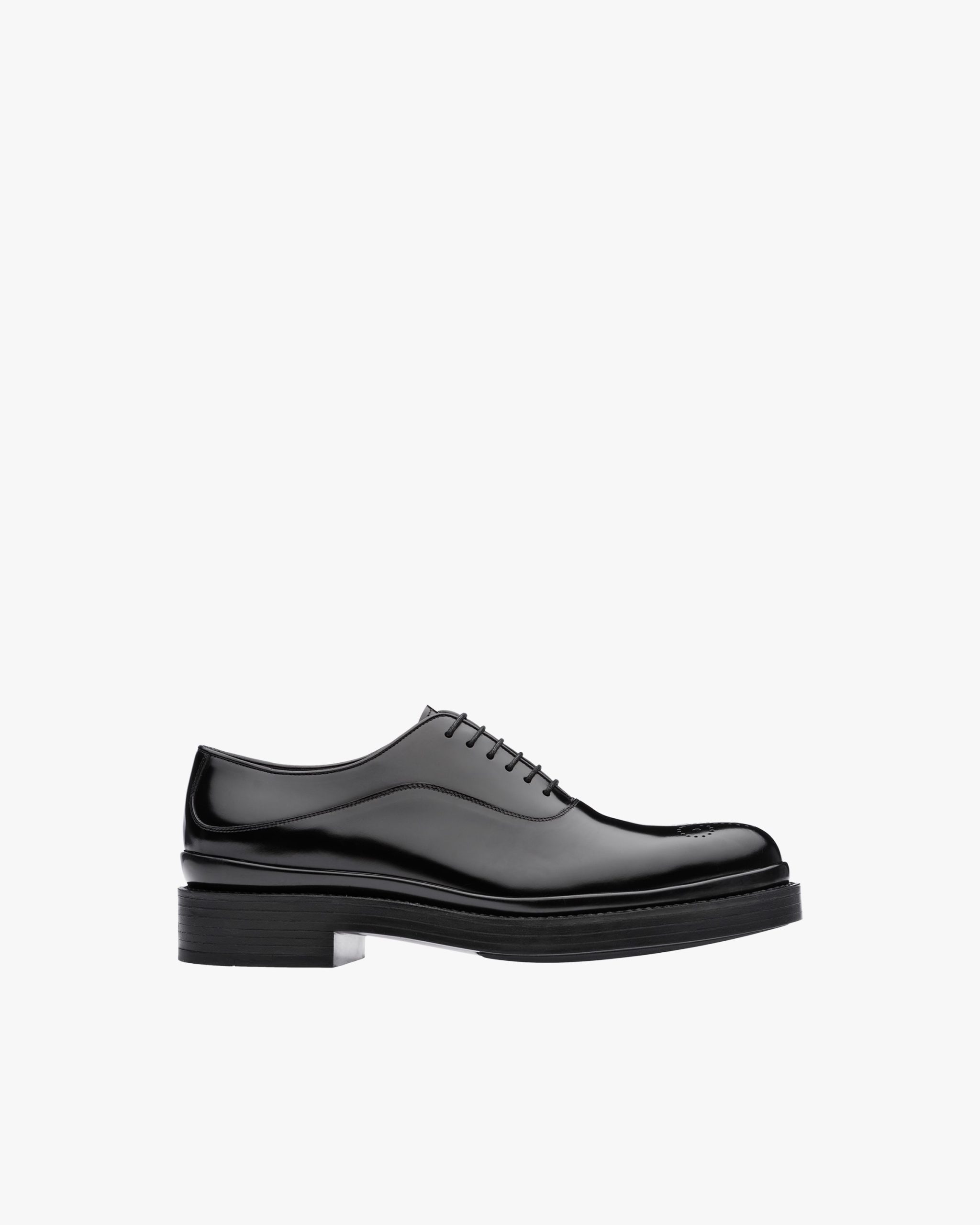 The shiny brushed calf leather accentuates the clean lines of these laced shoes. The perforated motif on the toe and rubber sole give these classic Oxford laced shoes a contemporary touch.