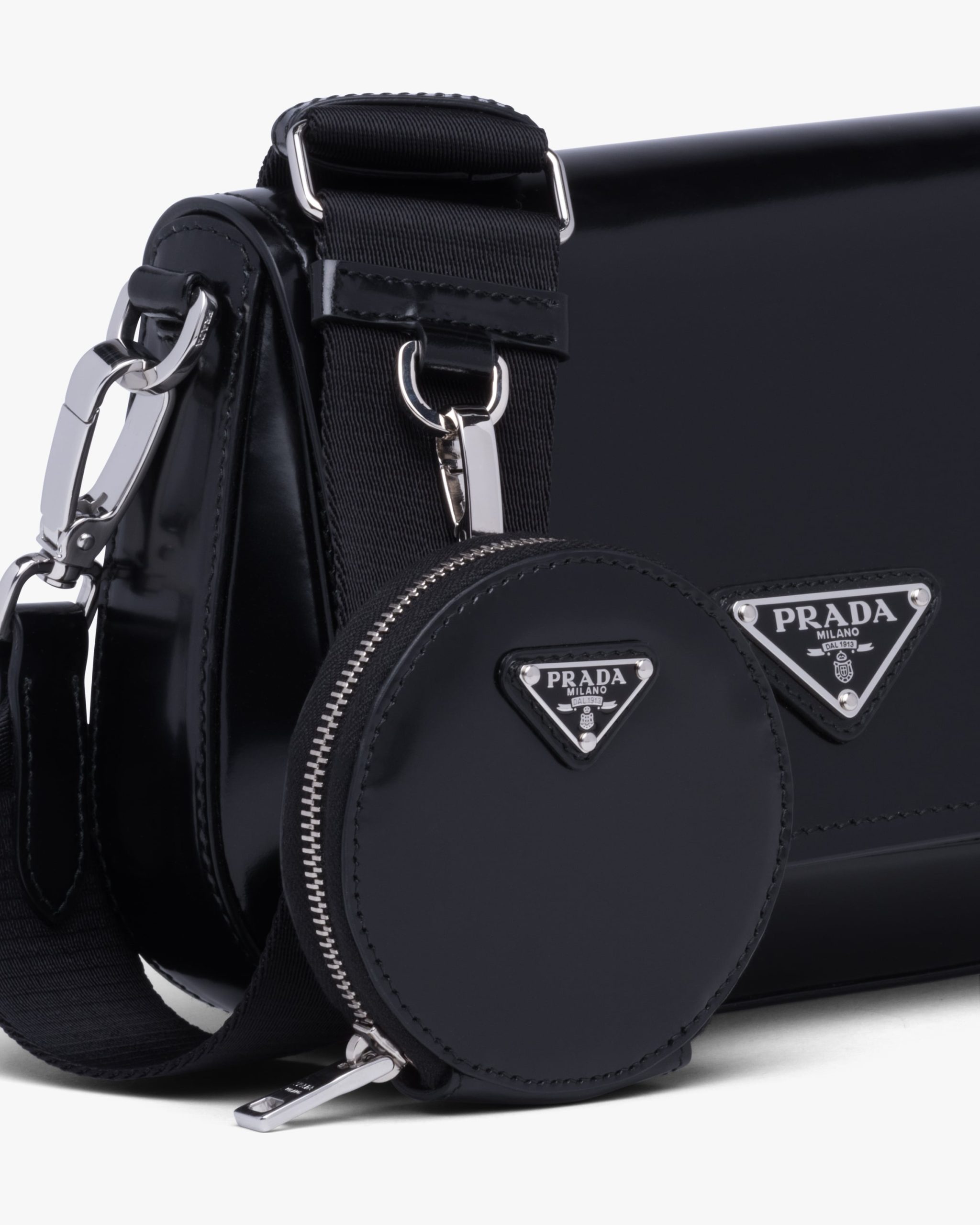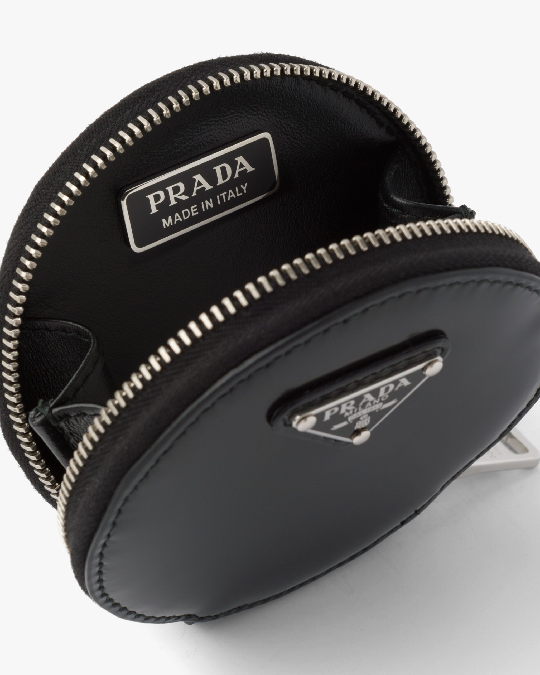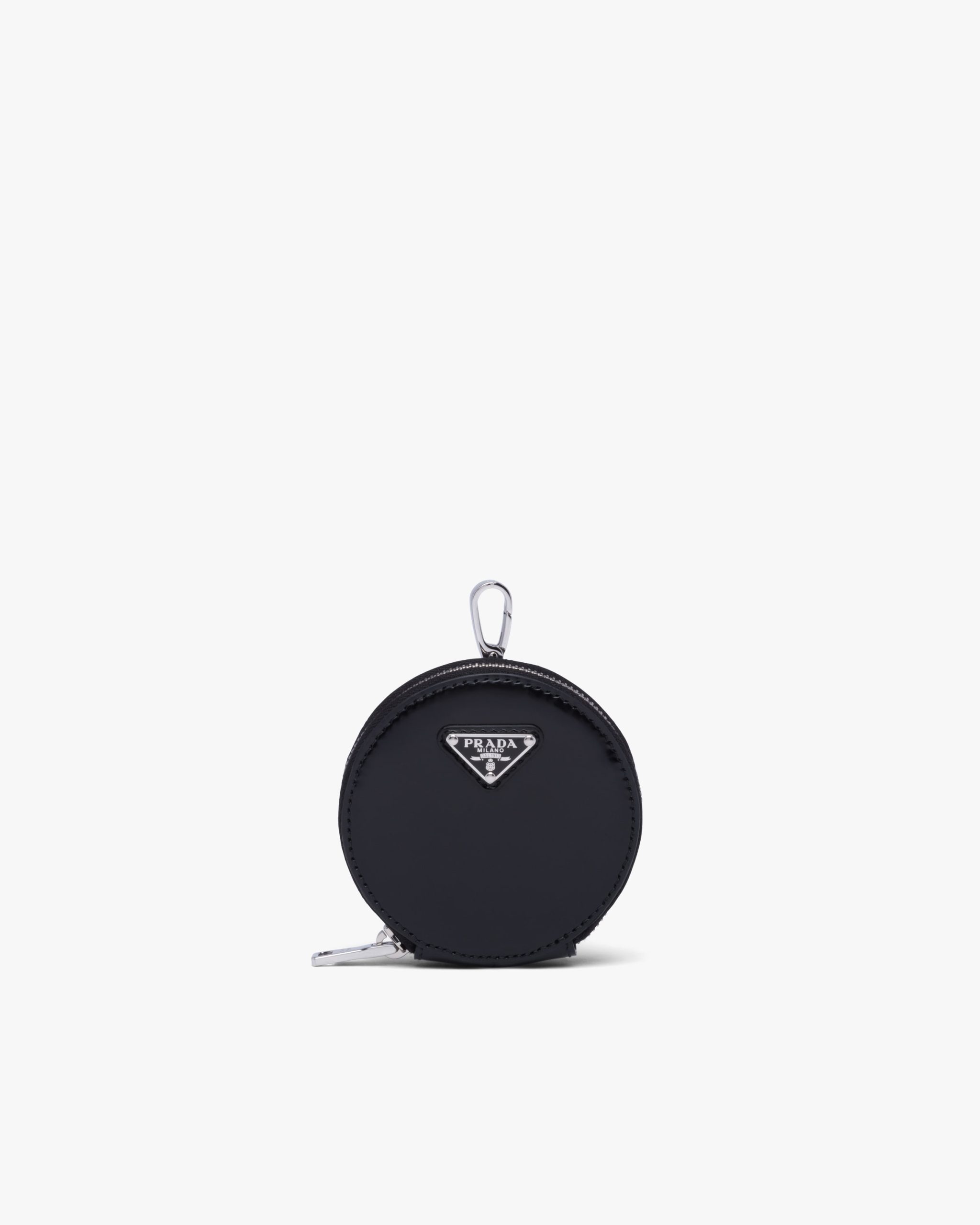 This round mini pouch is made from brushed leather, an exquisite and classic material that Prada has been reinterpreting in unusual designs since the nineties, creating a hybrid result that reflects the dual nature of the brand. The enameled metal triangle logo2 adorns the accessory.