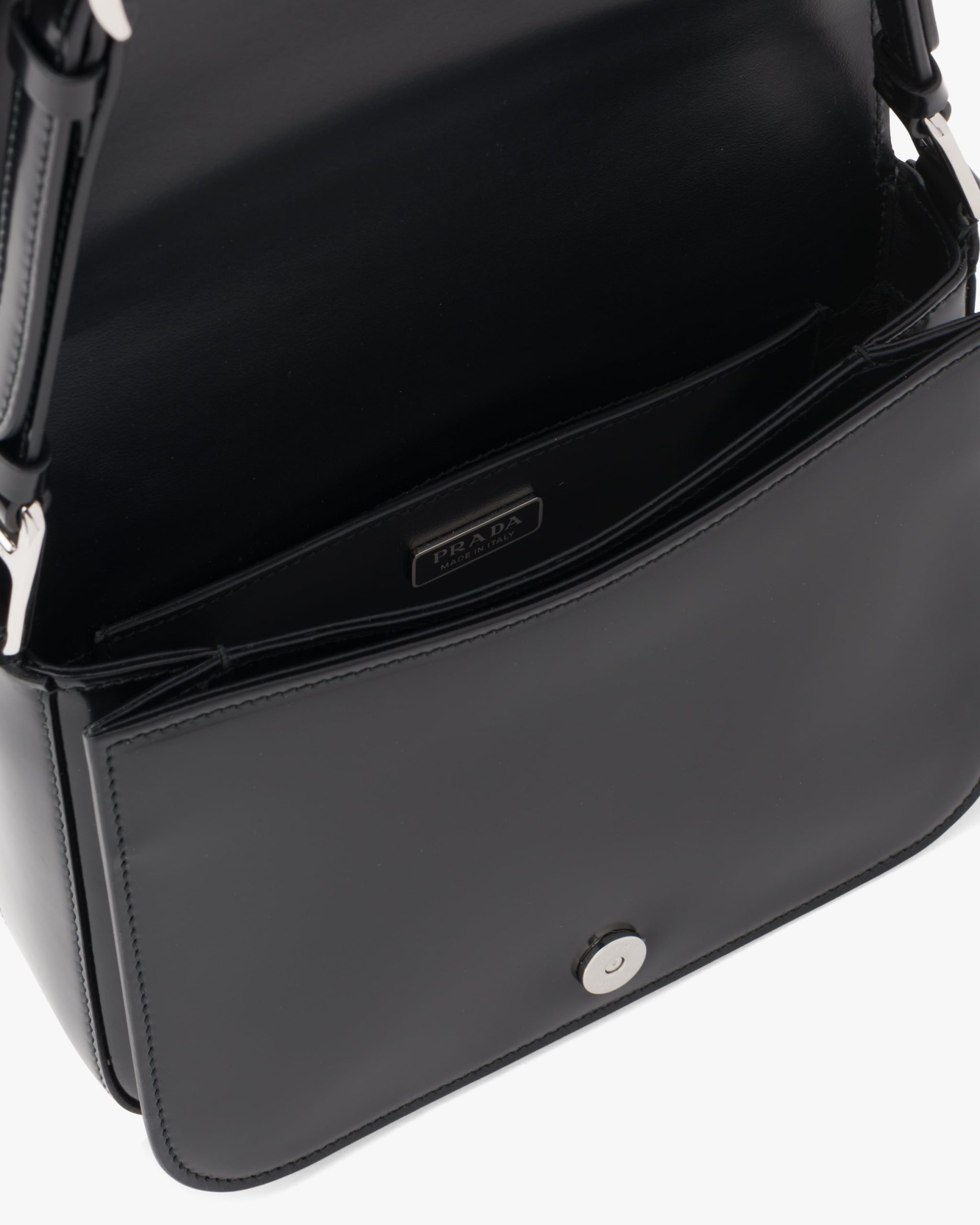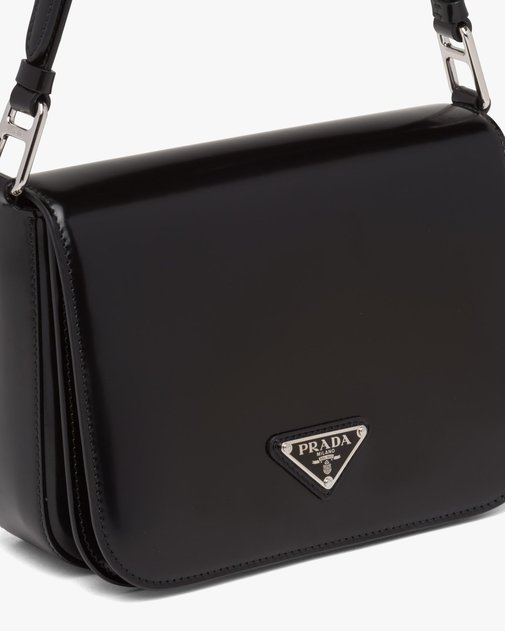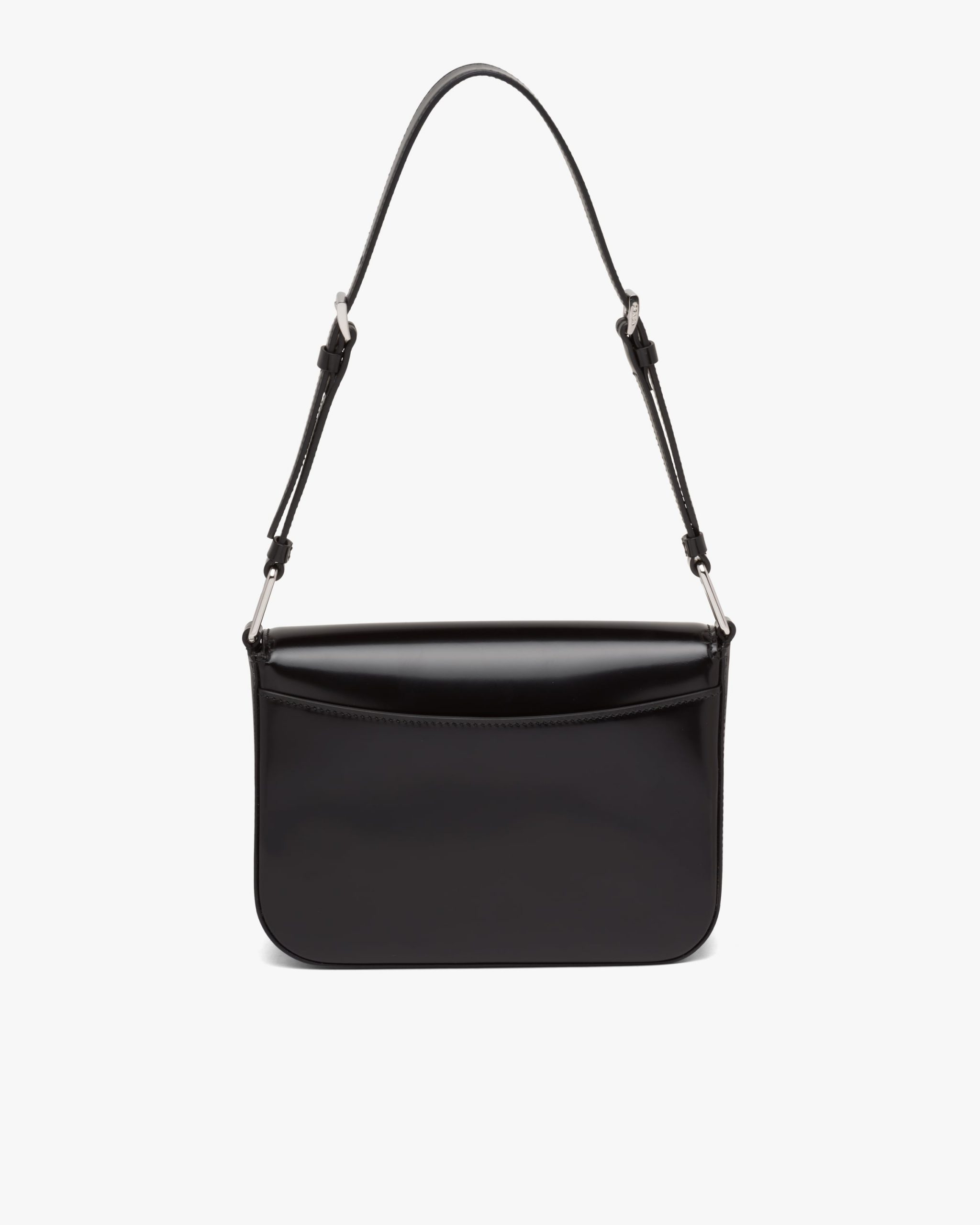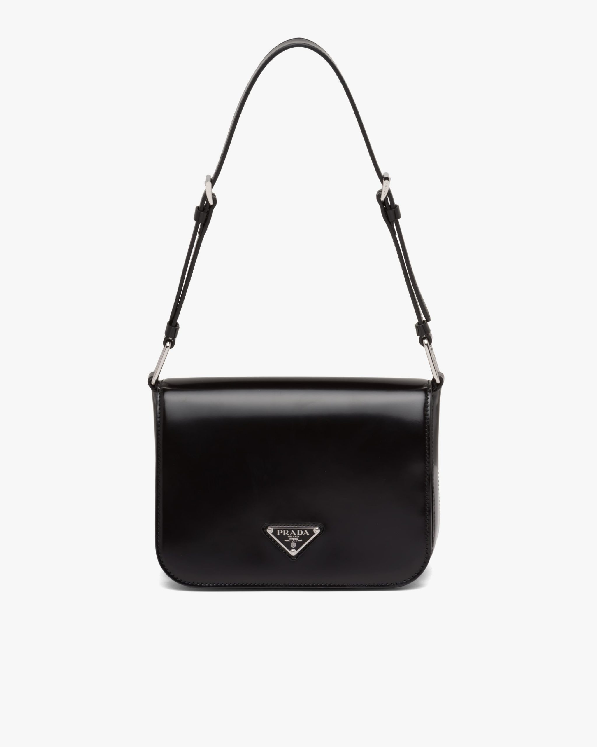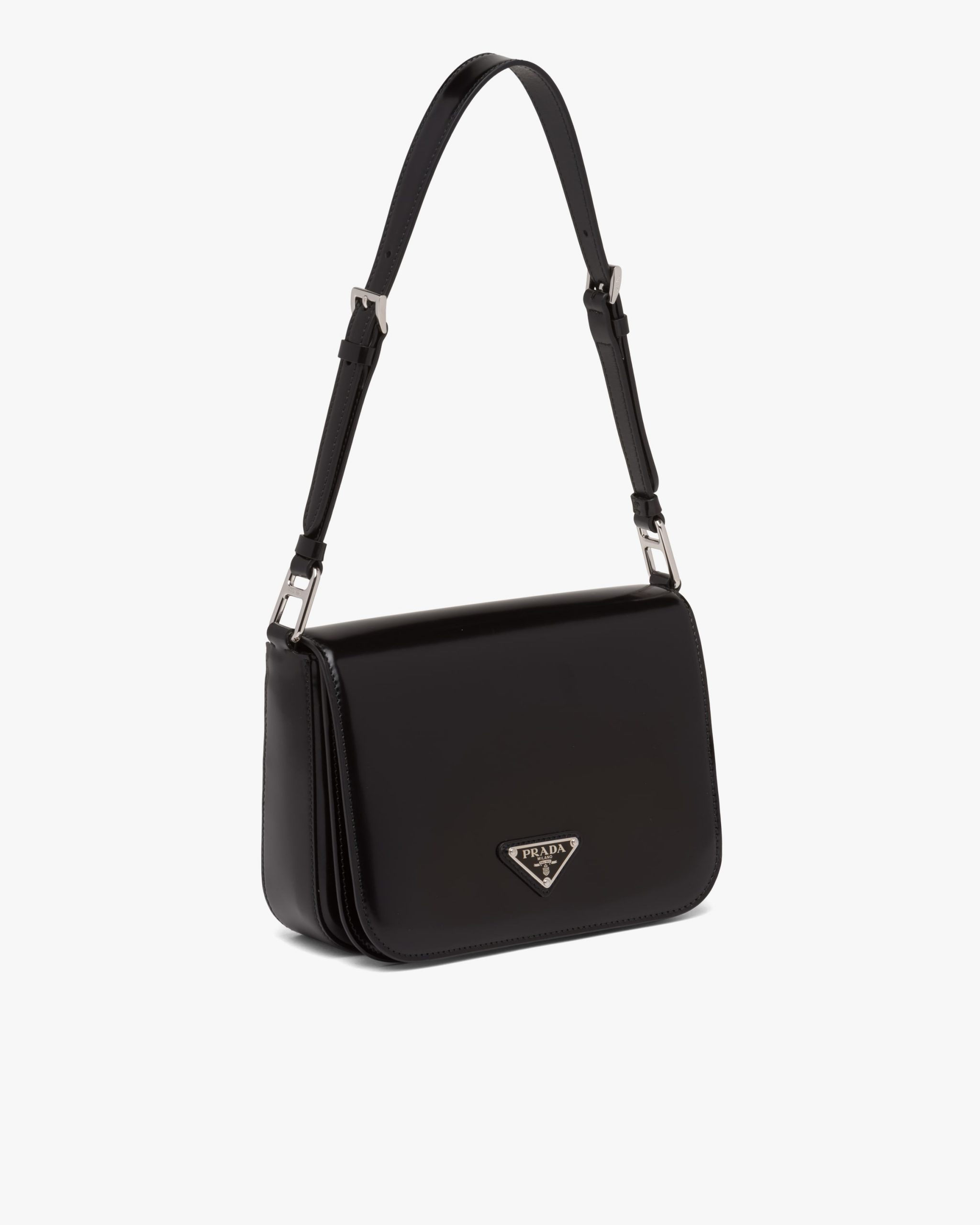Elegance and practicality meet in this bag with a hybrid character that combines sleek and modern lines, functionality, and fine materials. Made of Prada’s iconic brushed leather, a material that is as chameleonic as it is luxurious, this rigid, curvy bag is characterized by its flap closure and leather shoulder strap that is adjustable for wear as a crossbody or shoulder bag. Decorating the flap is the emblematic enameled metal triangle logo2 created by founder Mario Prada and reinvented on contemporary designs.