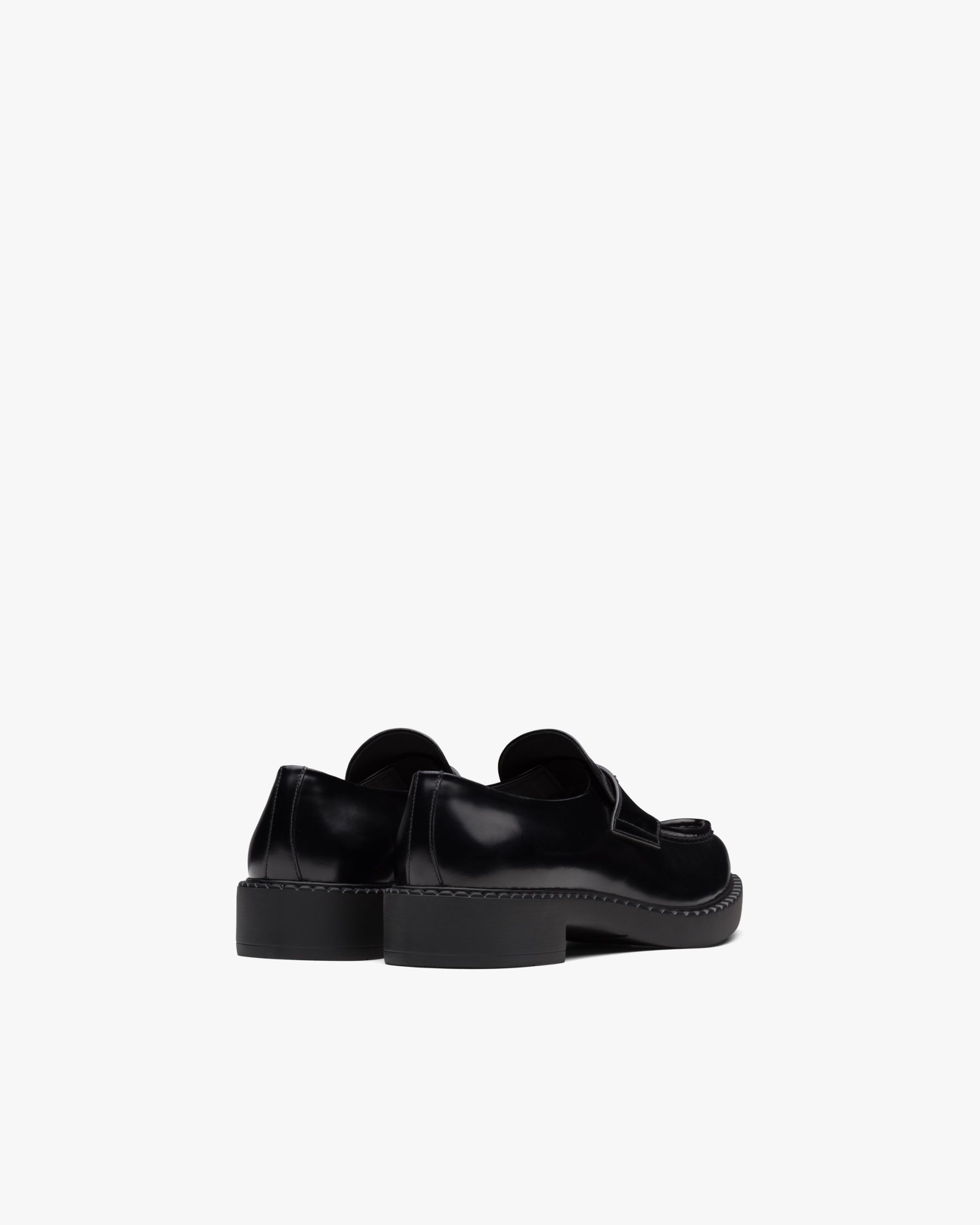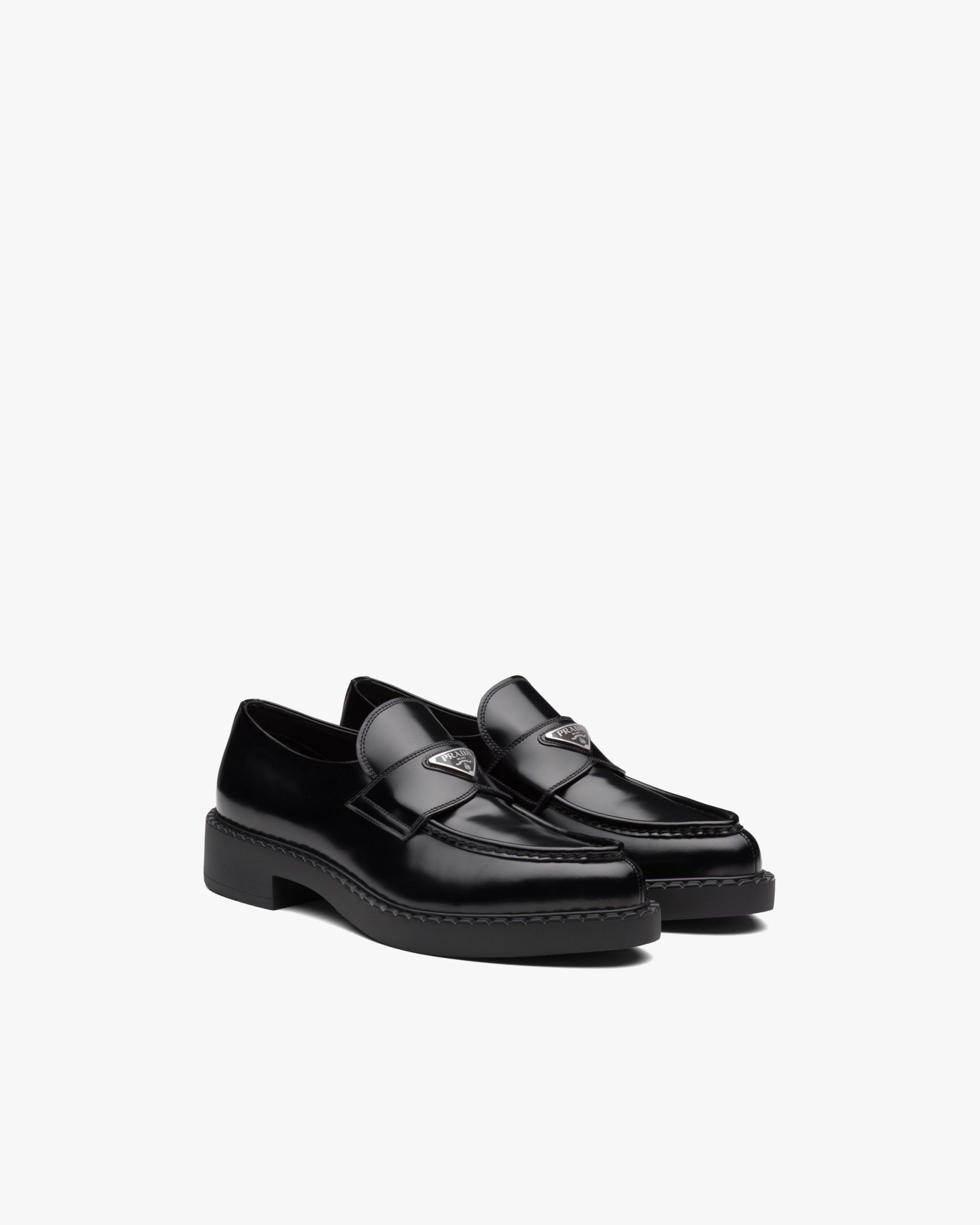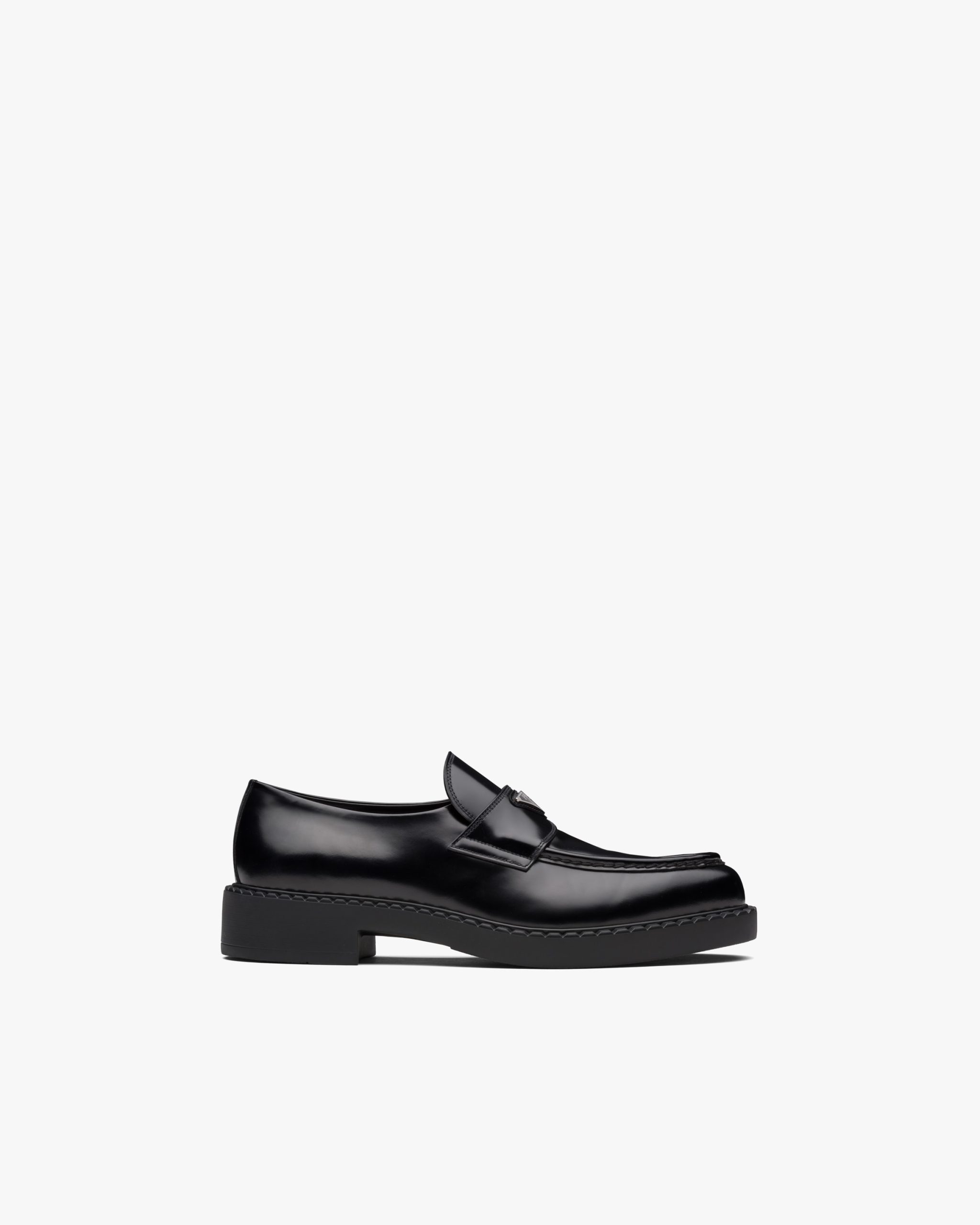 The loafer is restyled with a pointy toe that recalls a Prada archive design. Formal, elegant allure defines the upper that continues the aesthetic of the innovative light sole. Traditionally used in fine classic footwear since the nineties, brushed leather is reinterpreted in Prada collectsions on unexpected designs.
