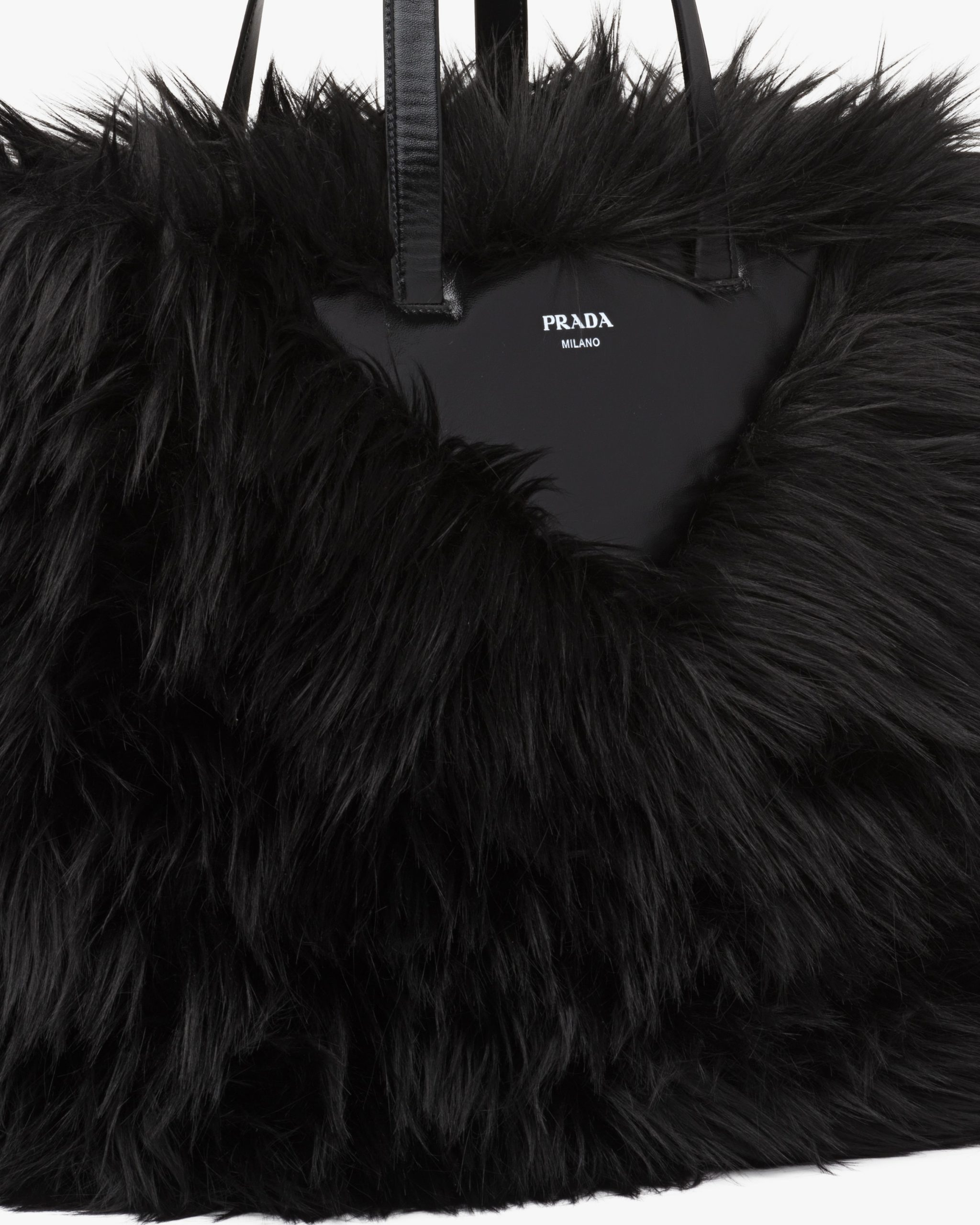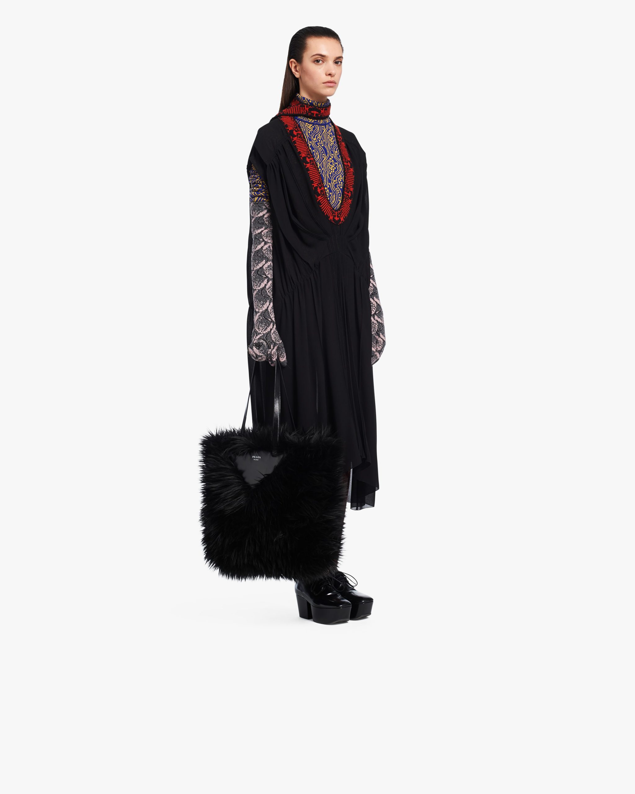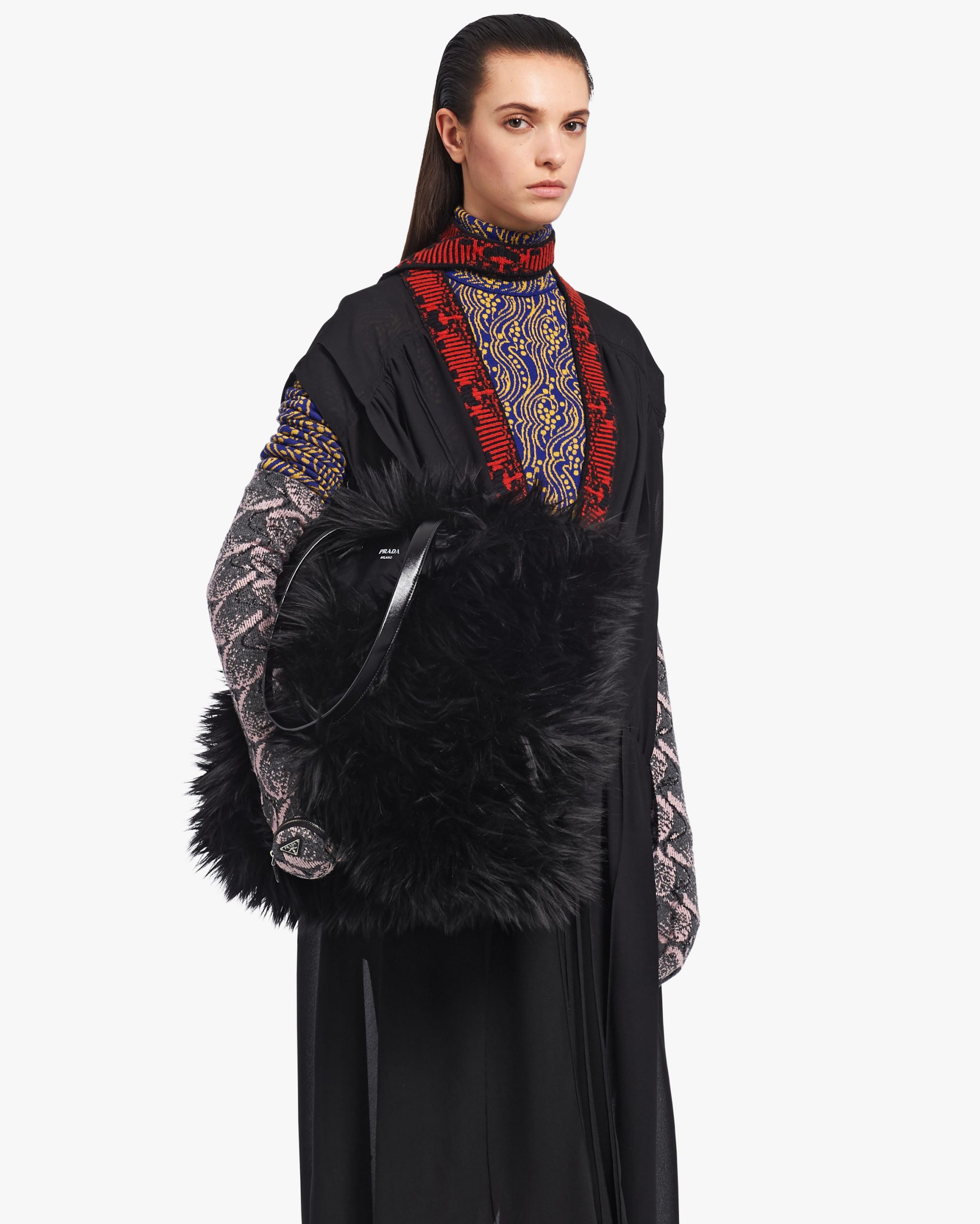 New volumes in soft faux fur fabric characterize this tote bag from the Fall Winter 2021 collectsion where the need for sensations and the pleasure of tactility translate into a panoply of textures and fabrics. The leather triangle with the iconic lettering logo2 that decorates the accessory lengthens to become a double handle.