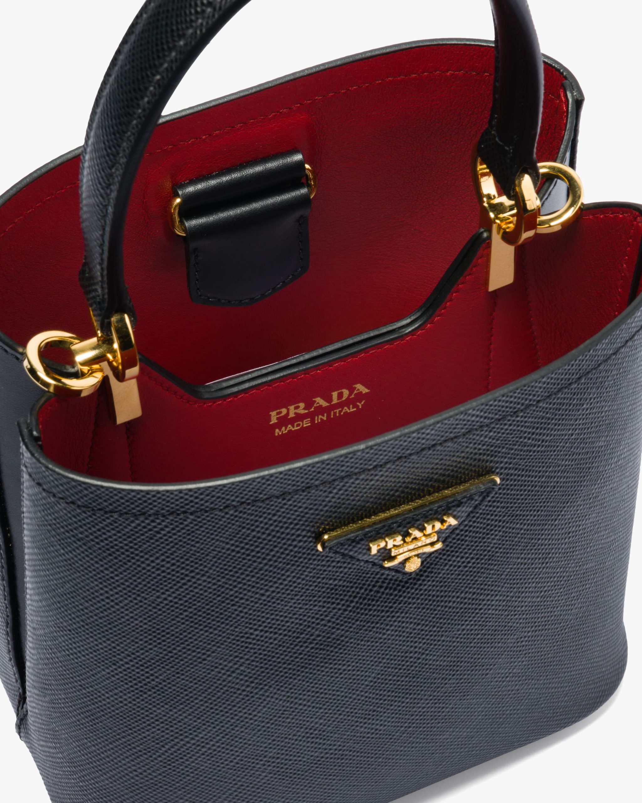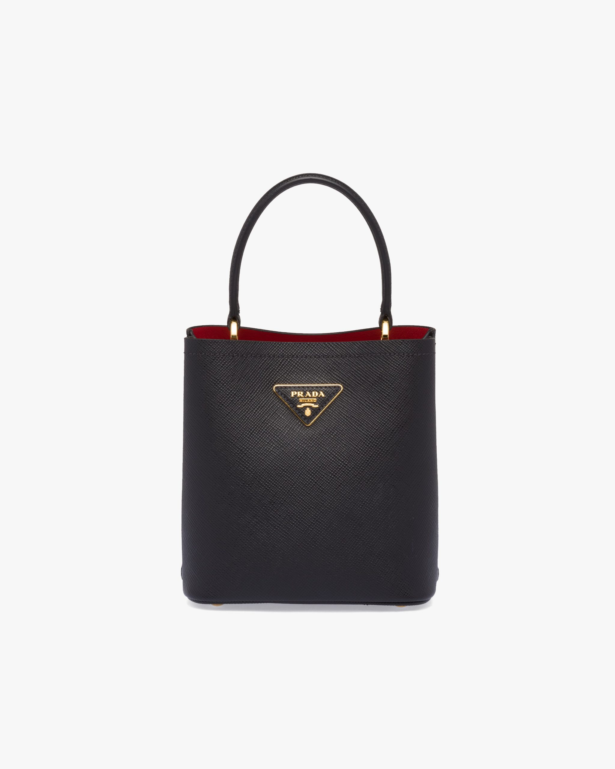 The iconic texture of Saffiano leather characterizes the compact Prada Panier bag. The elegant design of the bag with single handle is distinguished for the strap closure on the top.