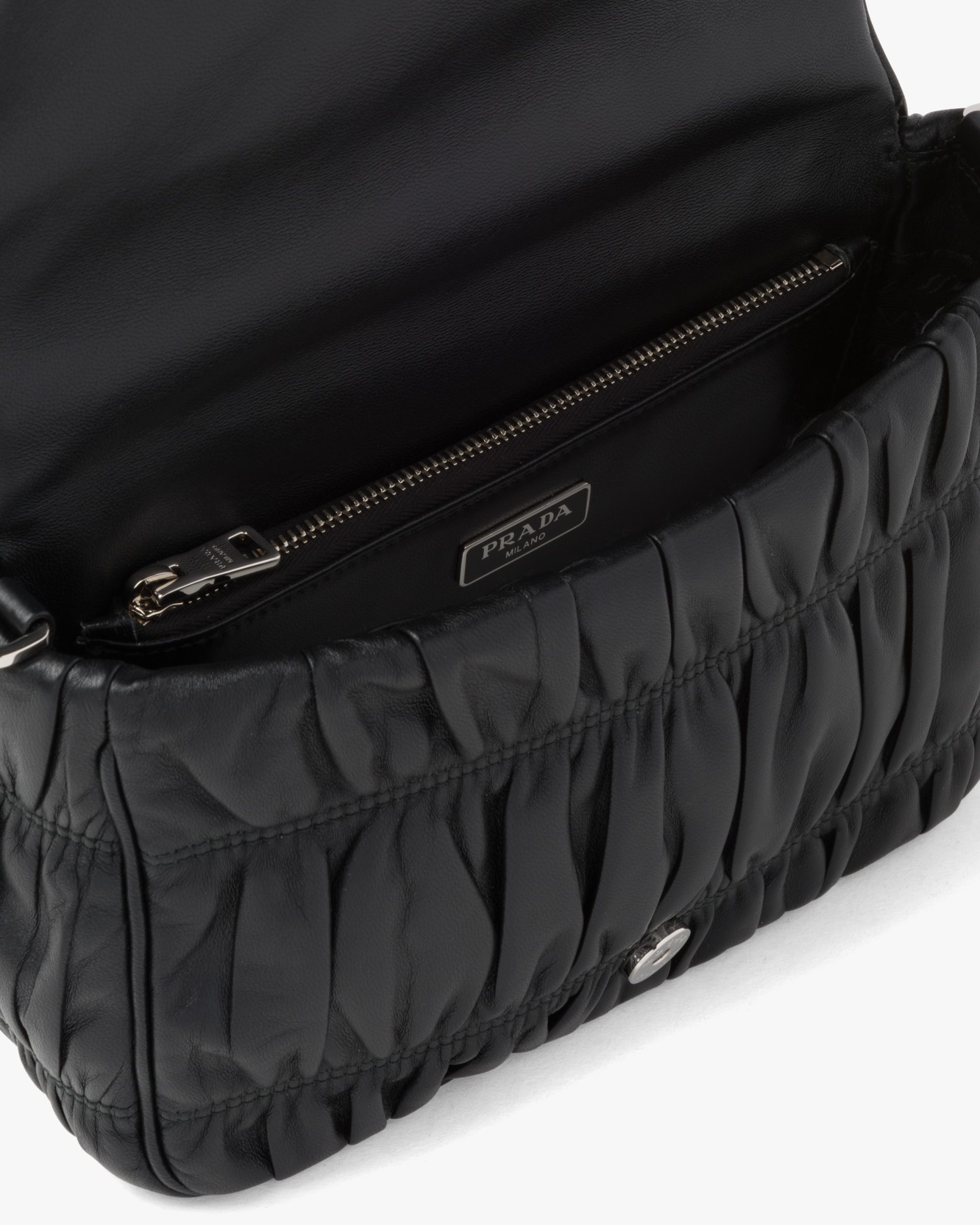 Leather is reinterpreted from a feminine perspective with a luxurious gaufr? embossed pattern. This shoulder bag with a modern, versatile design comes with a chain handle and detachable shoulder strap so it can be worn different ways. A leather mini-pouch, a recurring element of Prada collectsions, completes the design.