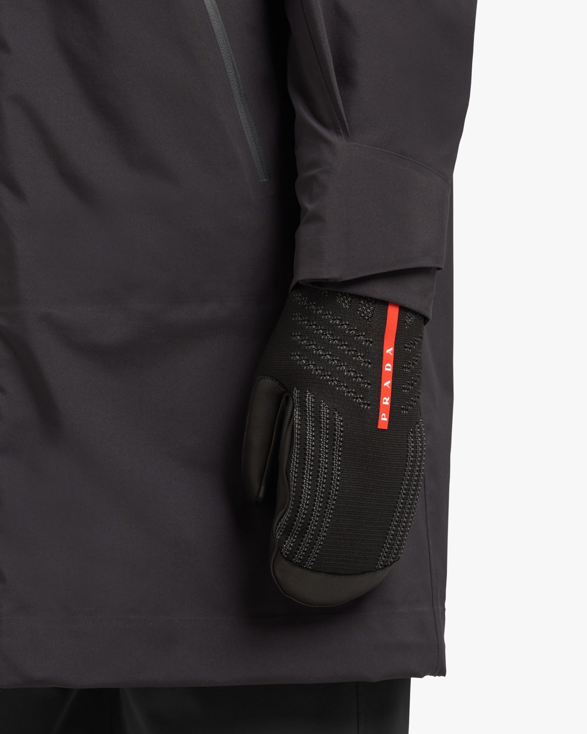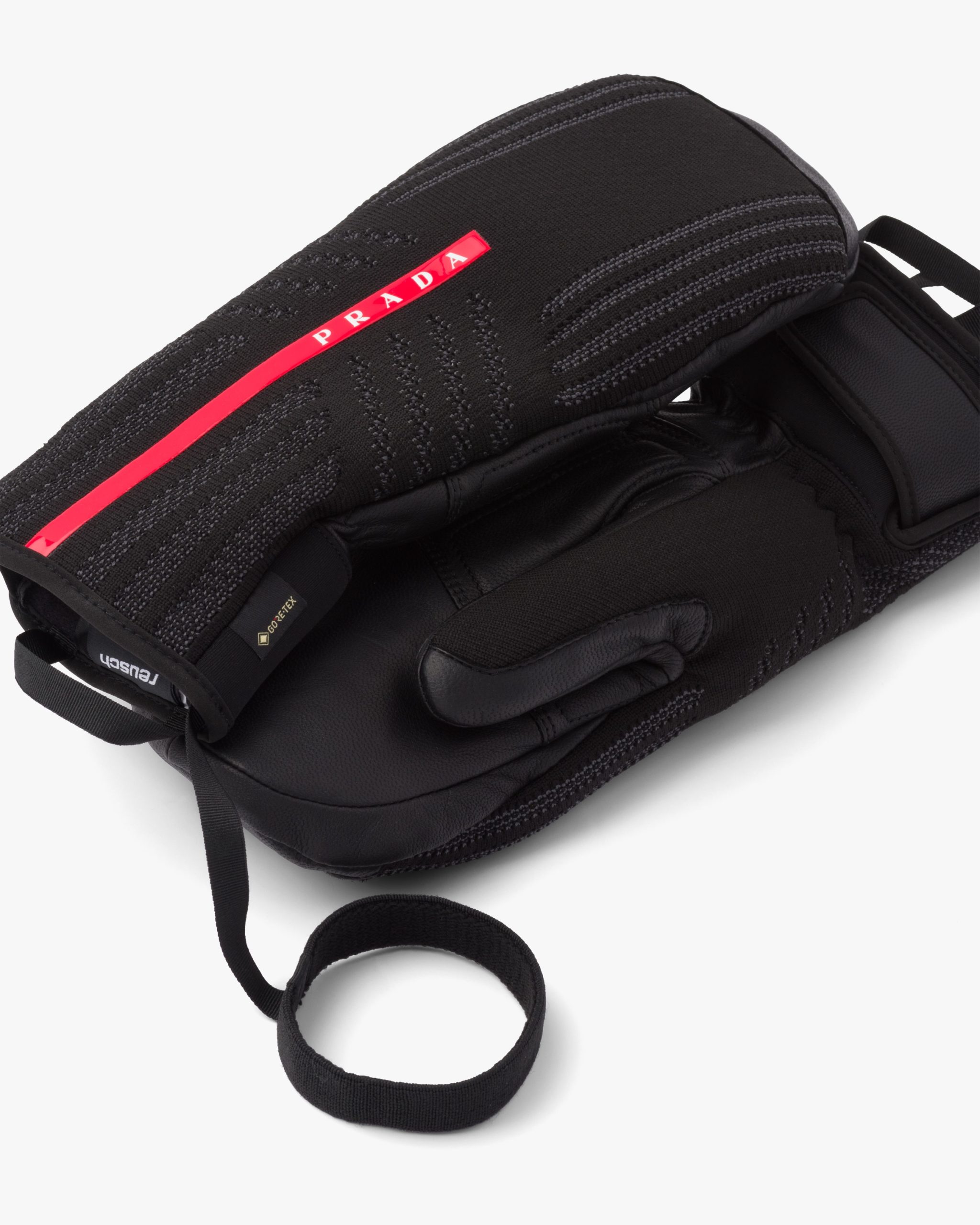 These three-dimensional knit mittens with a modern, functional design are decorated with the Prada Linea Rossa logo2. The water-repellent, seamless knit back of the glove is like a second skin and is combined with a resistant goat leather palm and a waterproof, windproof GORE-TEX? membrane.
