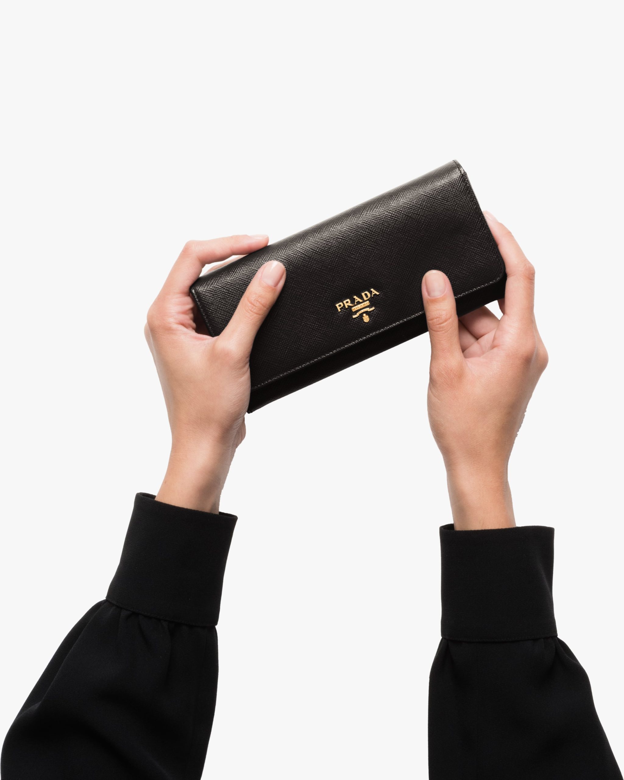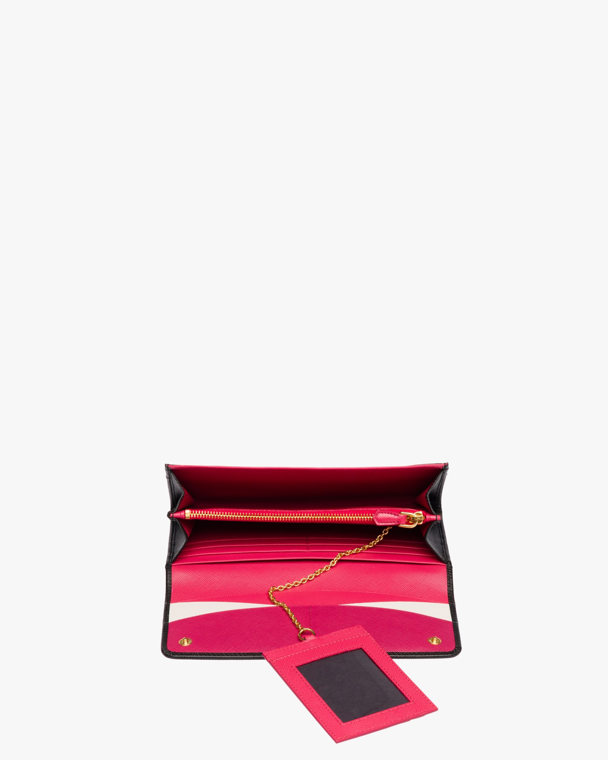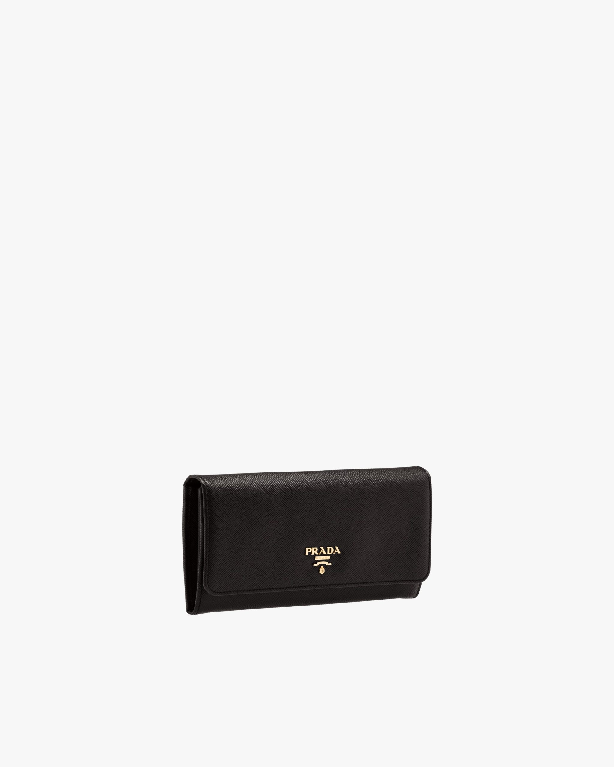 A Saffiano leather flap wallet with gold-finish Prada lettering. The monotone exterior hides multi-colored leather lining inside, as well as various compartments, pockets and an extractable badge holder.