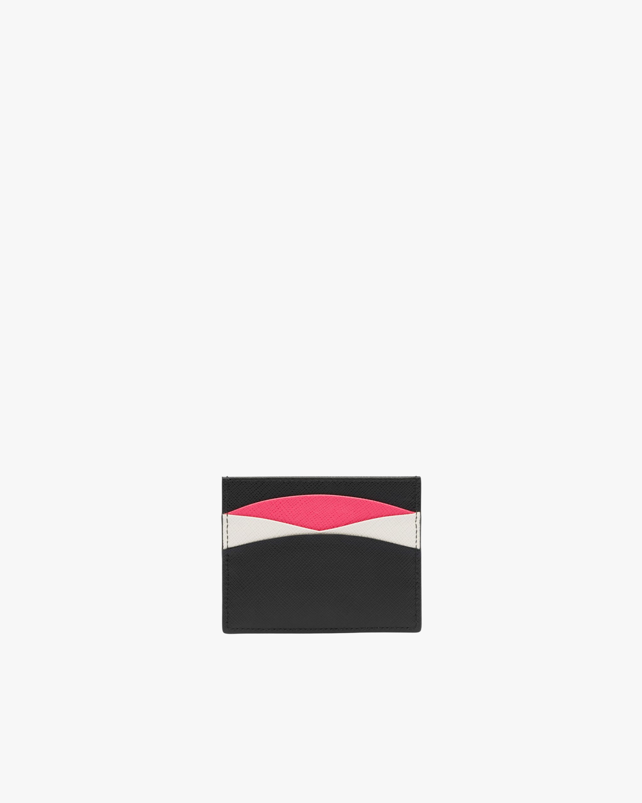 A sophisticated design with curved lines defines the multicolored Saffiano leather credit card holder. Practicality is ensured by the fabric-lined center pocket and card slots.