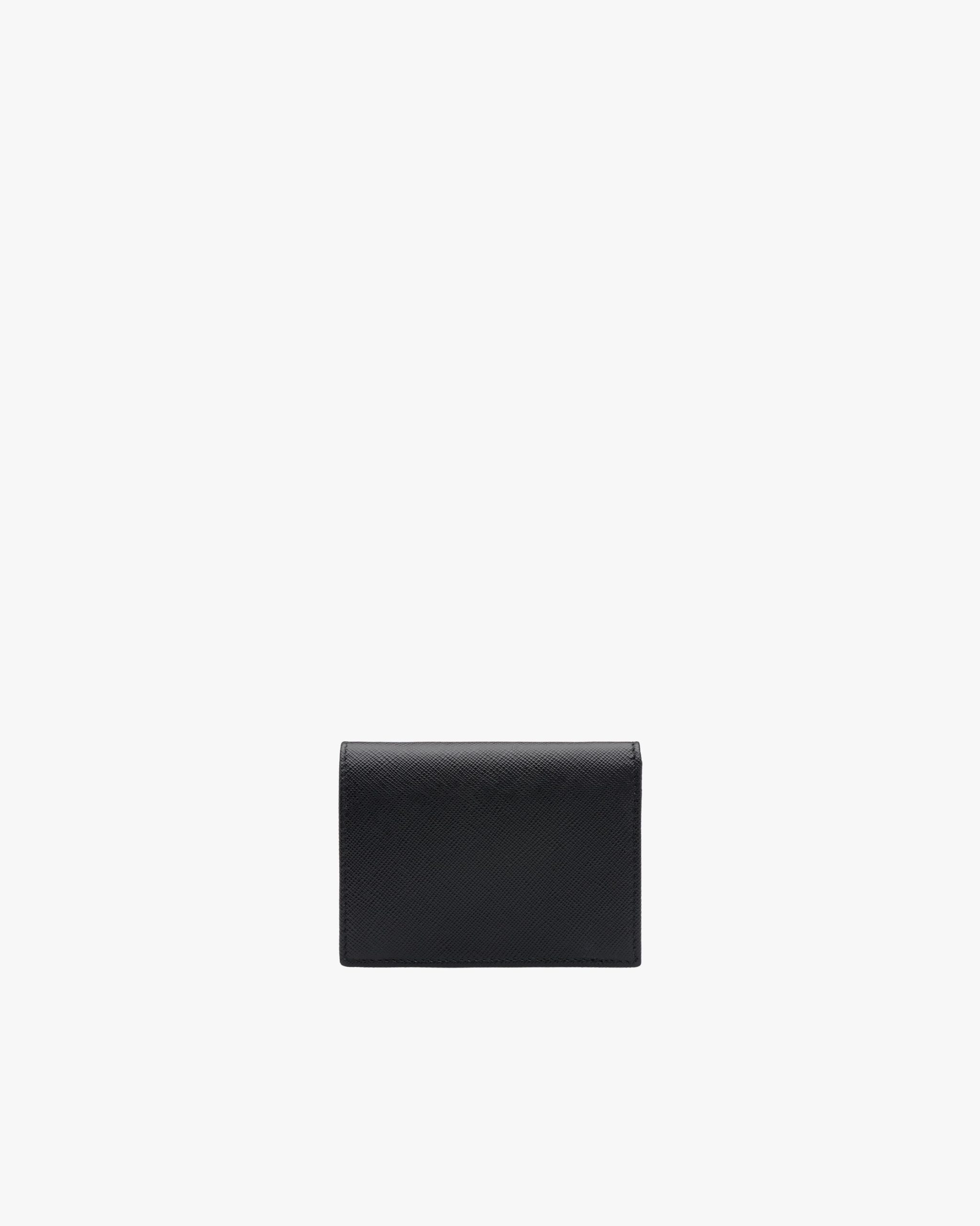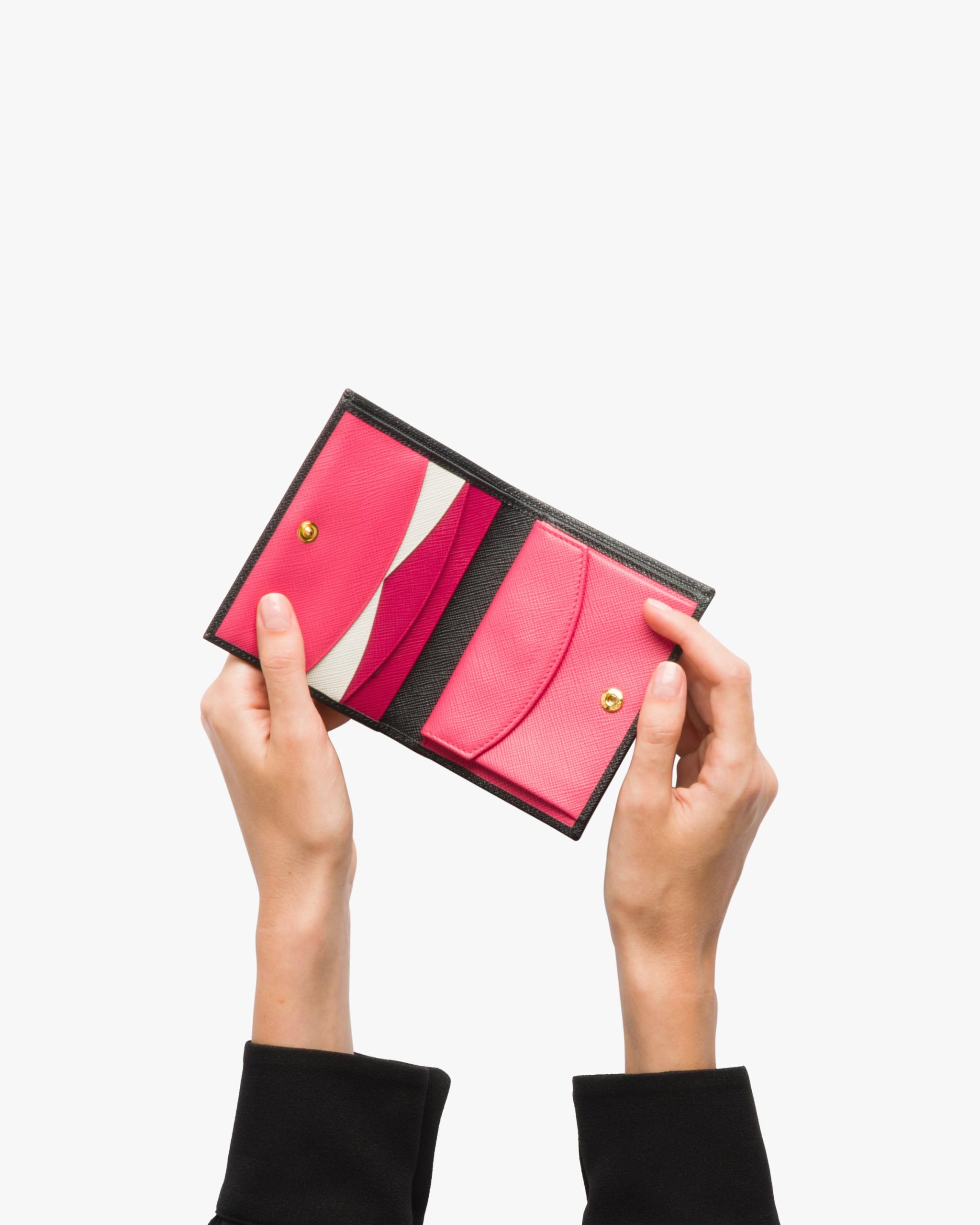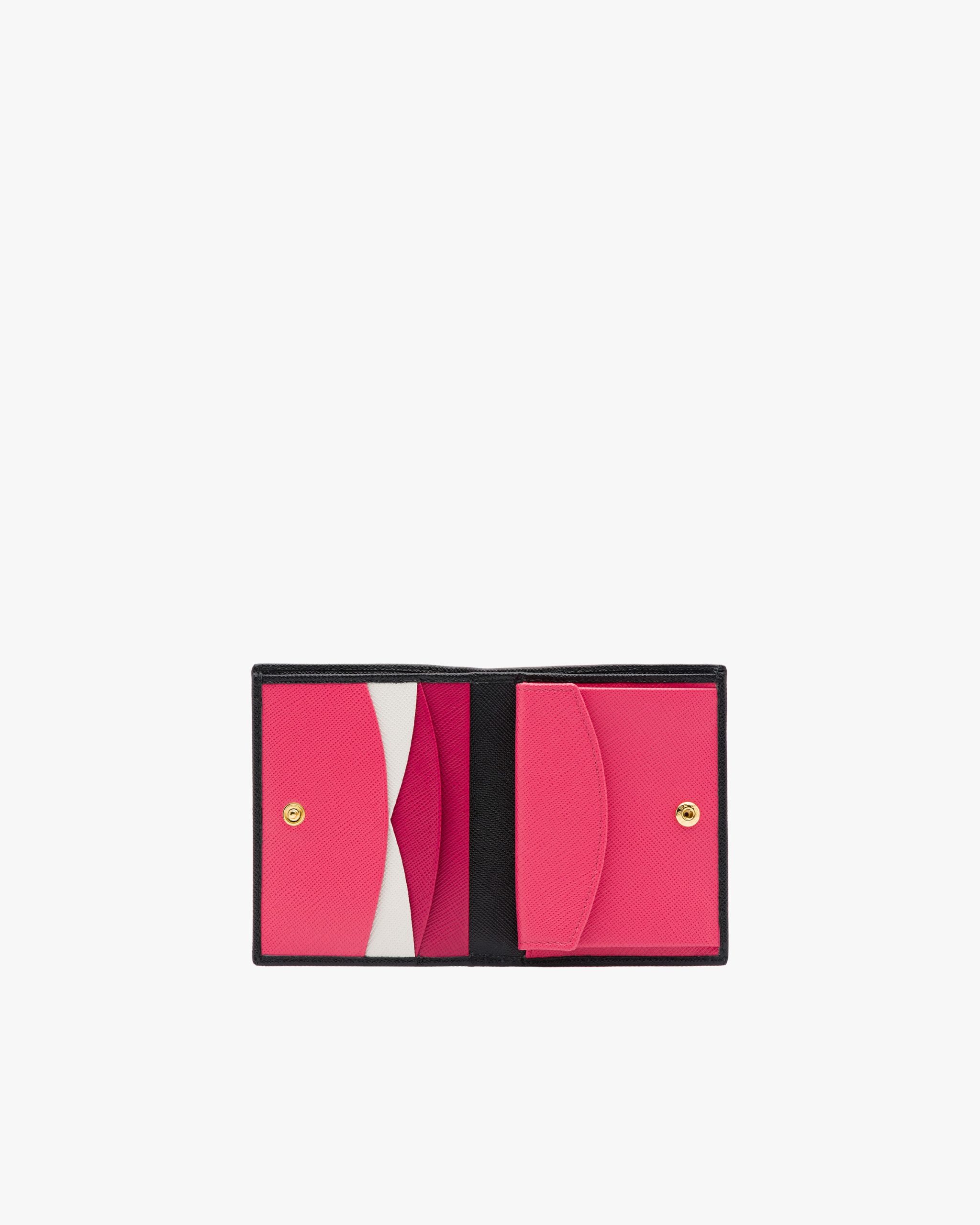 A Saffiano leather bi-fold wallet embellished with gold-toned Prada lettering. The snap closure reveals card slots, a bill compartment and coin compartment, all decorated with a colorful design.