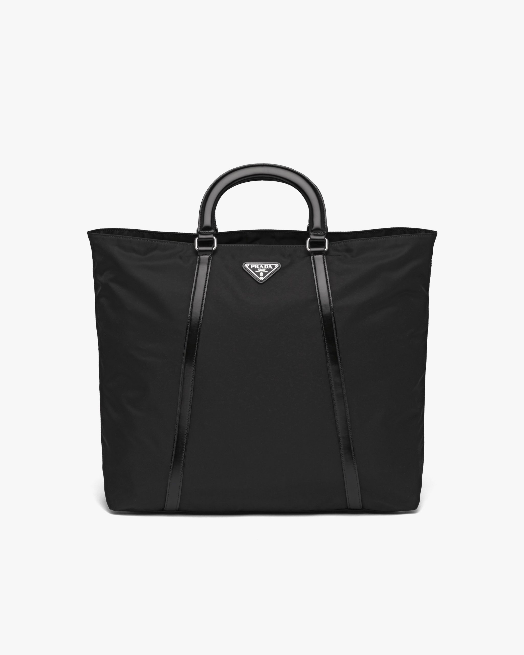 Saffiano leather details accent this large tote bag designed with a double handle and detachable shoulder strap that lets it be worn in different ways. First introduced to the luxury world by Prada, nylon exemplifies the spirit of contradiction that is inherent in the fabric of the brand.