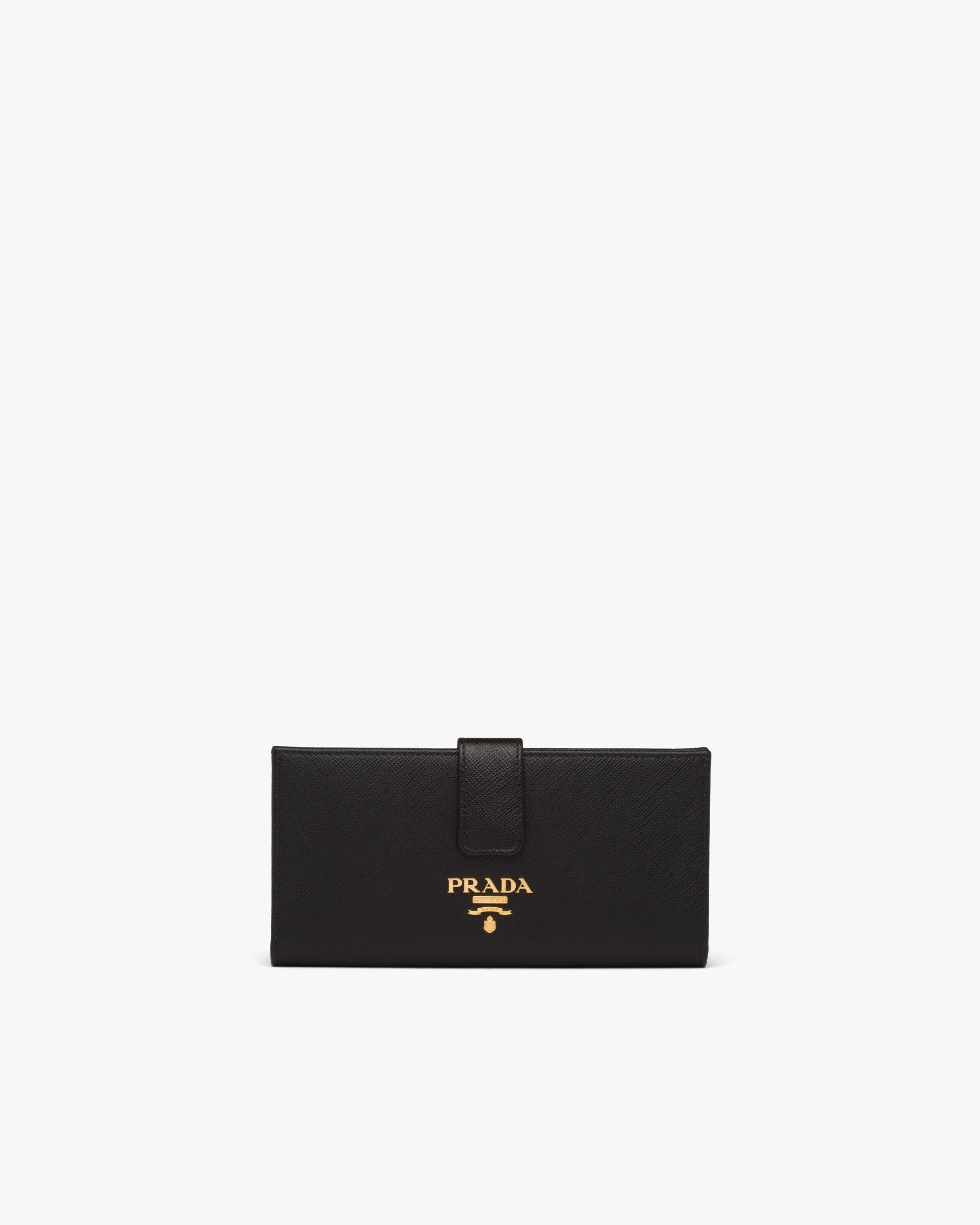 The wallet is made of Saffiano, an iconic Prada material: calf leather of the highest quality, defined by a crosshatch texture and a waxed finish. The lettering logo2 decorates the accessory.
