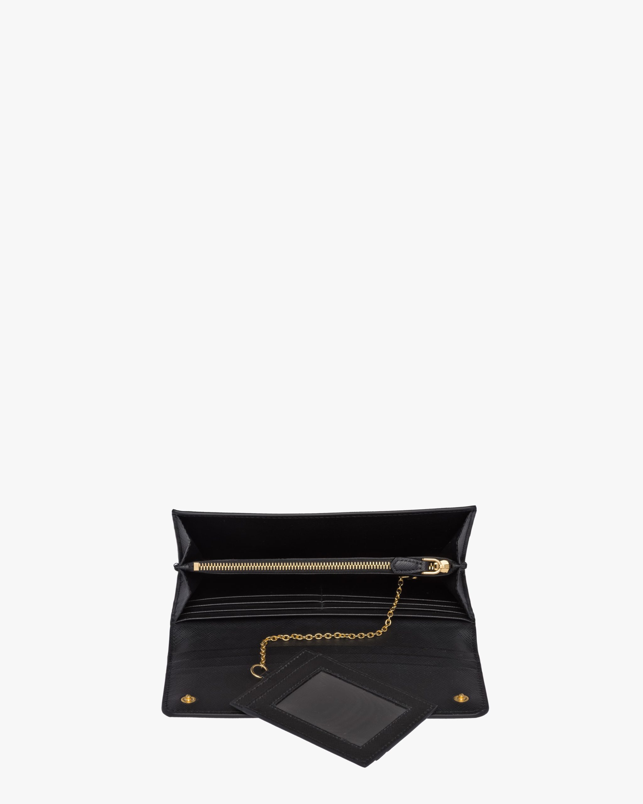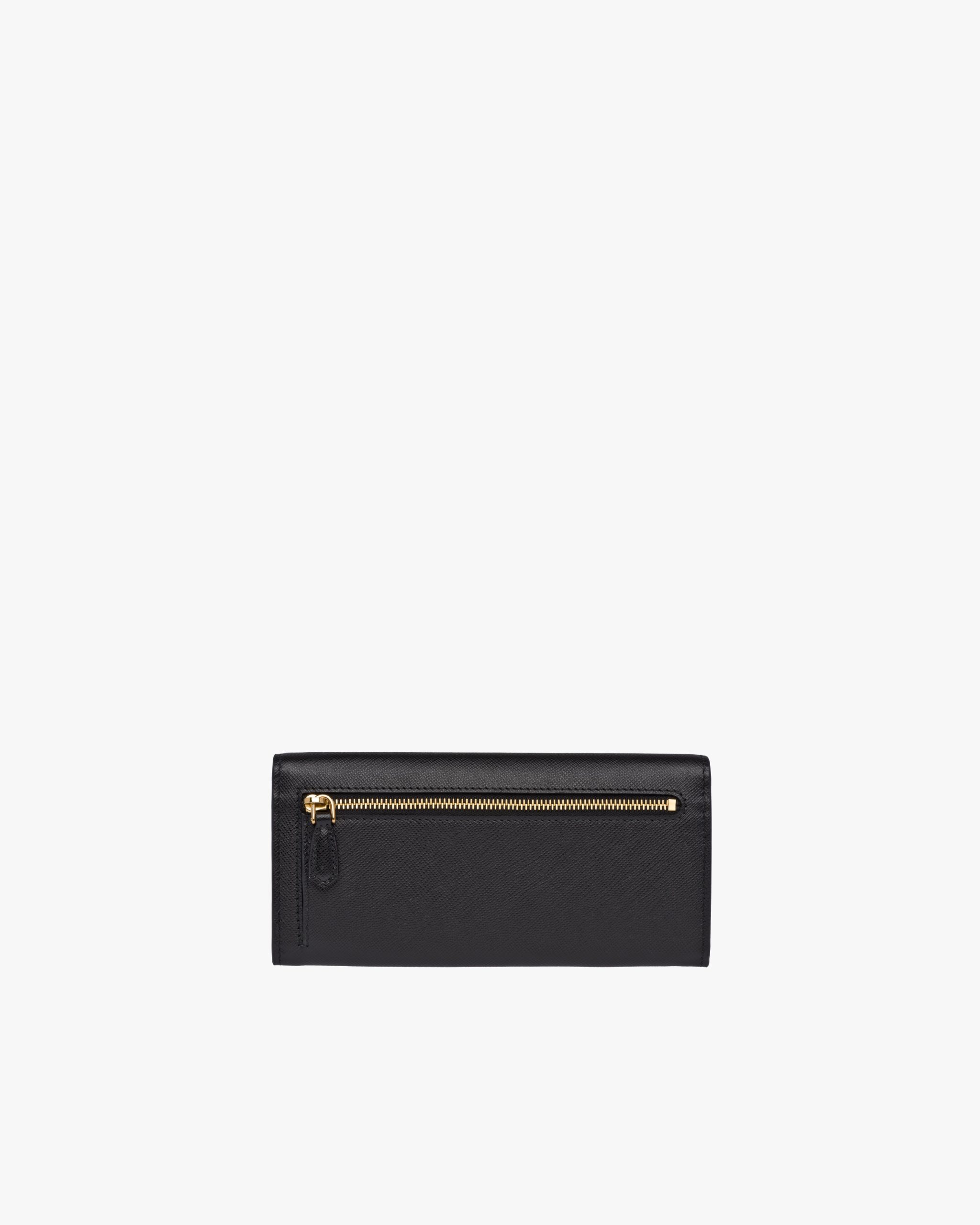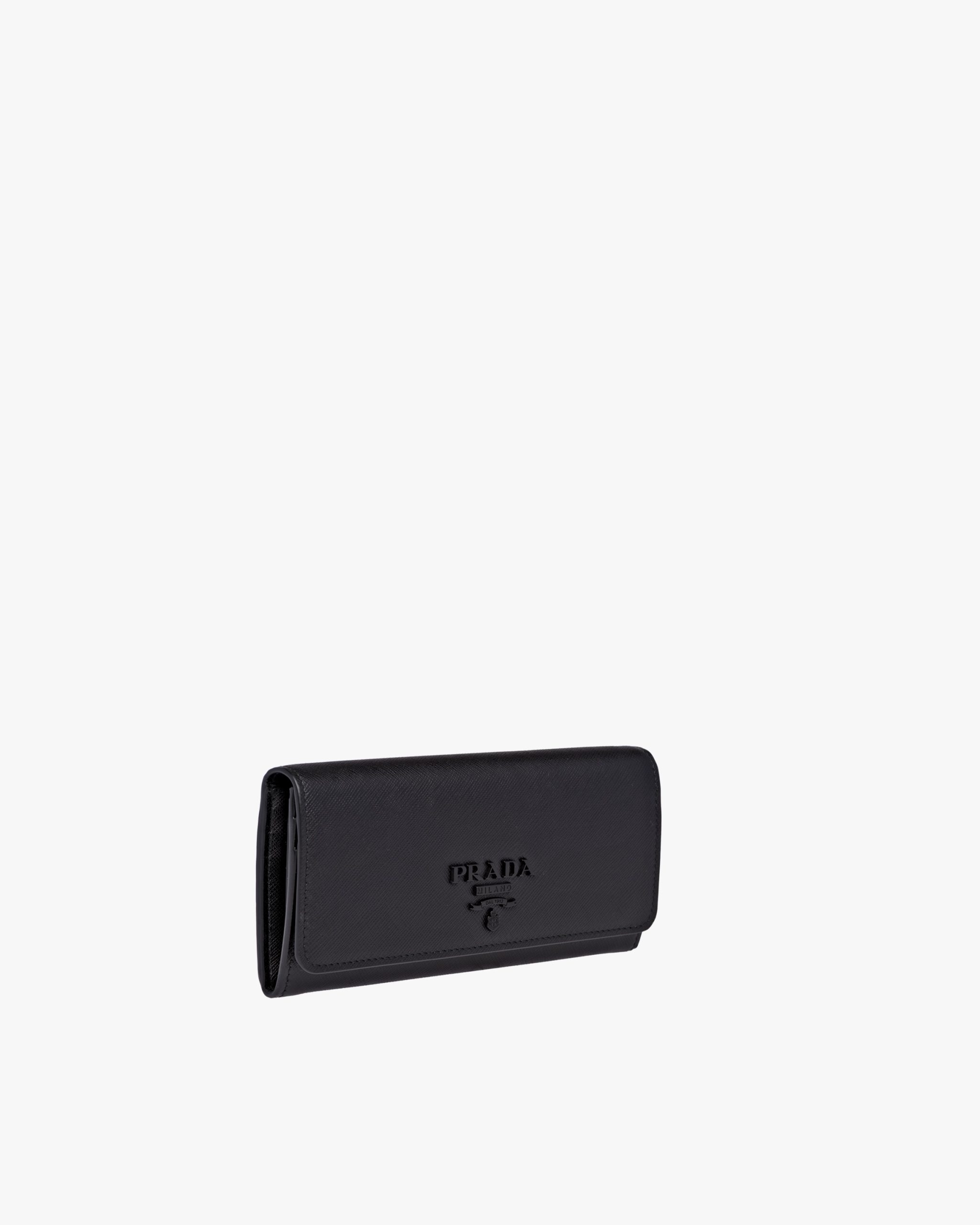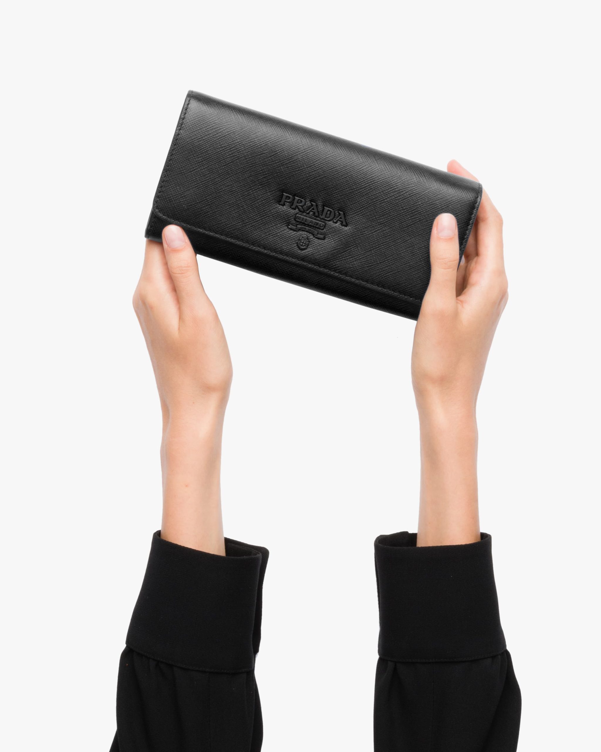 A color-rich Saffiano leather flap wallet with metal Prada lettering in the same tone. Opening with a snap closure, the inside contains various compartments and pockets, and a removable badge holder.