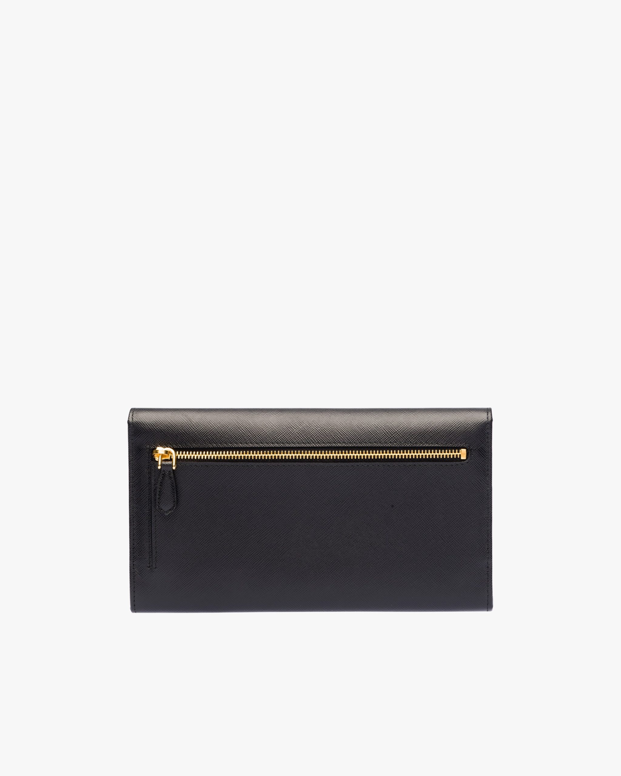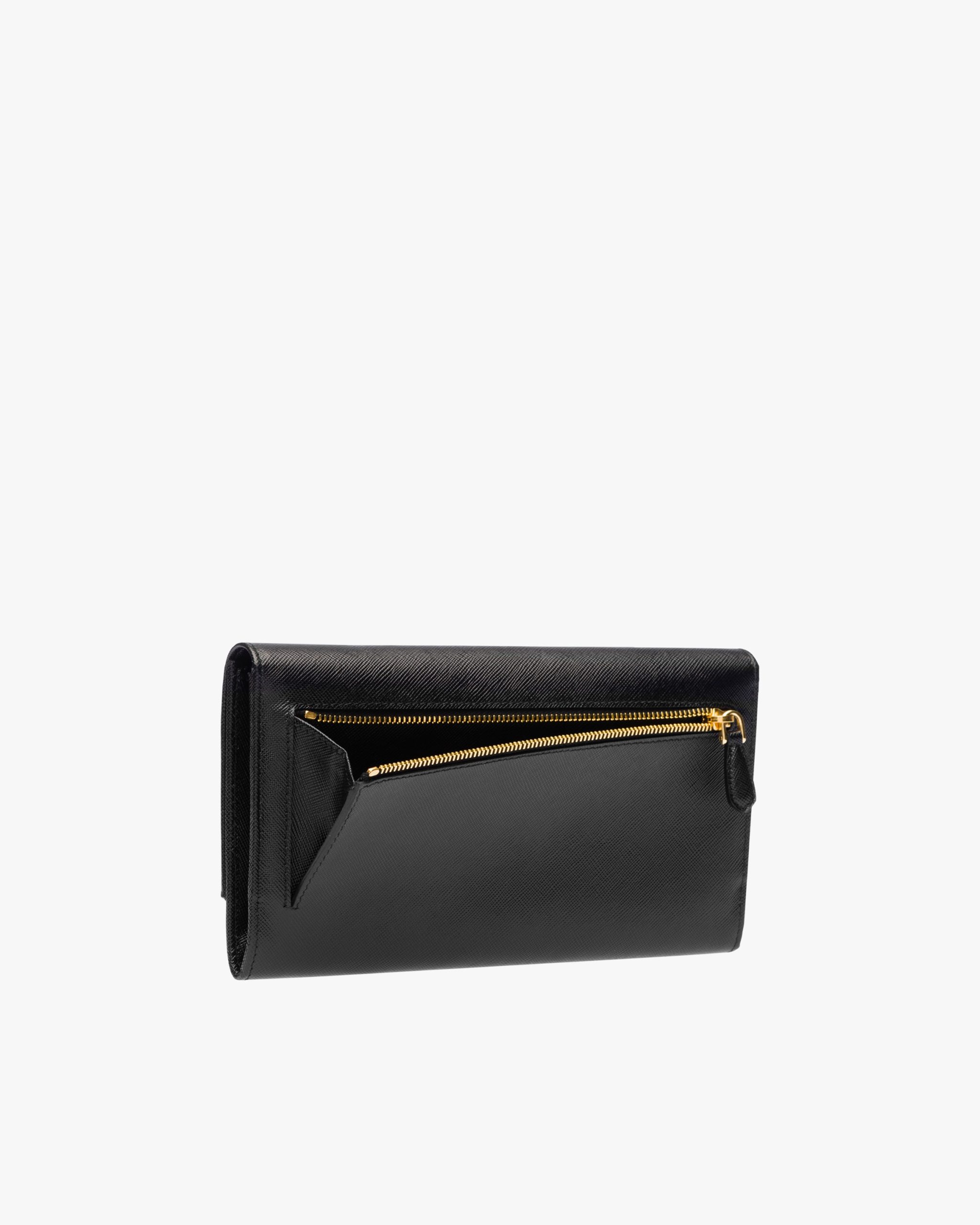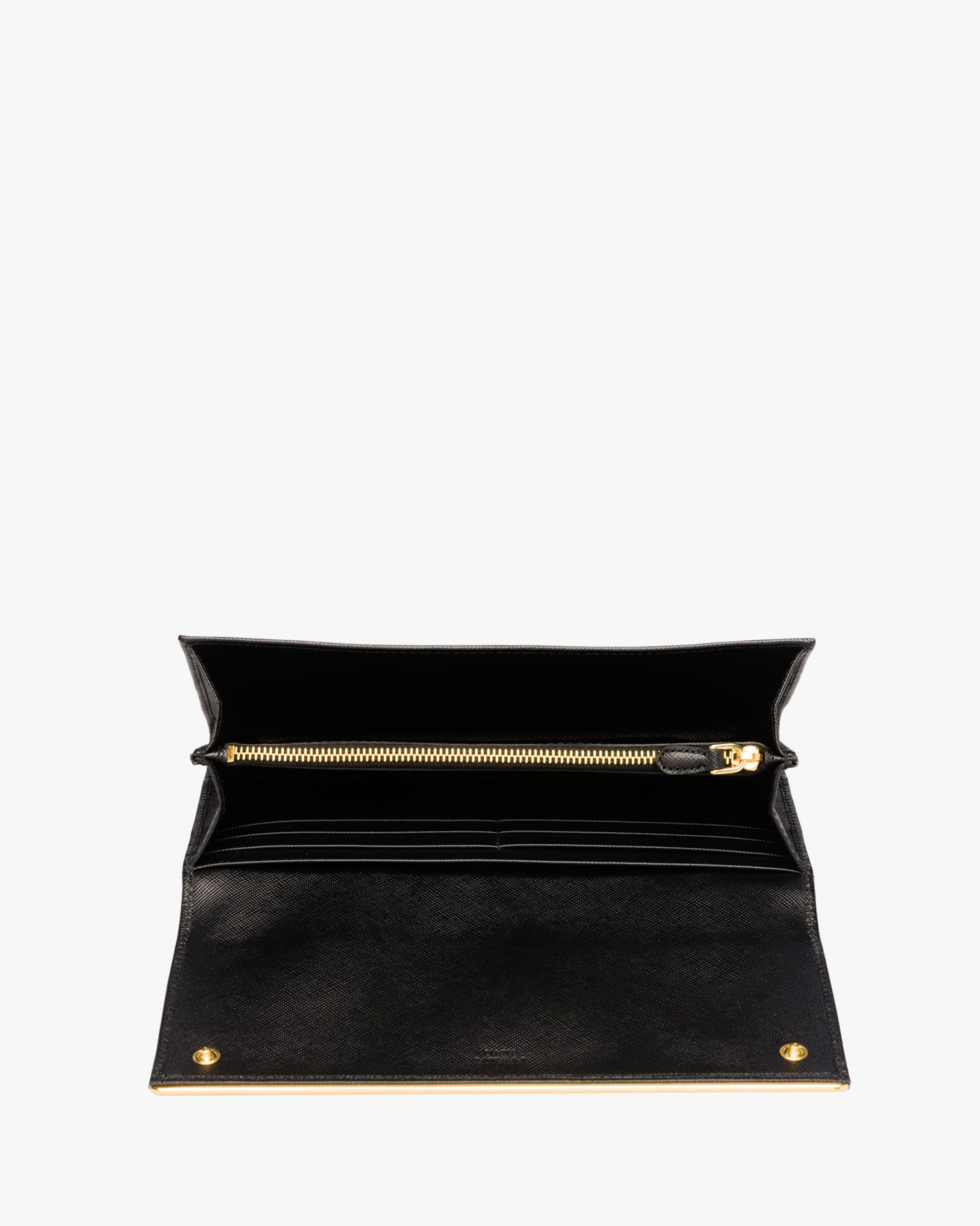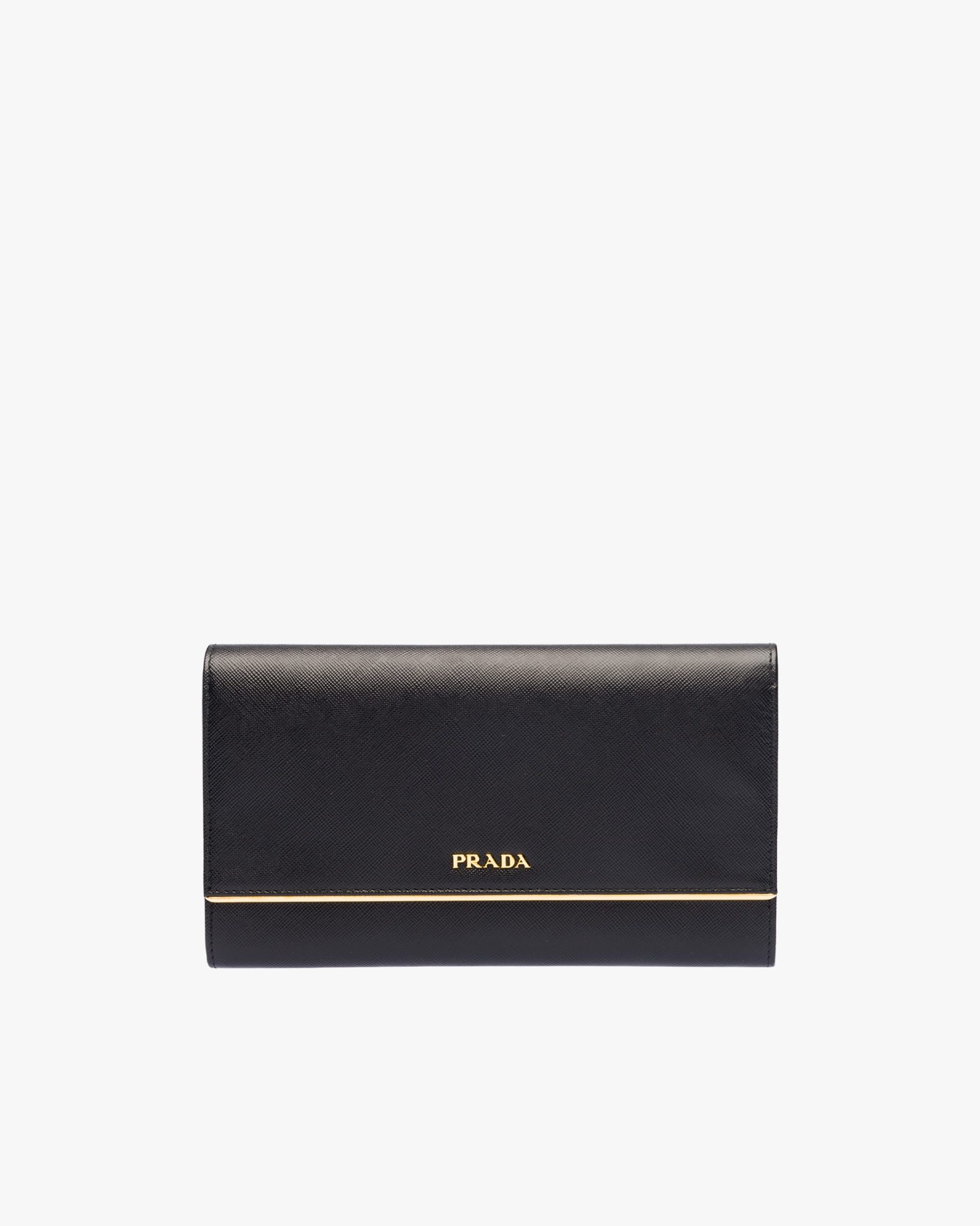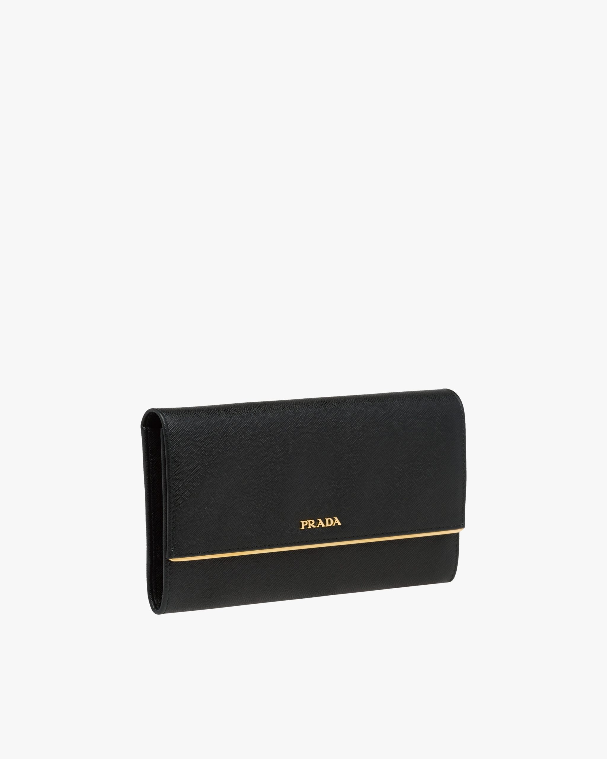 A Saffiano leather flap wallet with gold-toned bar detail and Prada lettering. The snap closure opens to various compartments and slots, and there is an additional zippered pocket on the back.