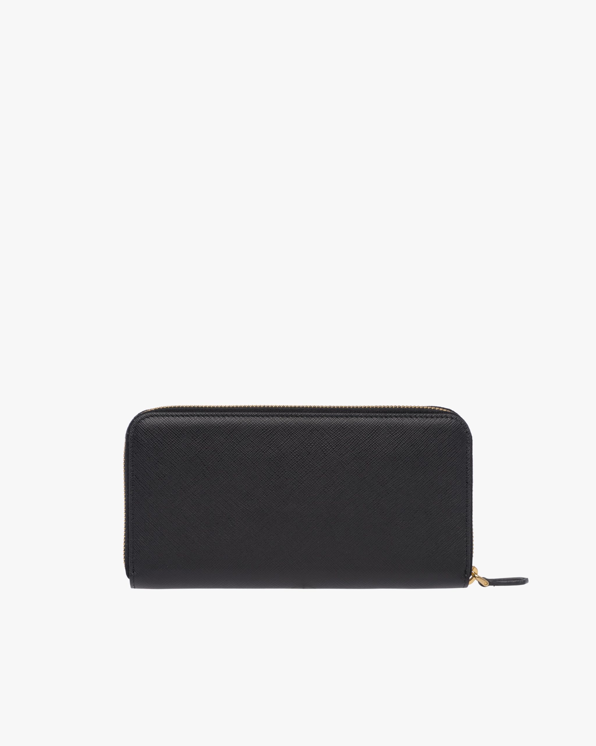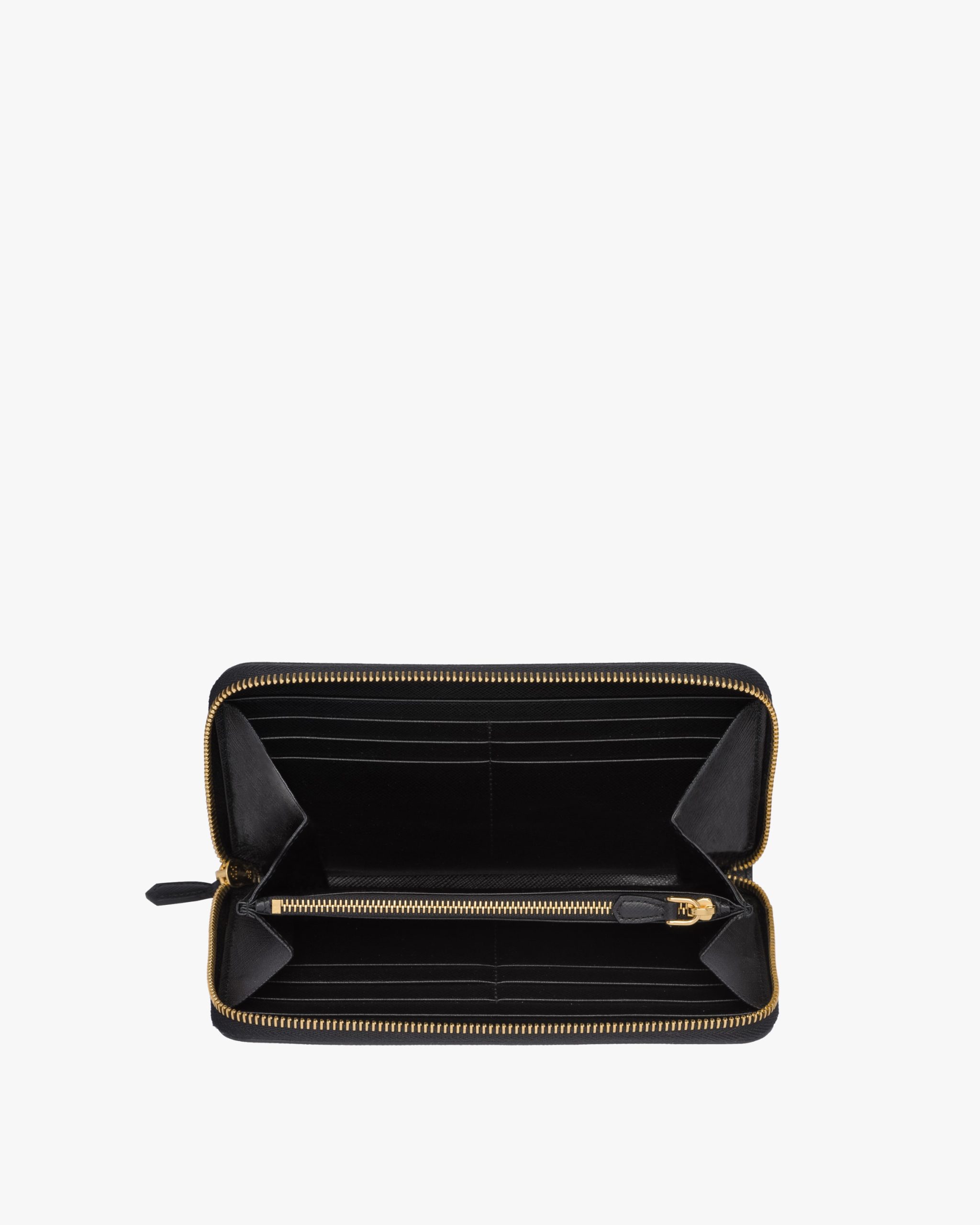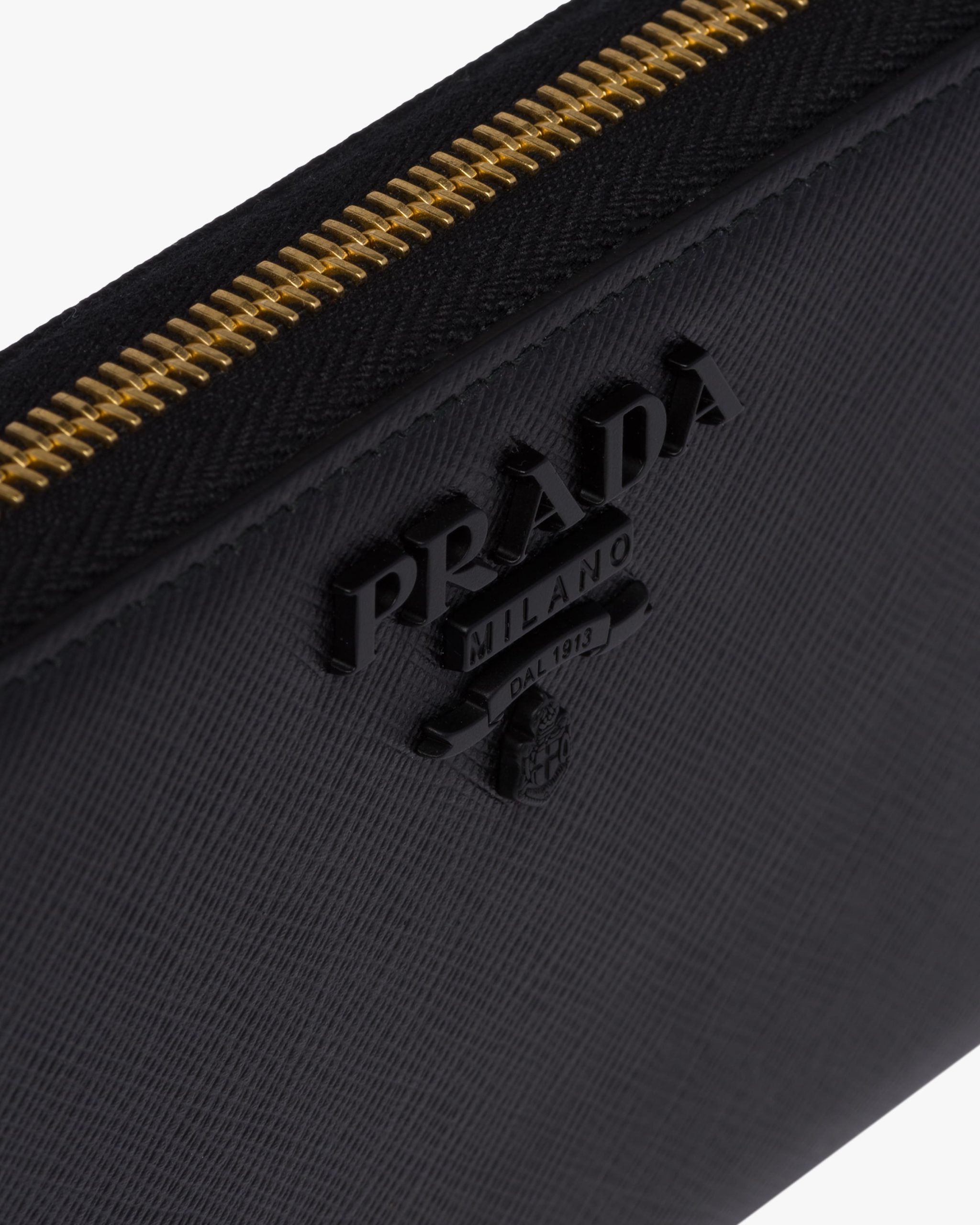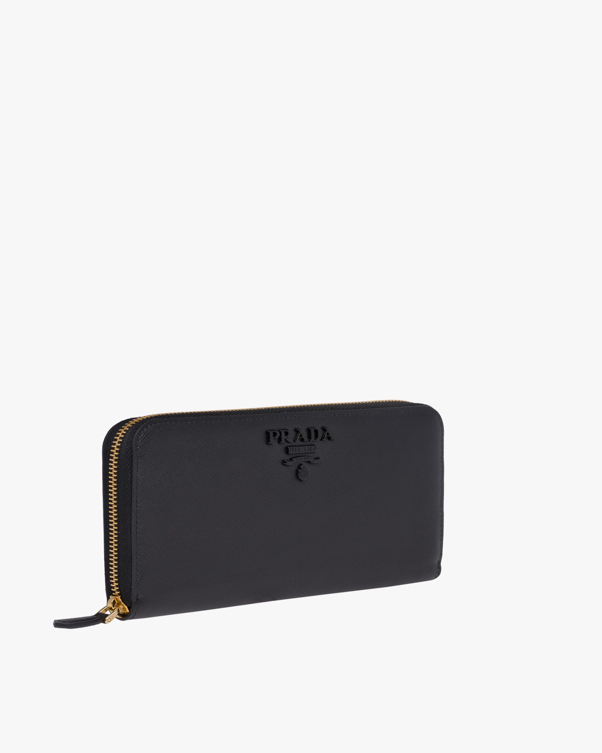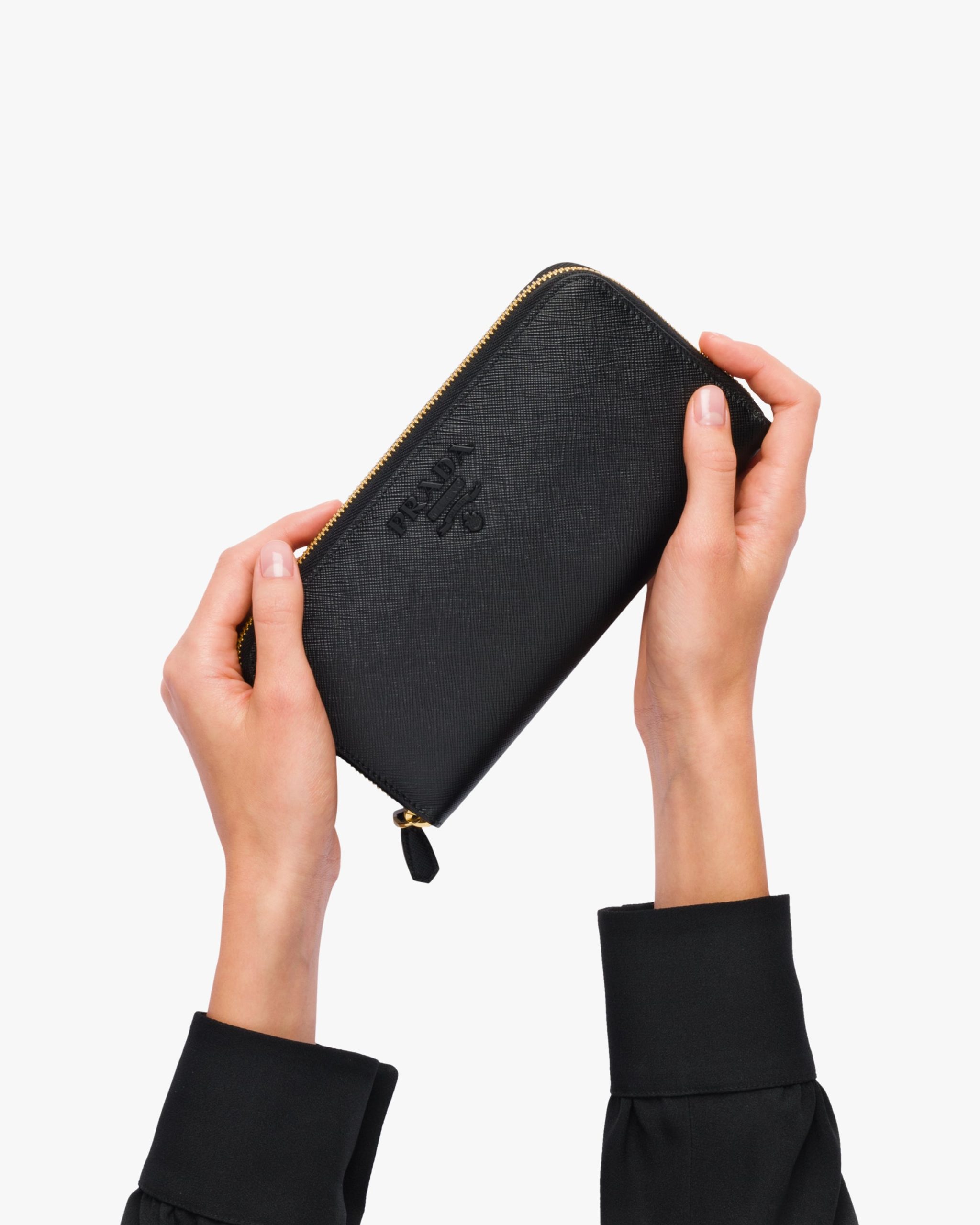 A single-color wallet defined by its matching Saffiano leather and metal Prada logo2. The zip-around wallet opens to a multitude of practical pockets for coins, cards and documents.