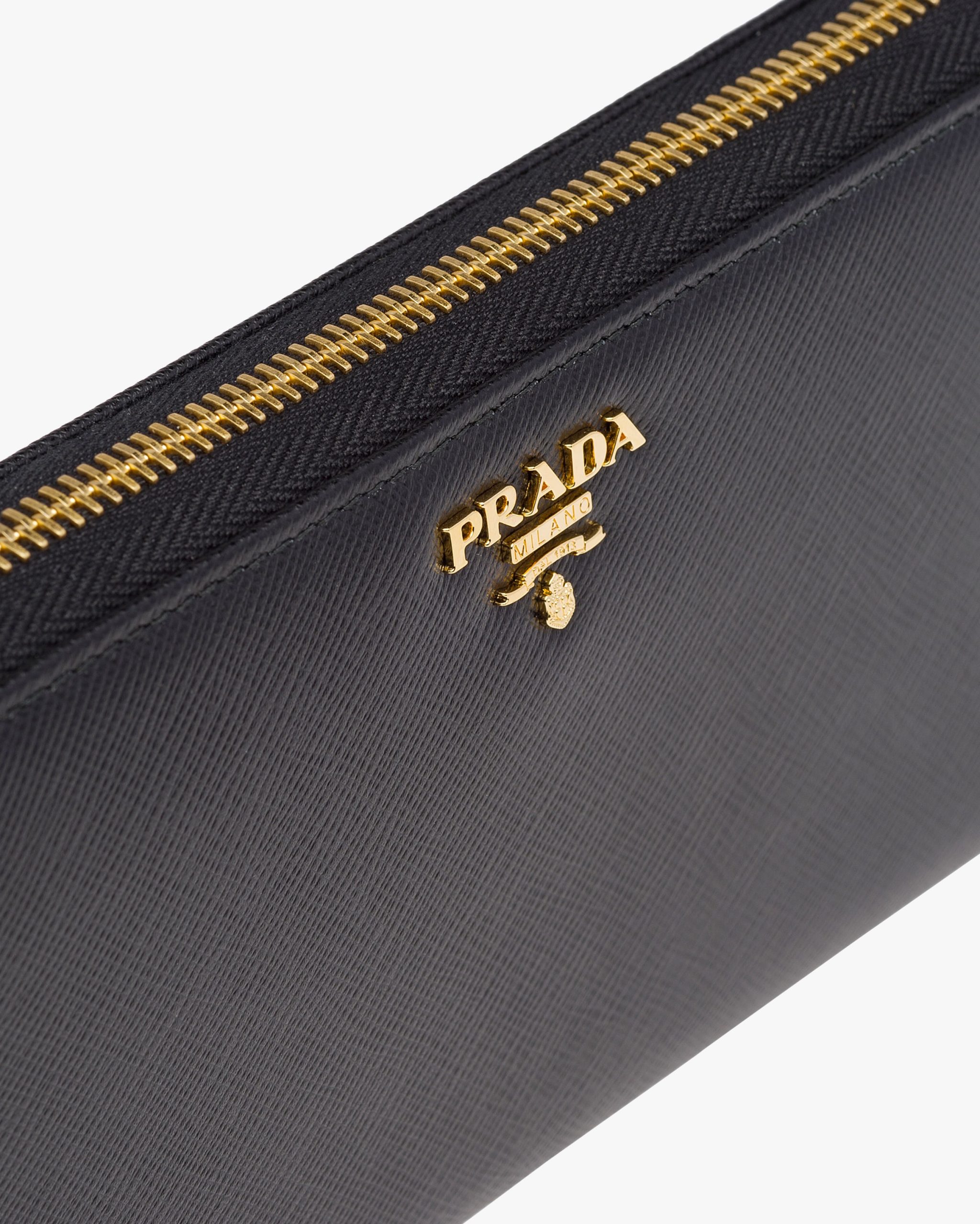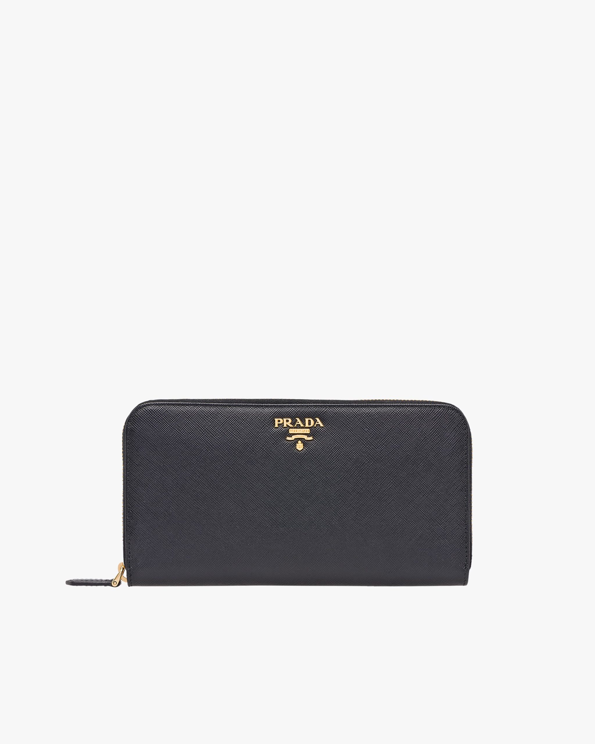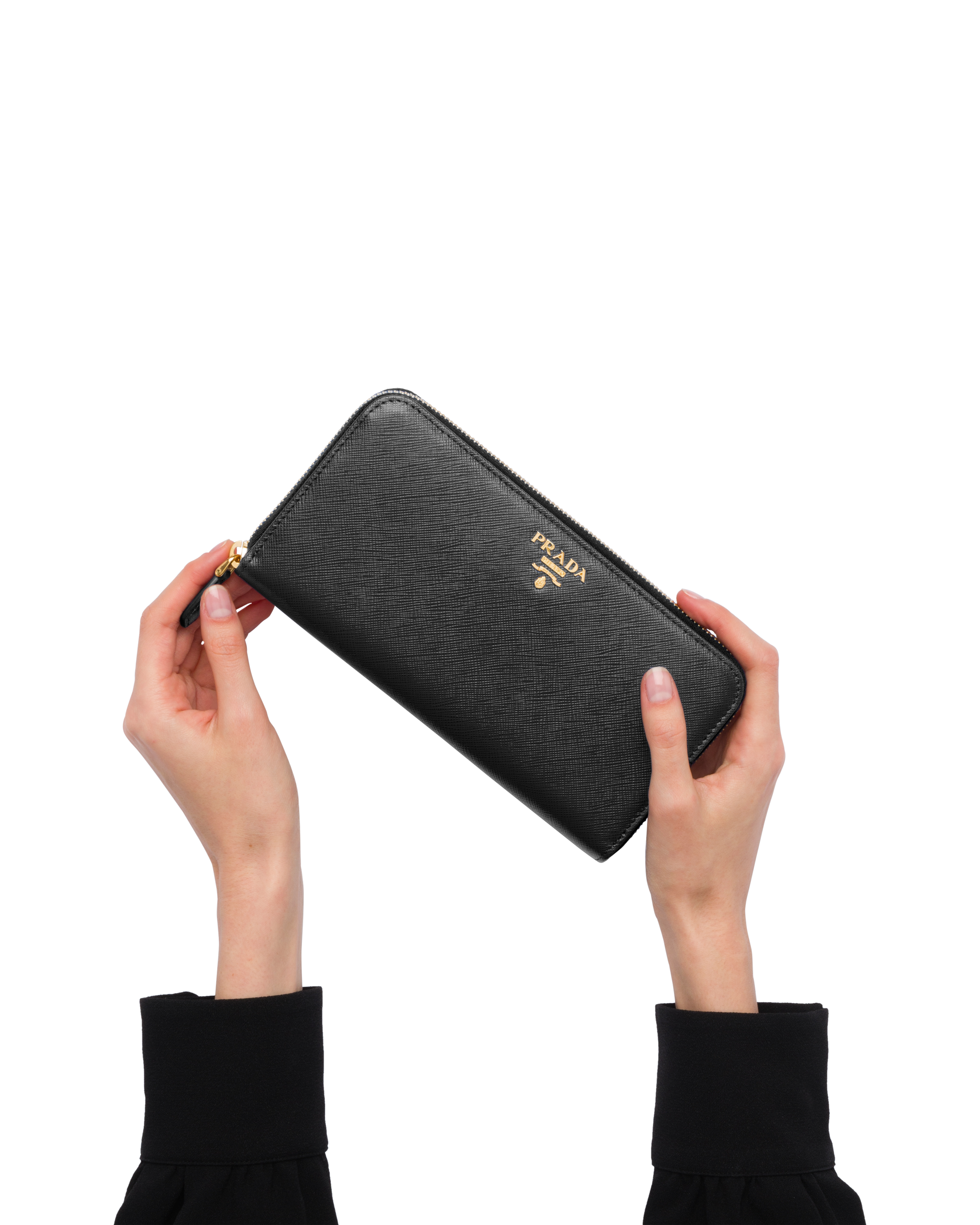 This Saffiano leather wallet is decorated with Prada lettering. The all-round zipper reveals plenty of card slots, pockets and a zippered compartment for coins.