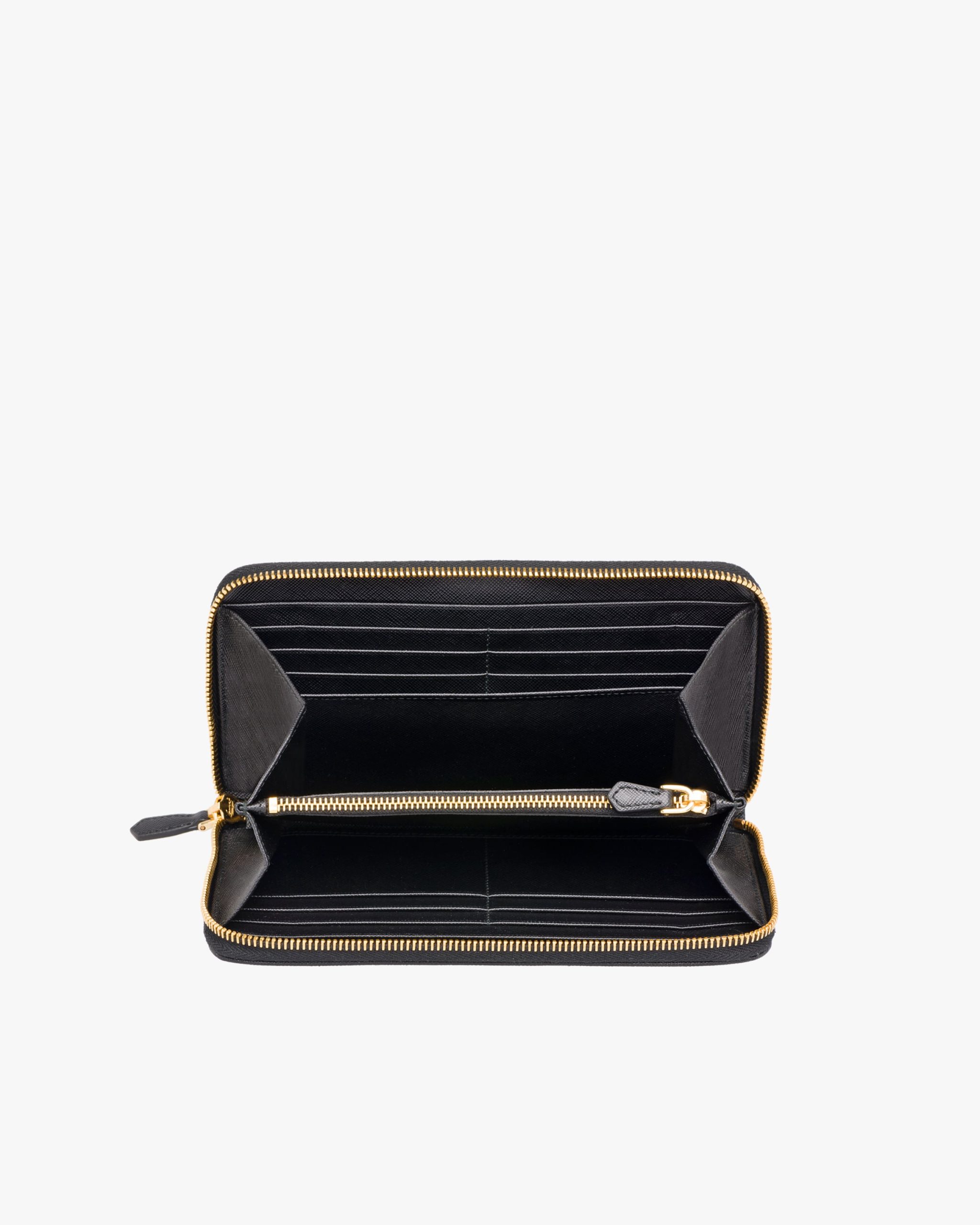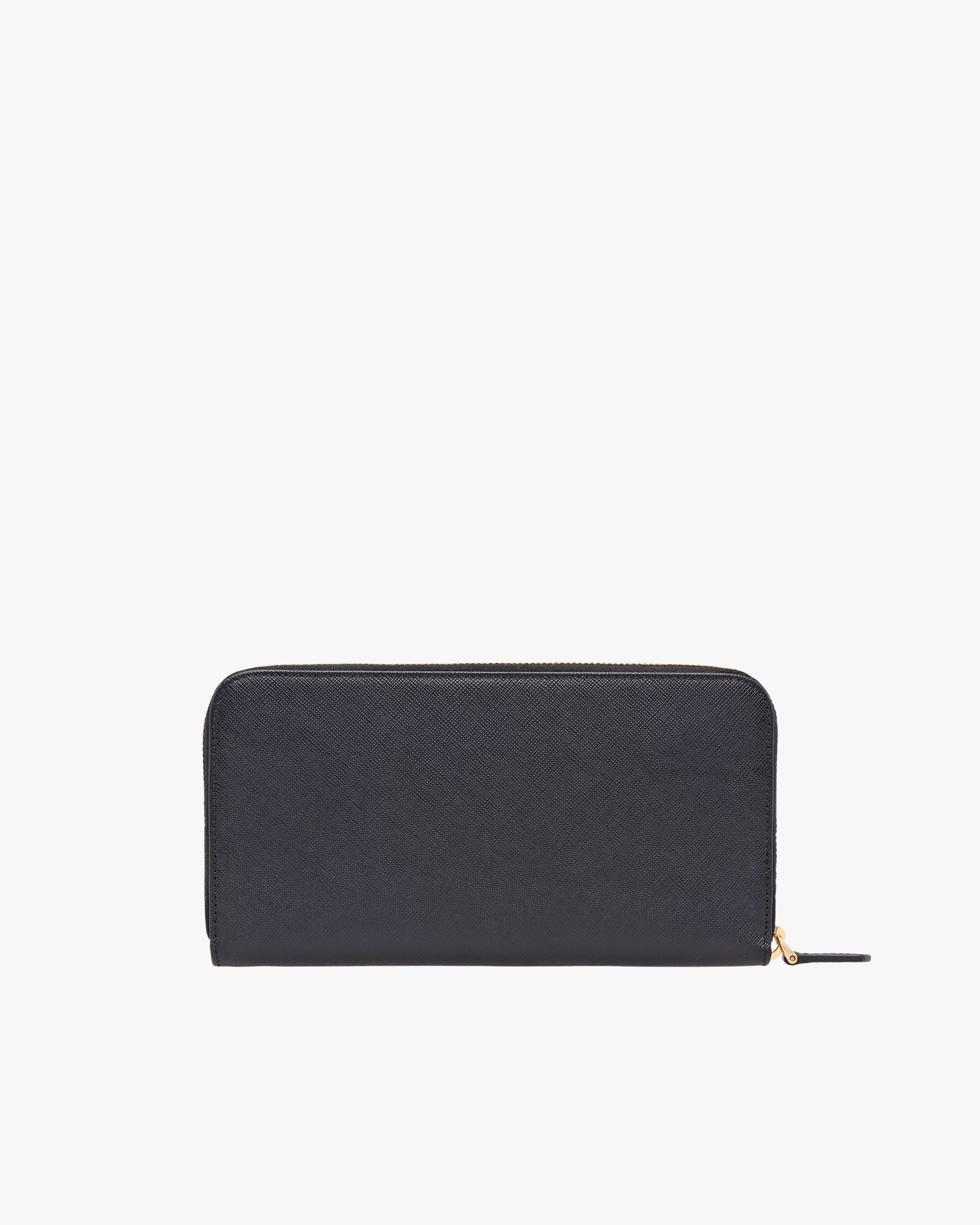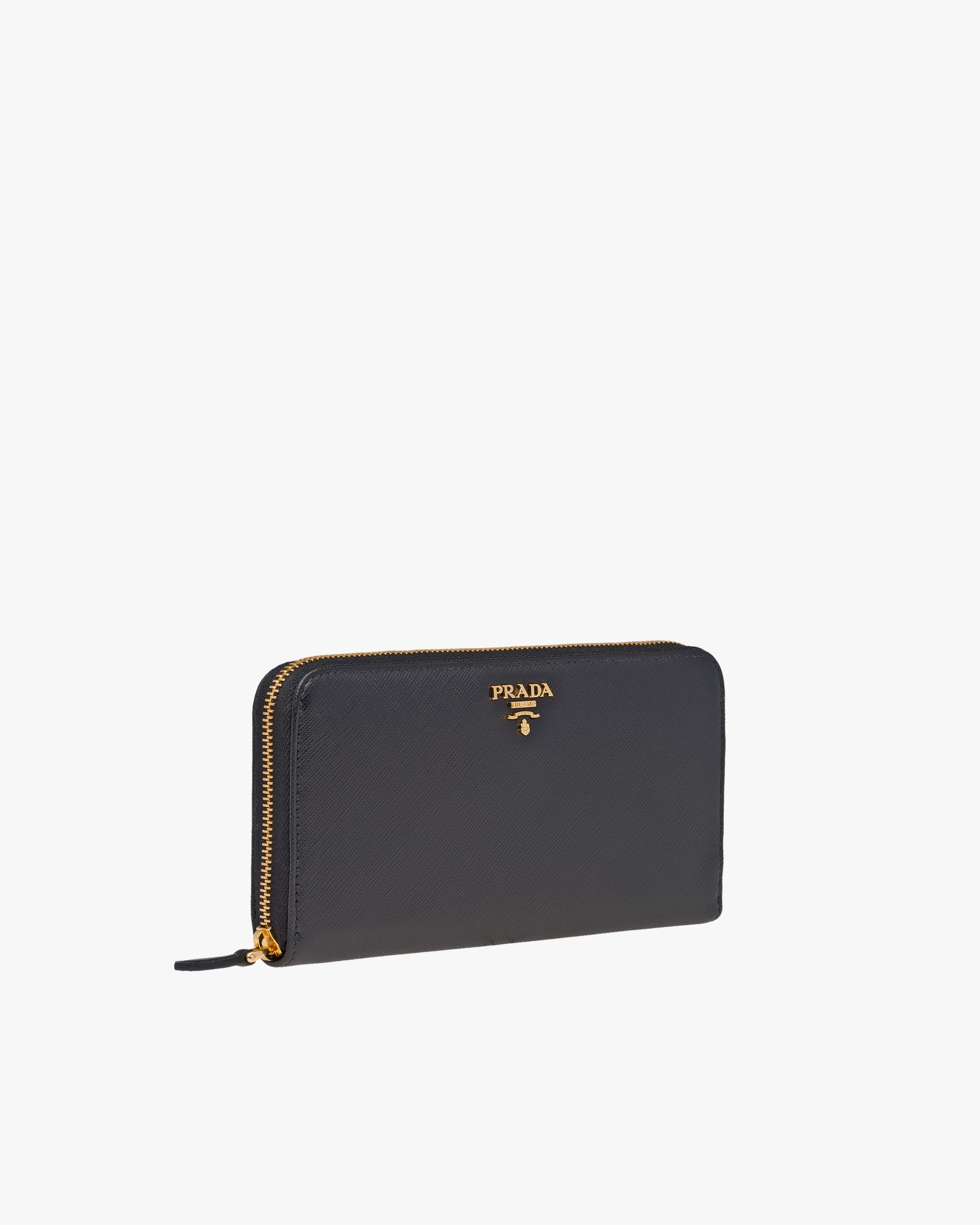 This Saffiano leather wallet is decorated with Prada lettering. The all-round zipper reveals plenty of card slots, pockets and a zippered compartment for coins.