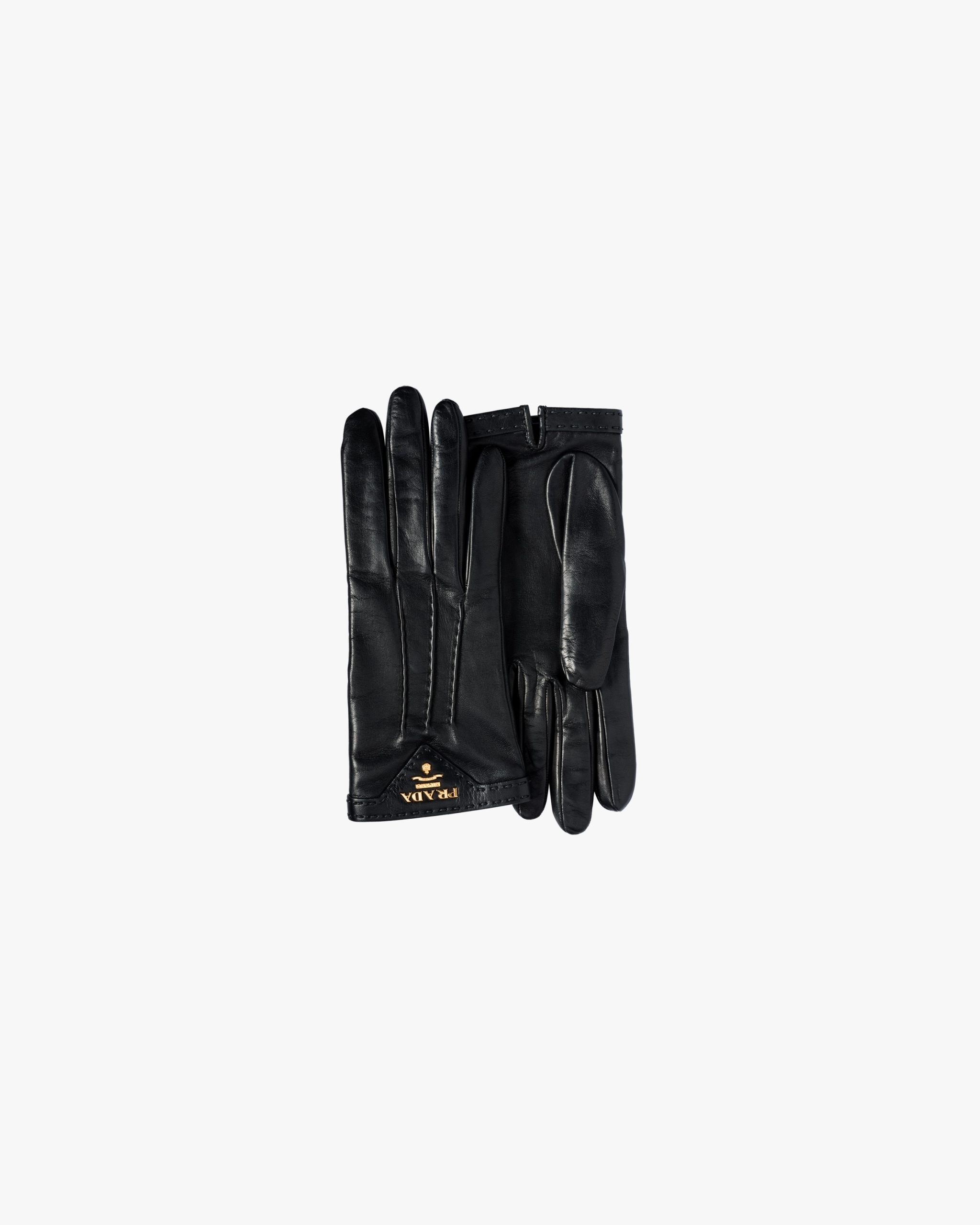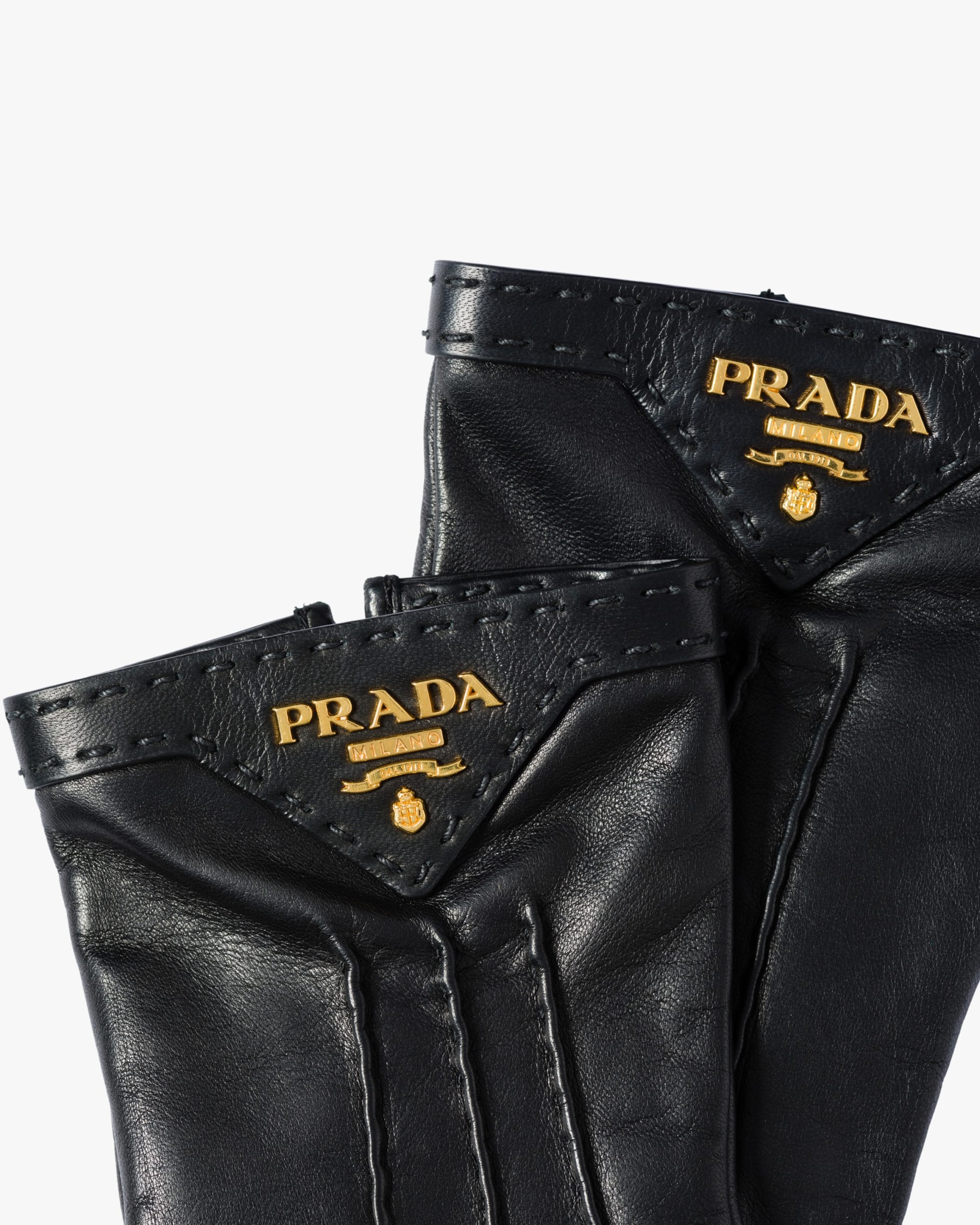 Short Nappa leather gloves lined with cashmere. The outside features embroidered details and a prominent metal Prada logo2.