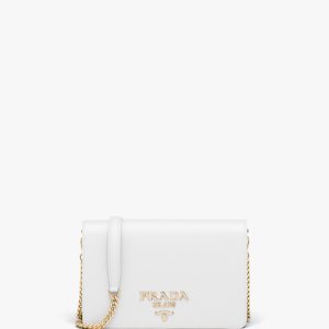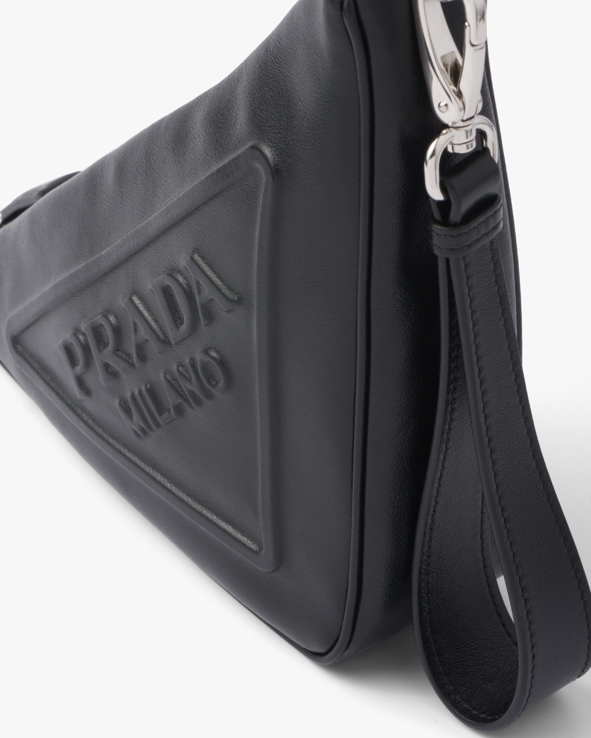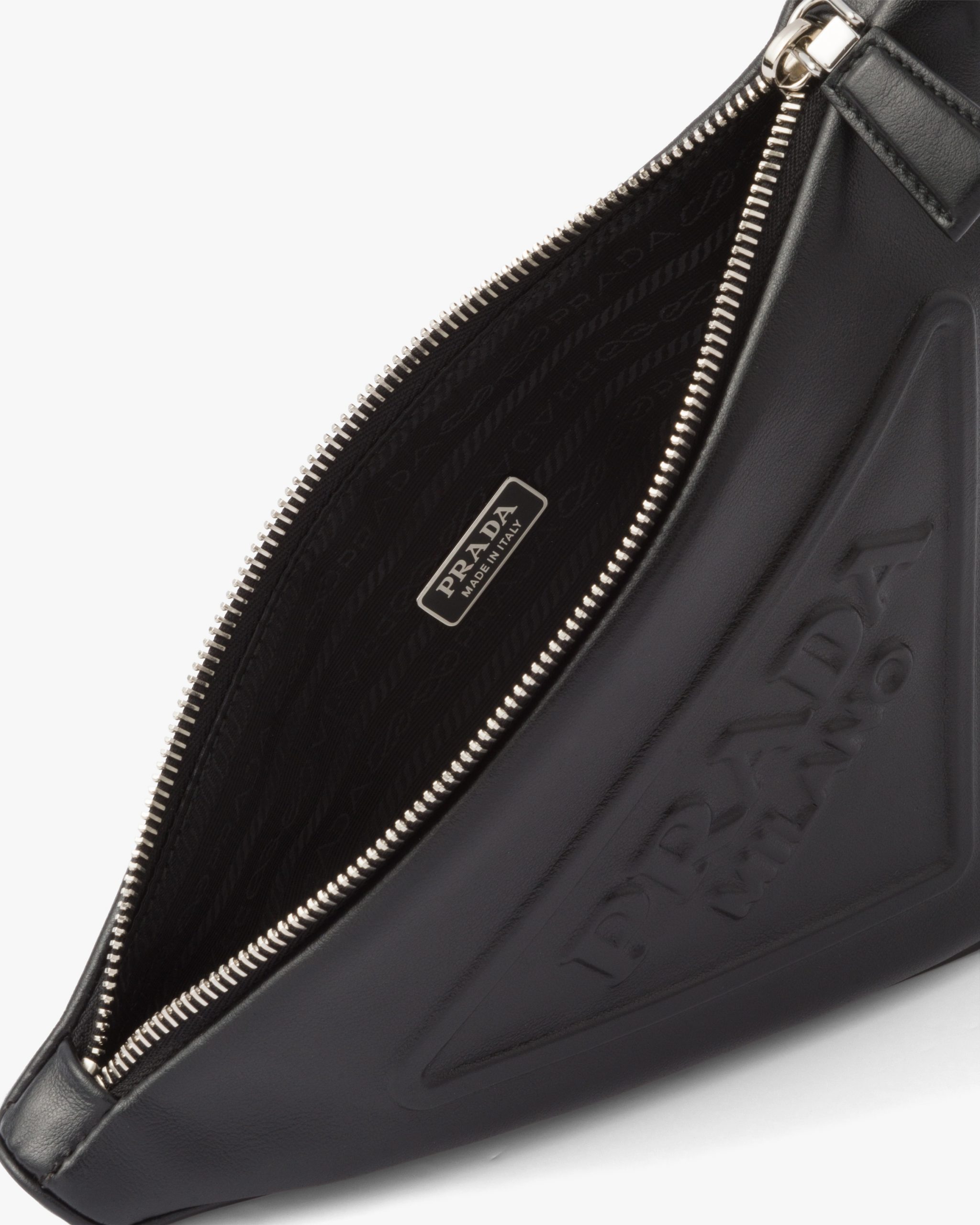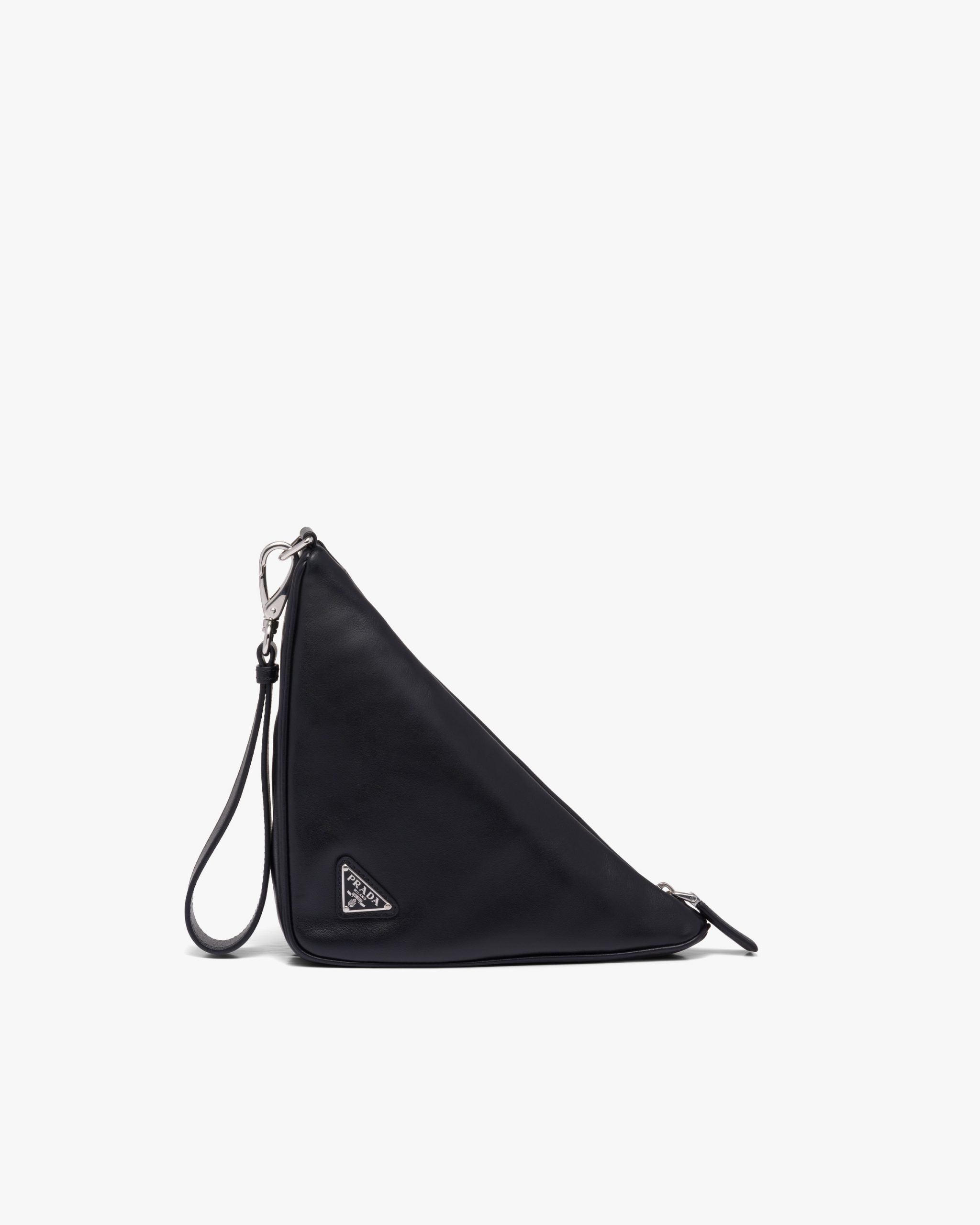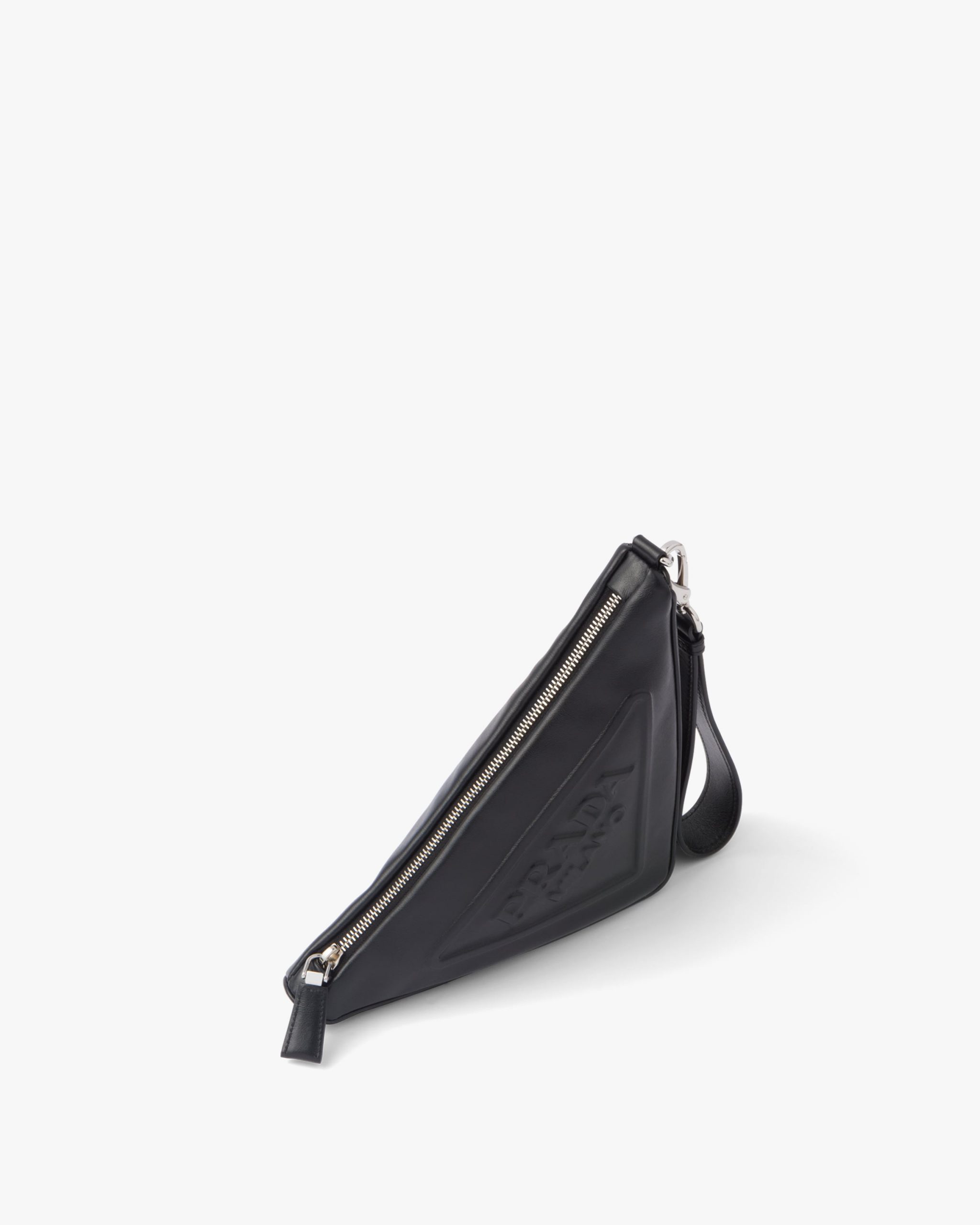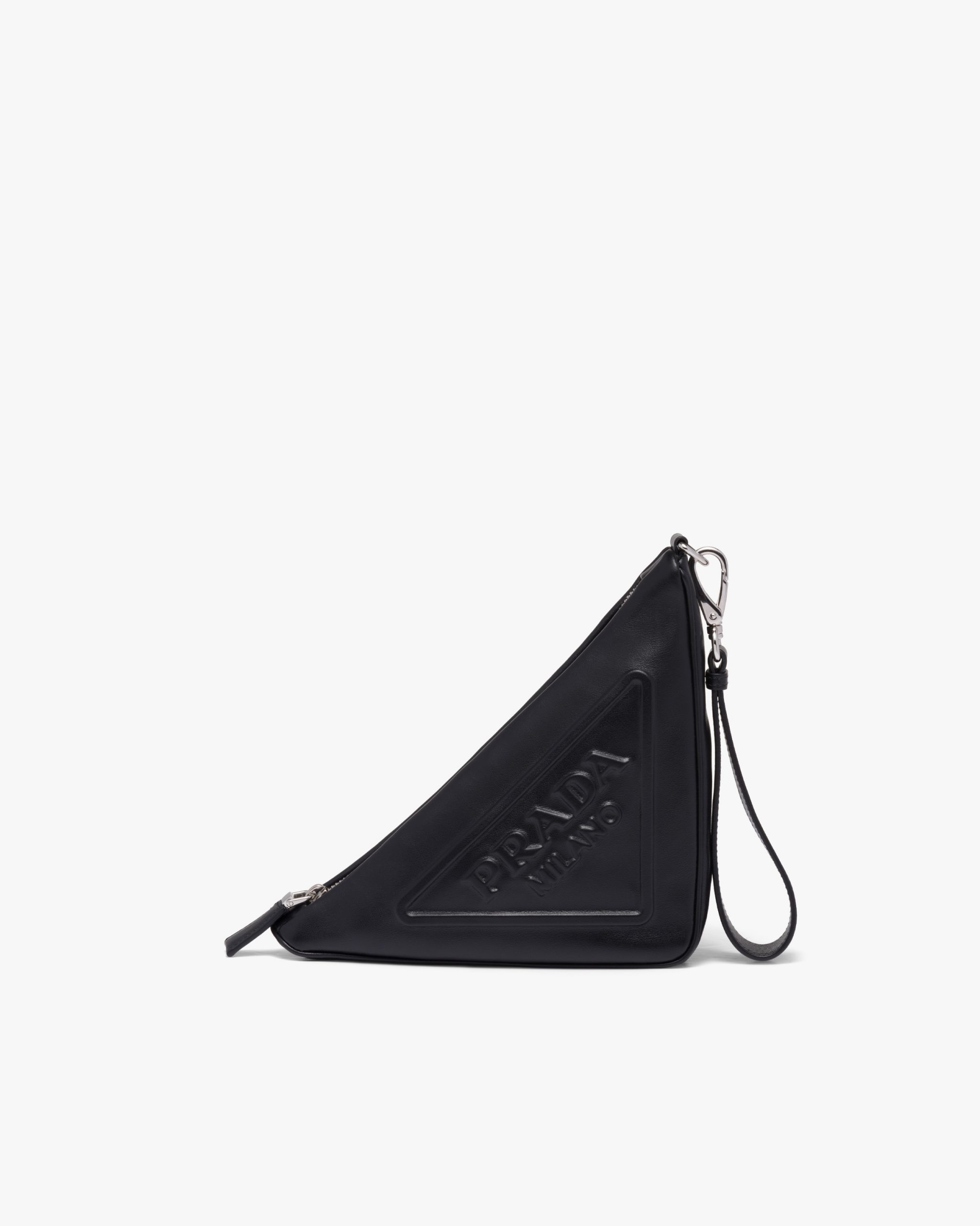 A study of the triangle inspires new geometric elements and novel interpretations of Prada’s historic stylistic code. The iconic shape is presented again in this sleek pouch that comes with a strap for versatility. The tonal embossed logo2 and the enameled metal triangle logo2 enhance the minimalist aesthetics.