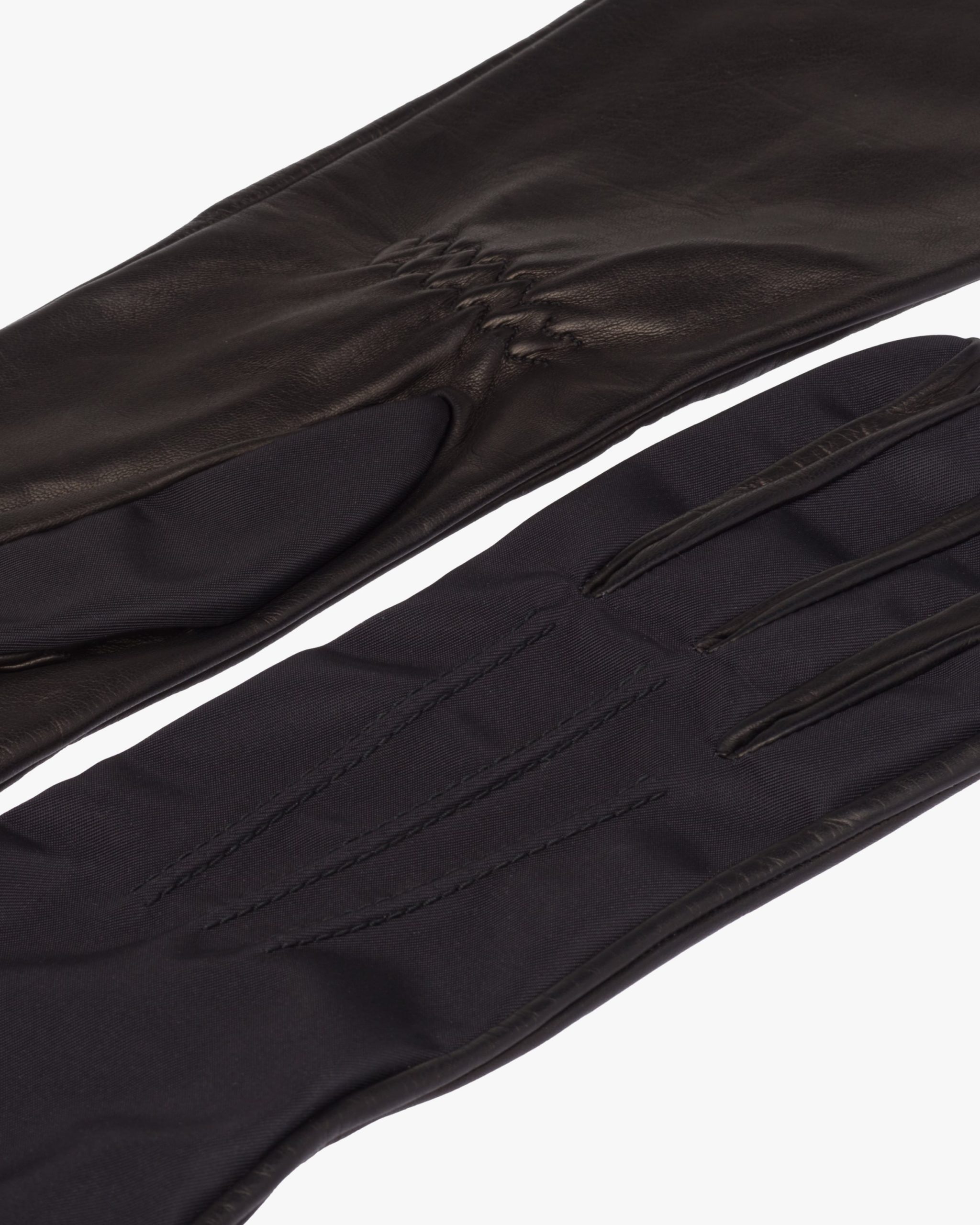Long gloves are given a contemporary twist through the use of nylon and leather. They are lined in silk.