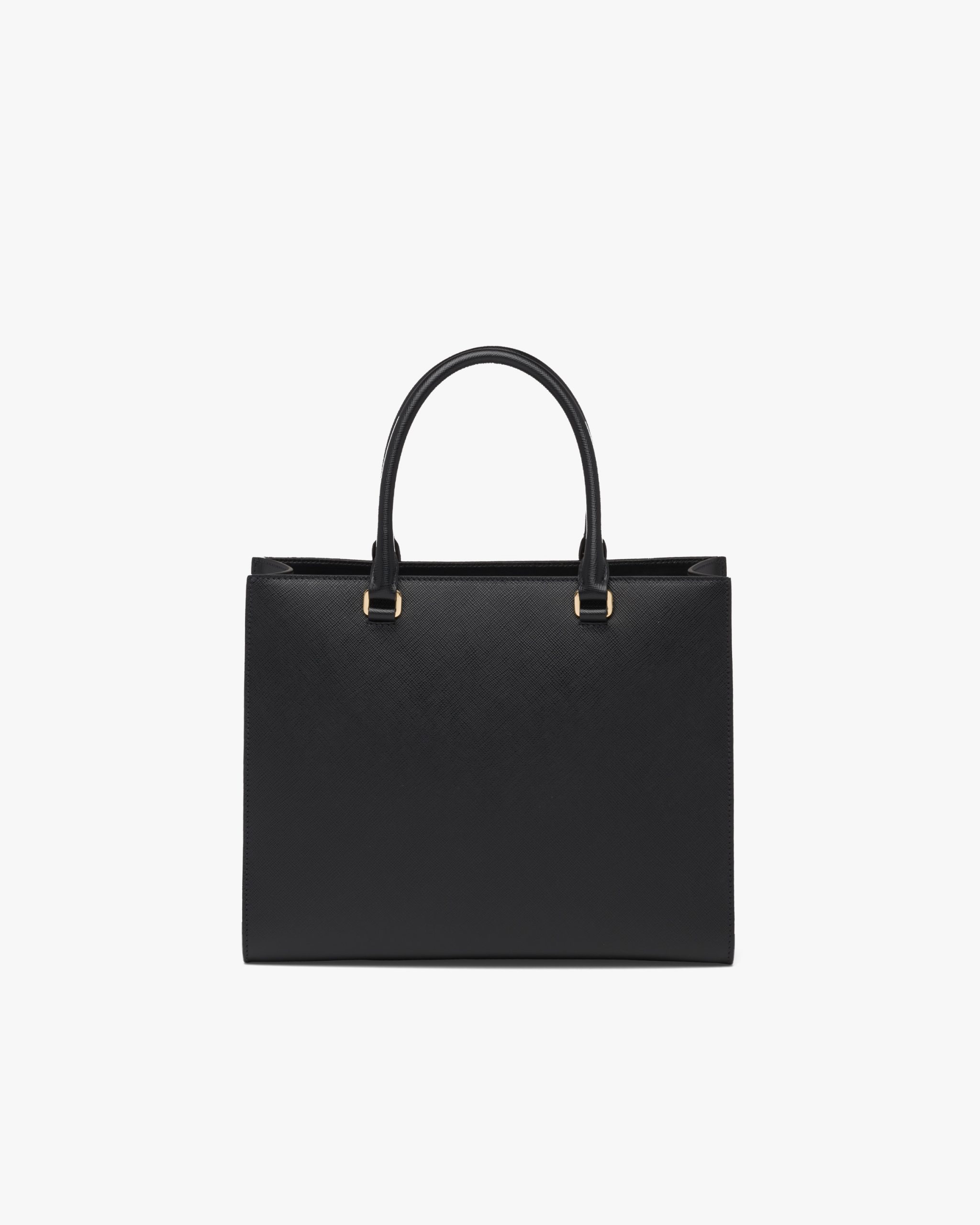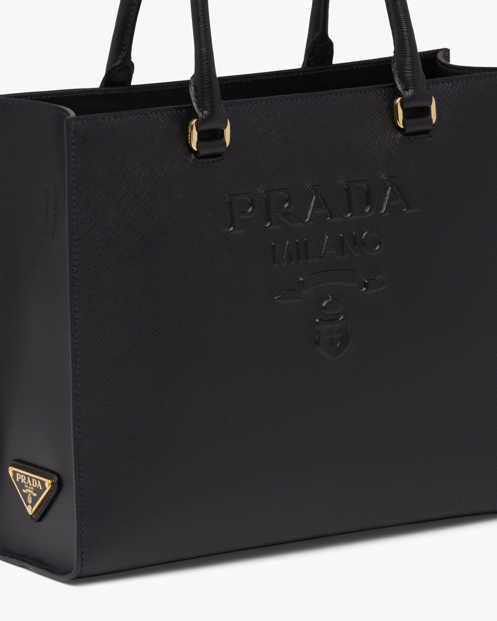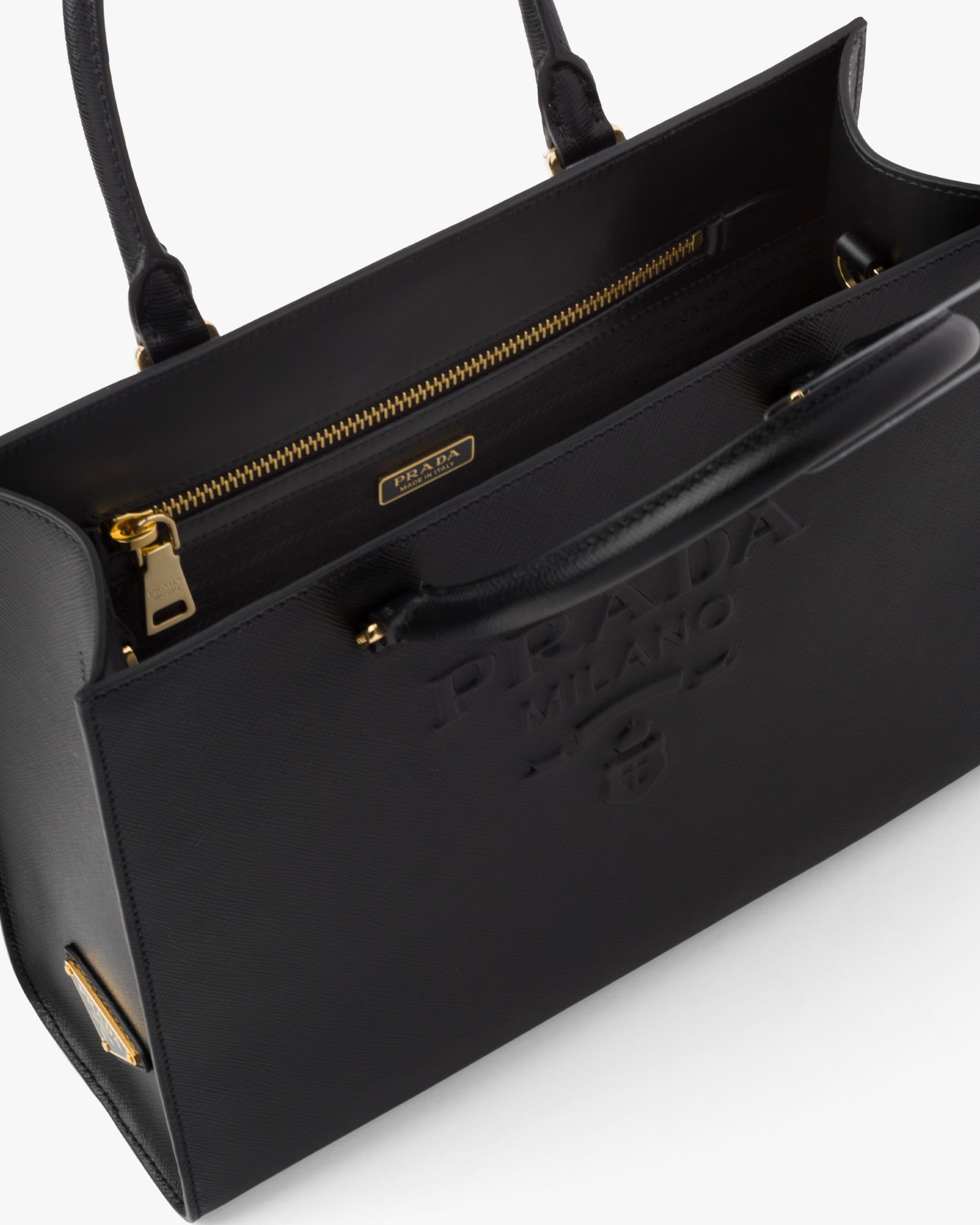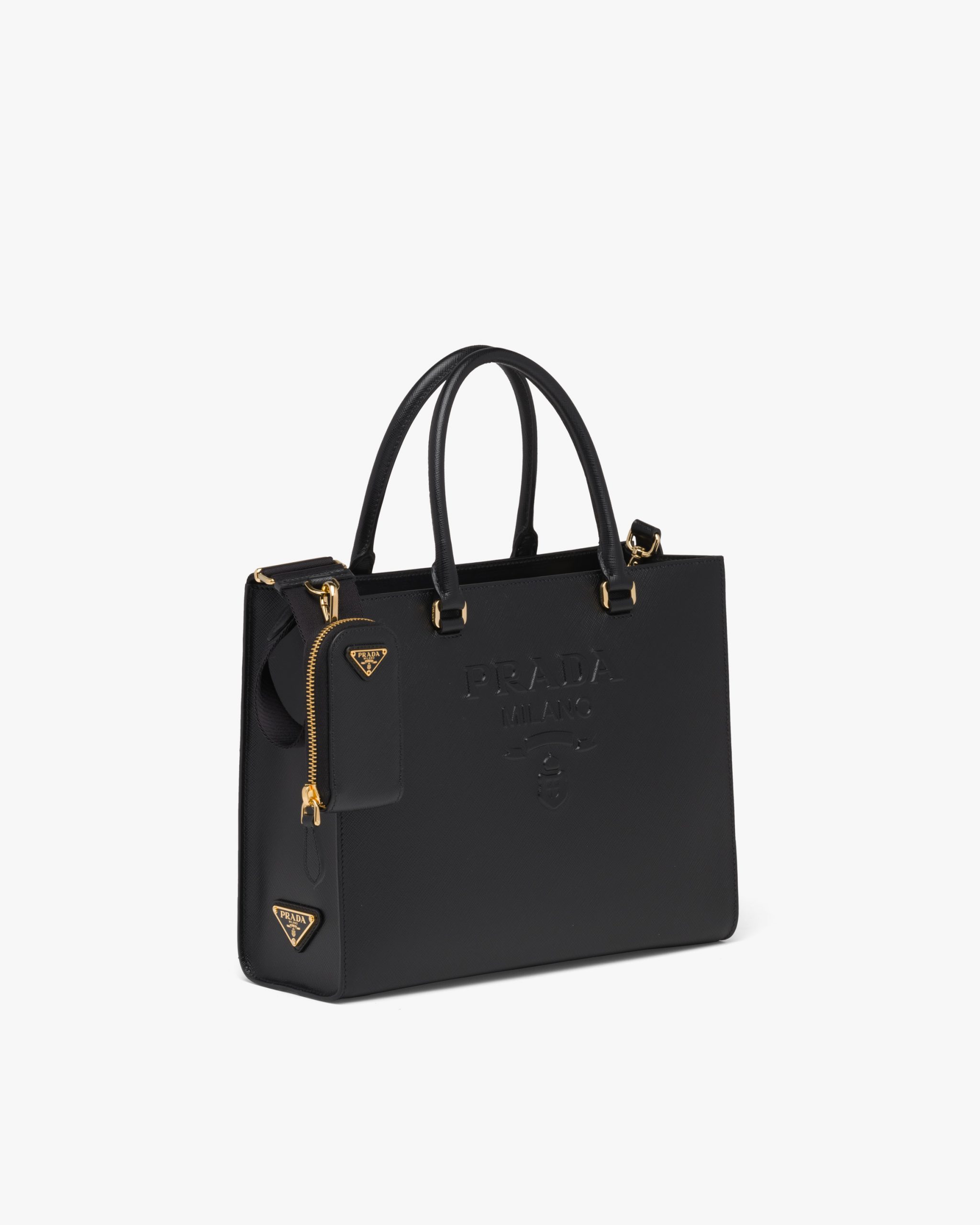 Saffiano leather, Prada’s iconic material, is synonymous with luxury and identifies with traditional Italian leather-making. This high-quality leather with its characteristic crosshatch texture and waxed finish defines this handbag with a sleek, elegant design, double handle, and detachable shoulder strap that allows it to be worn in different ways. Decorated with the embossed lettering logo2, the design has a detachable pouch for a contemporary accent.