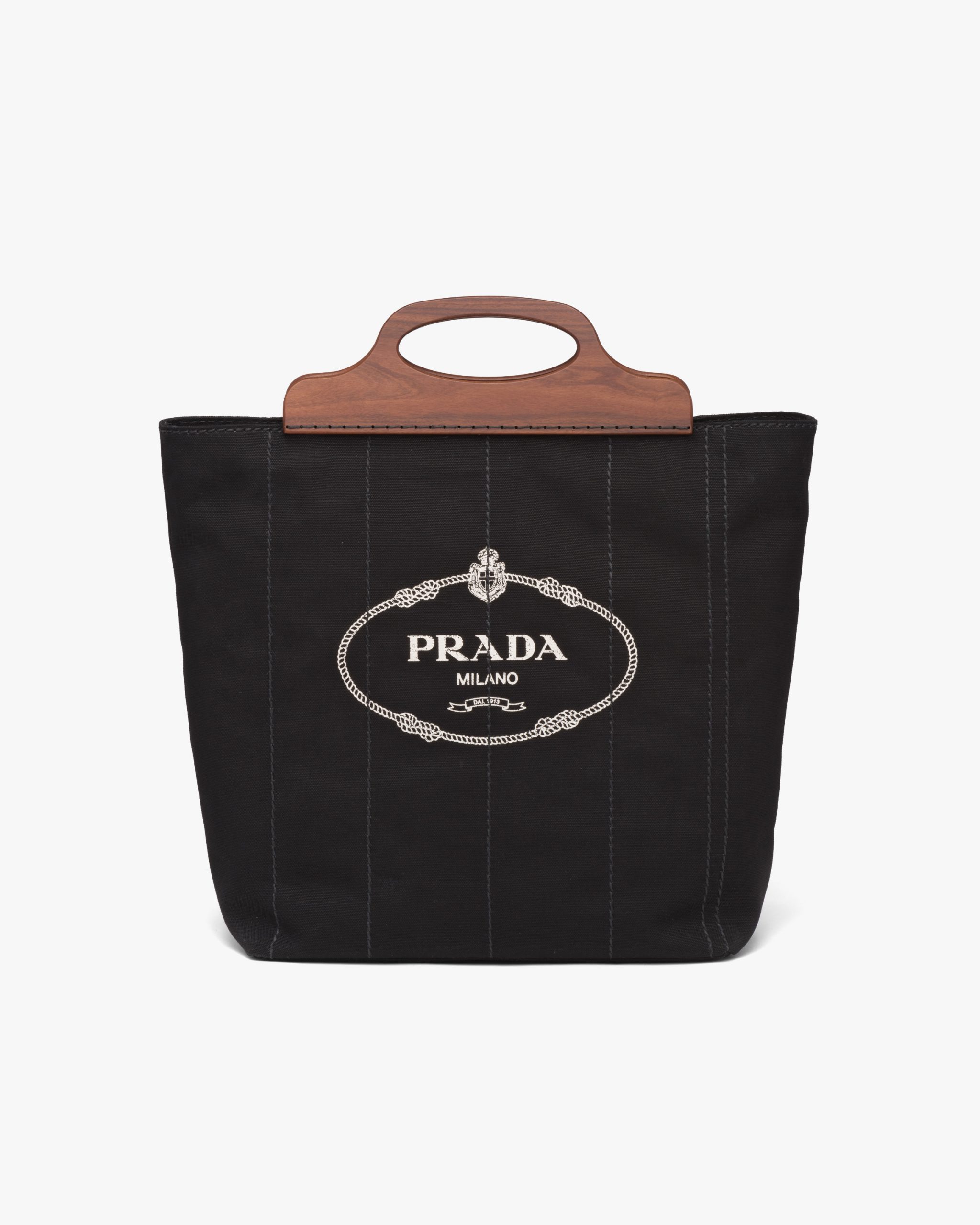 Contrasting materials characterize this cotton canvas bag. The wooden handle distinguishes the accessory with a shoulder strap and screen-printed logo2.