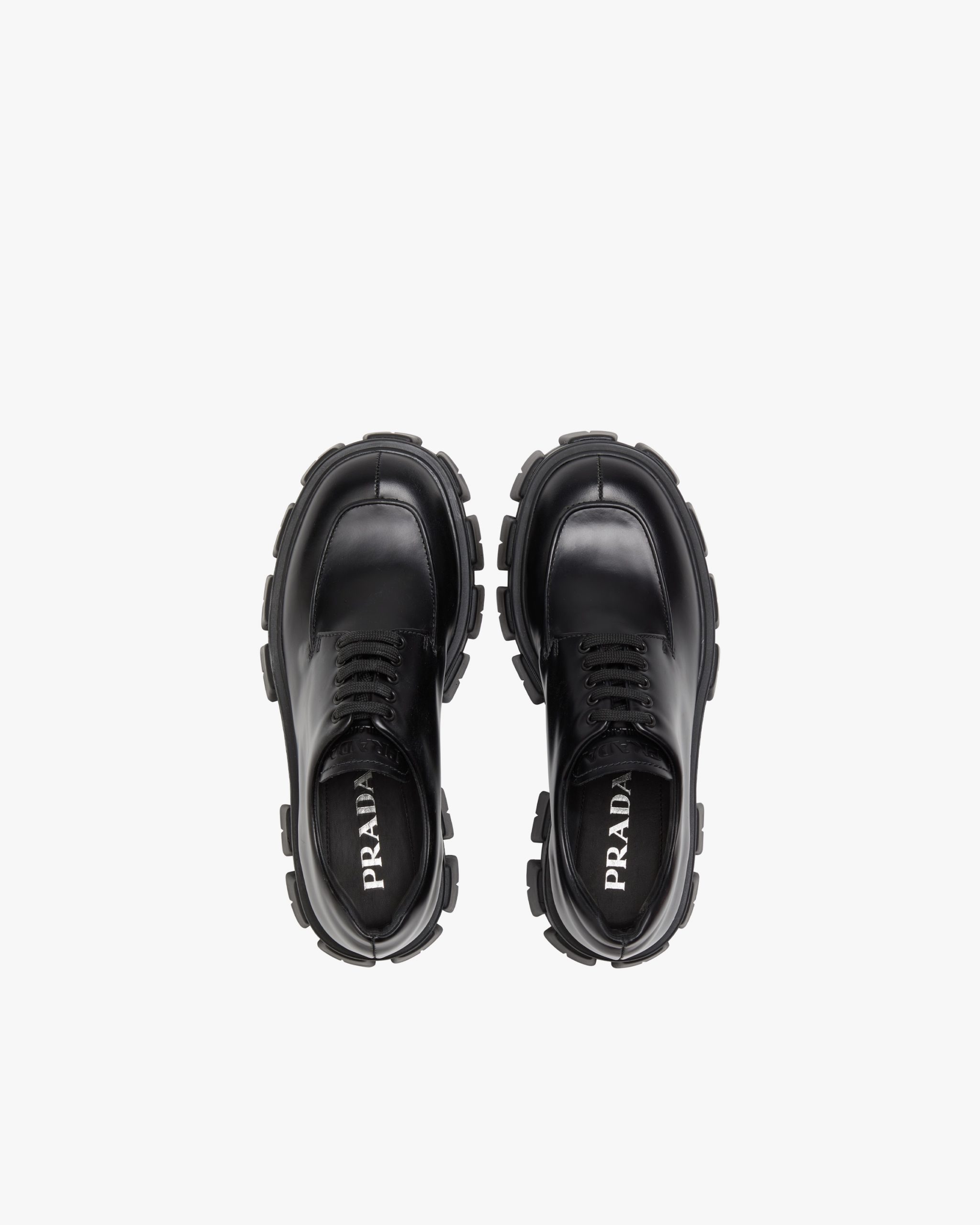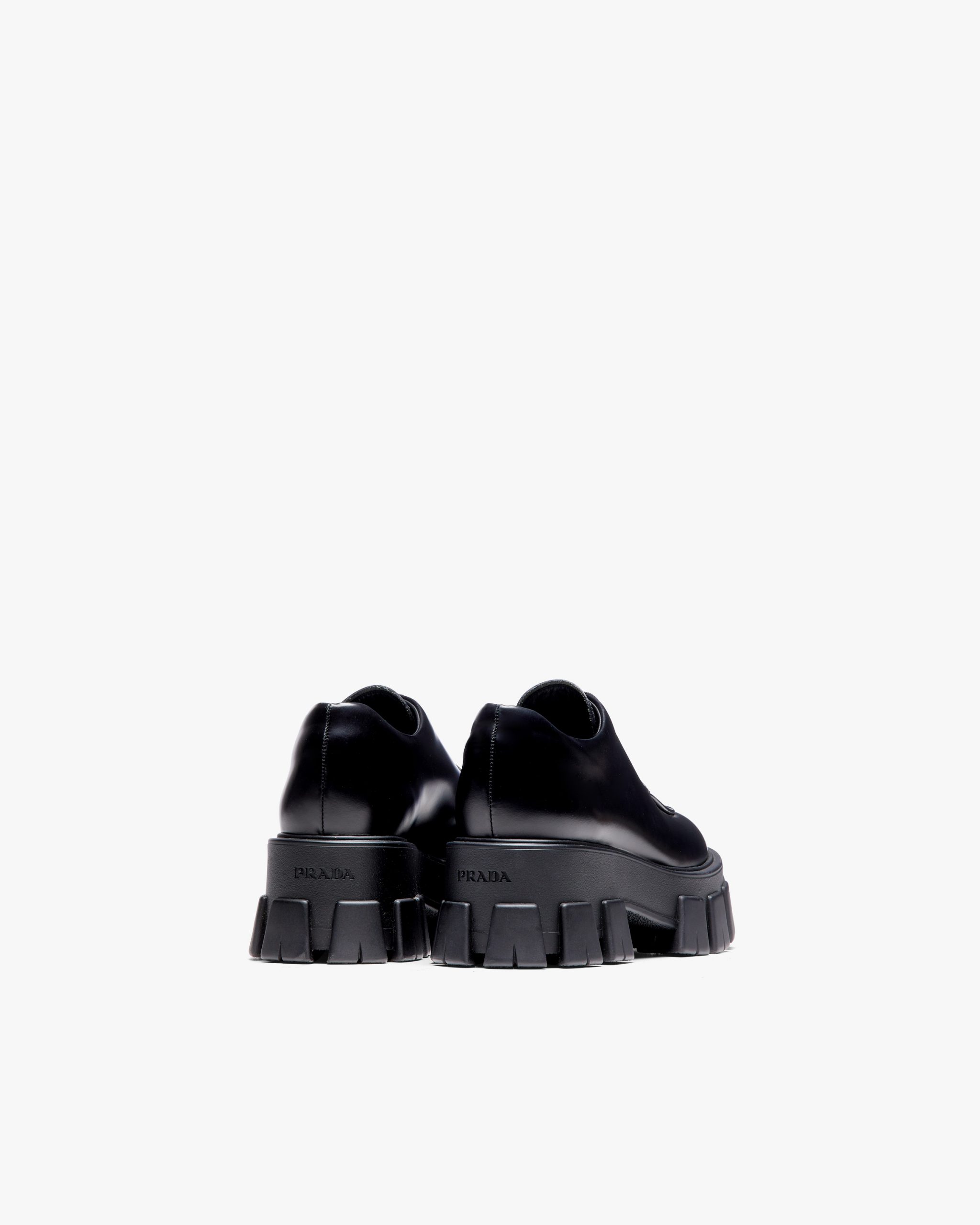 These Monolith lace-ups are made of elegant brushed leather, an iconic material of Prada. Named after its maxi rubber sole, this shoe is an expression of a timeless design, monolithic and unique for its research, innovation and style. The upper, inspired by formal footwear for men, creates a dialog with the lines of the sole inspired by the uniform, combining concepts like protection and modernism with the brand’s emblematic elegance.