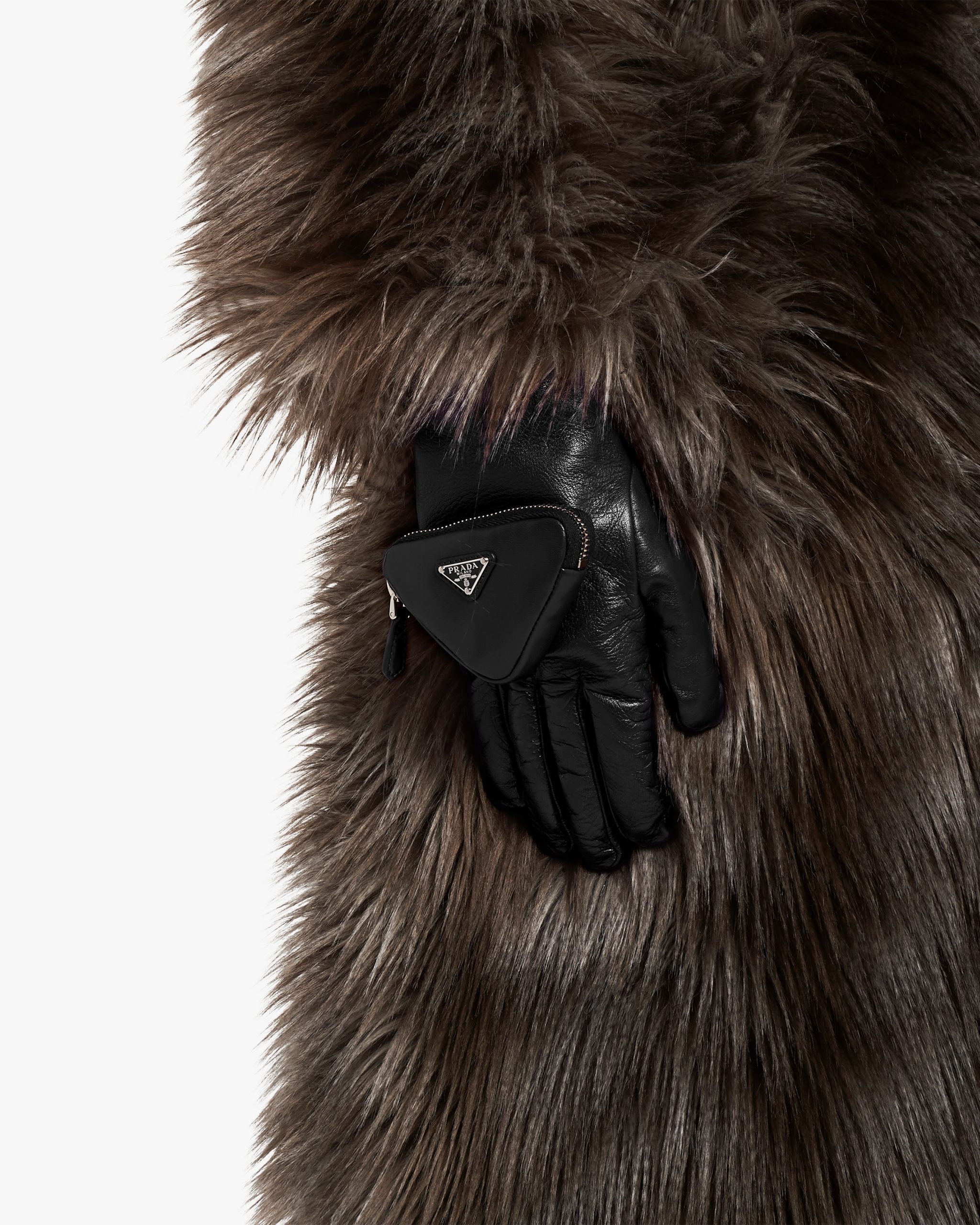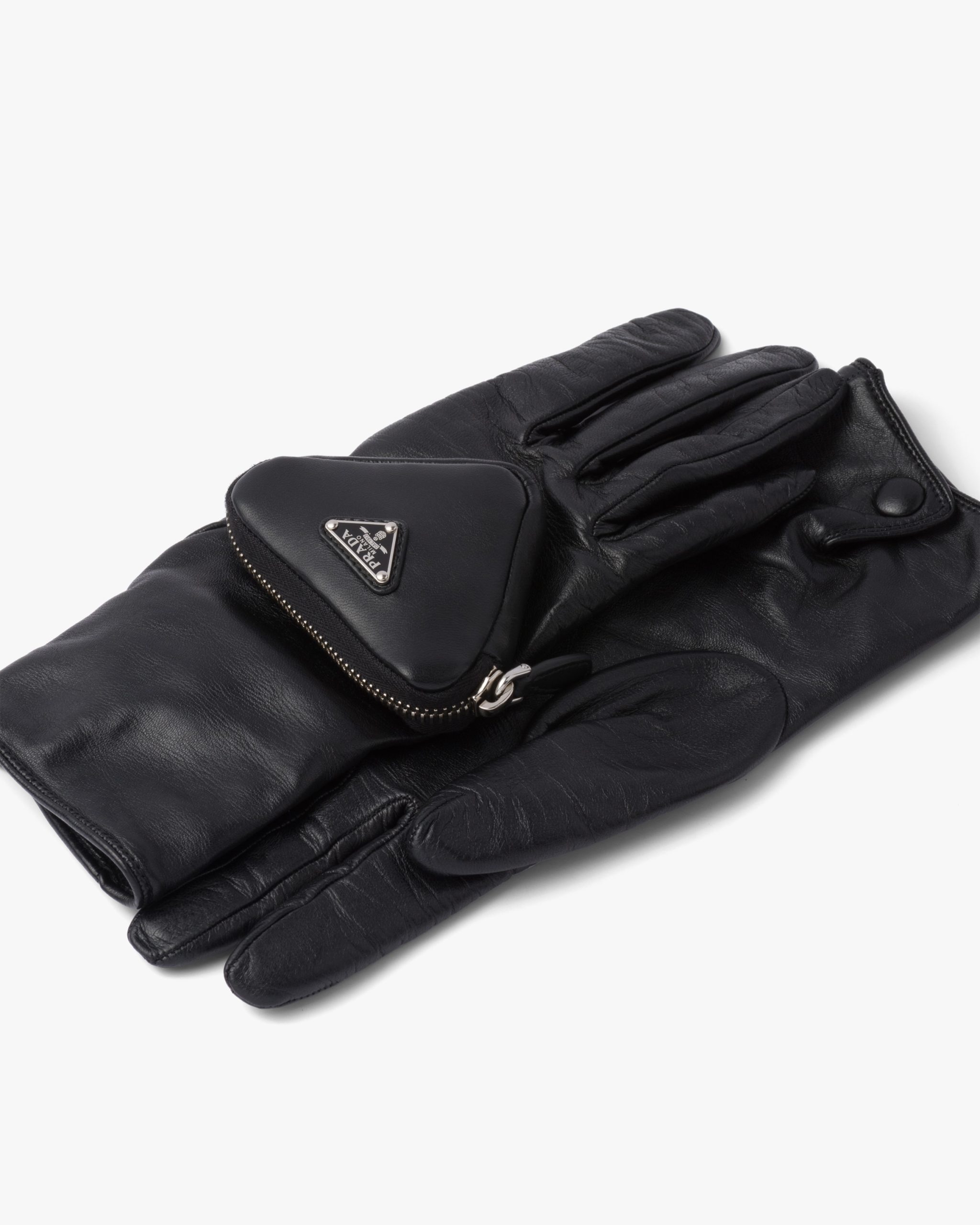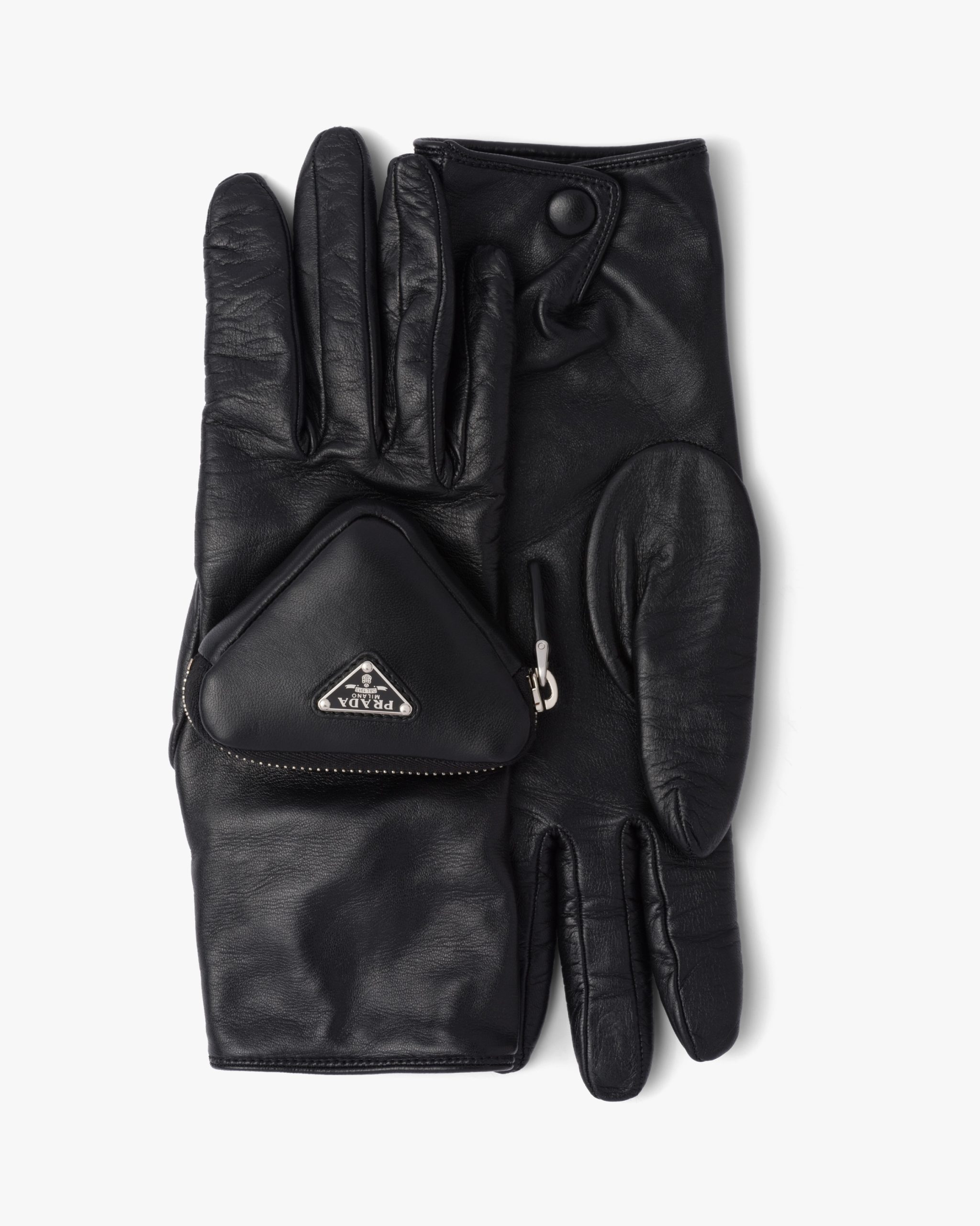 These gloves made of shiny nappa leather with a slightly irregular surface reminiscent of the leather used in the seventies come in a series of vibrant colors and more classic dark shades. The design is made modern by the small zipper pouch with enameled metal logo2 on one of the two gloves, an element that plays with the iconic triangle shape.