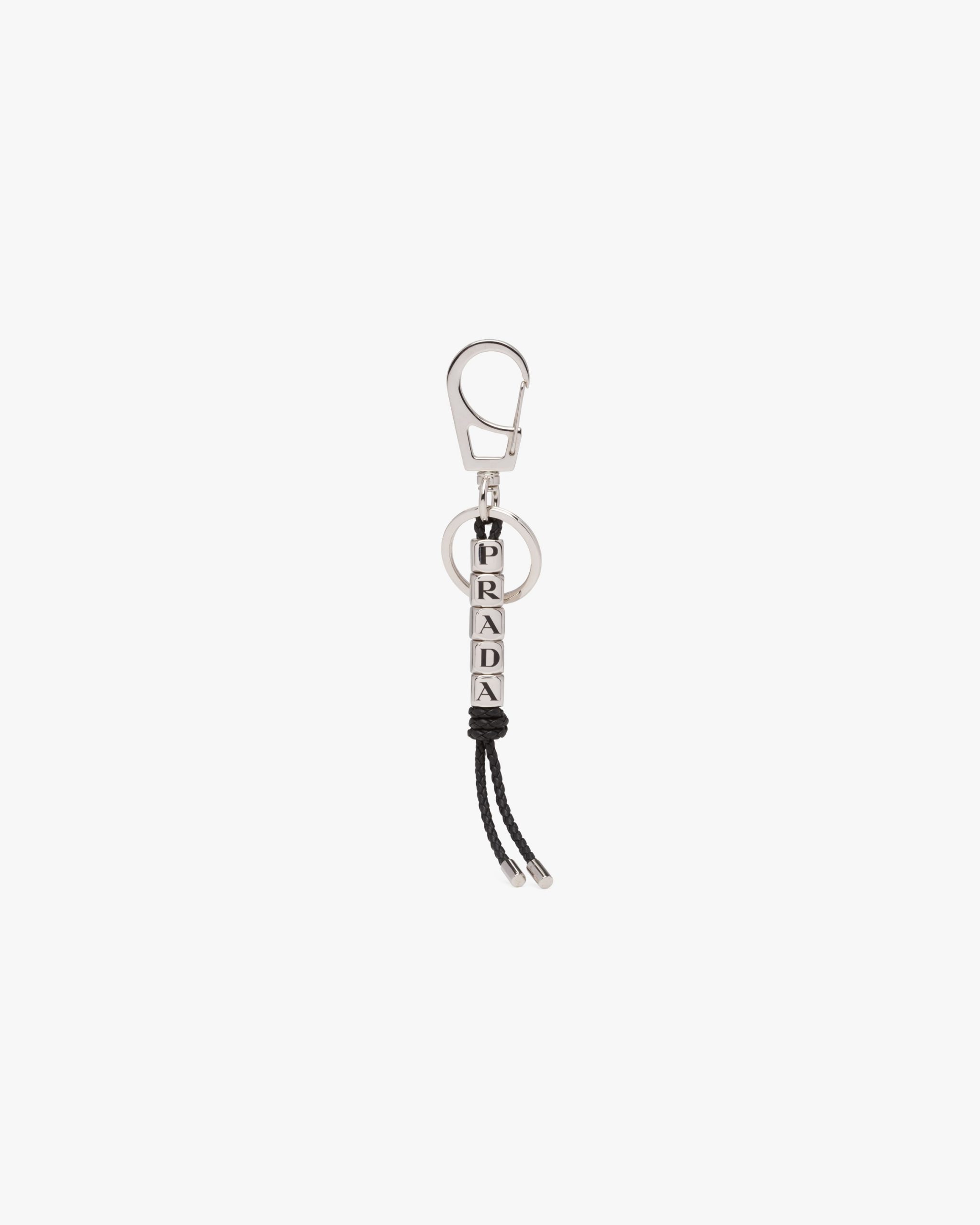 The letters that make up the name of Prada decorate the metal beads of this keychain complete with soft braided nappa leather.