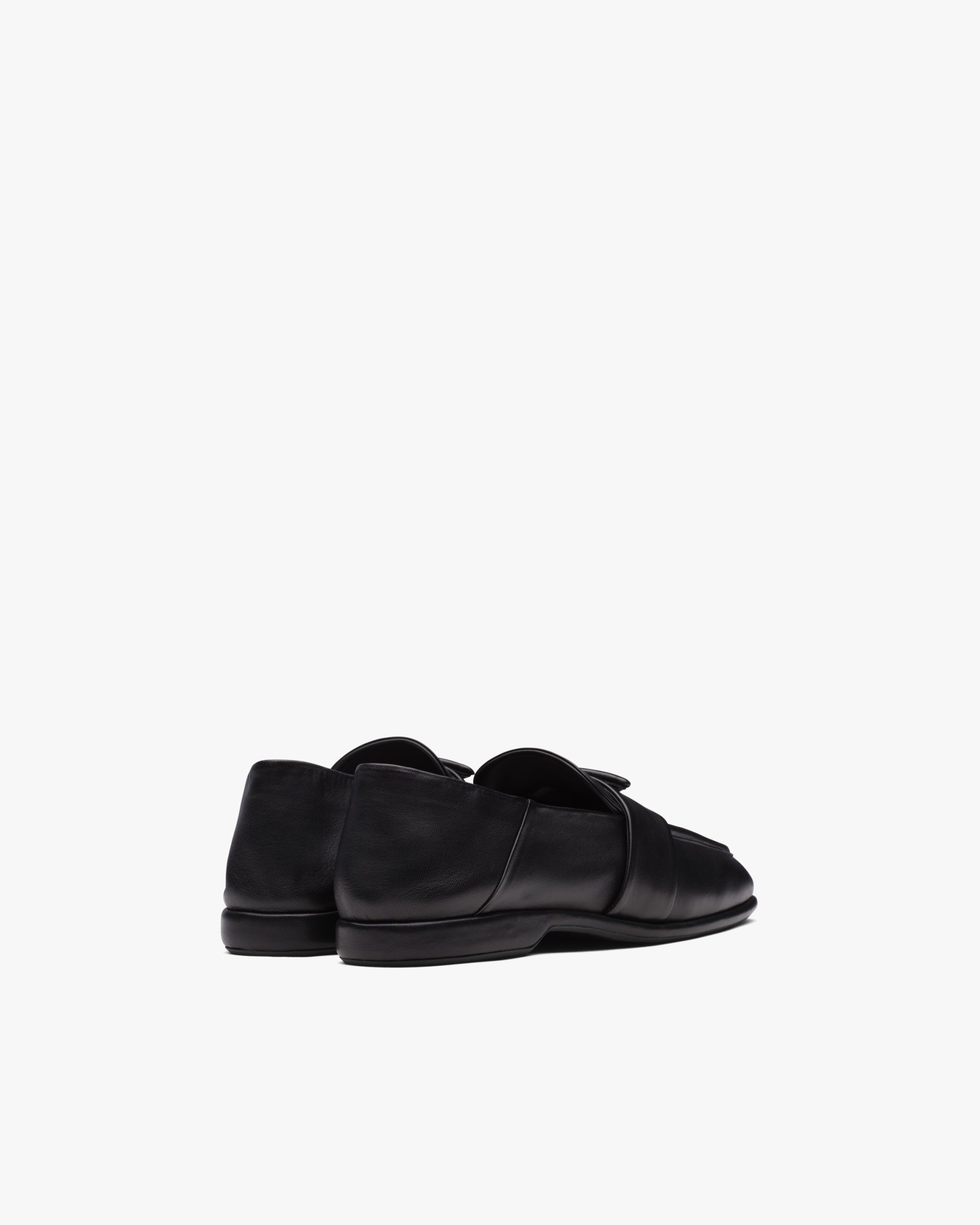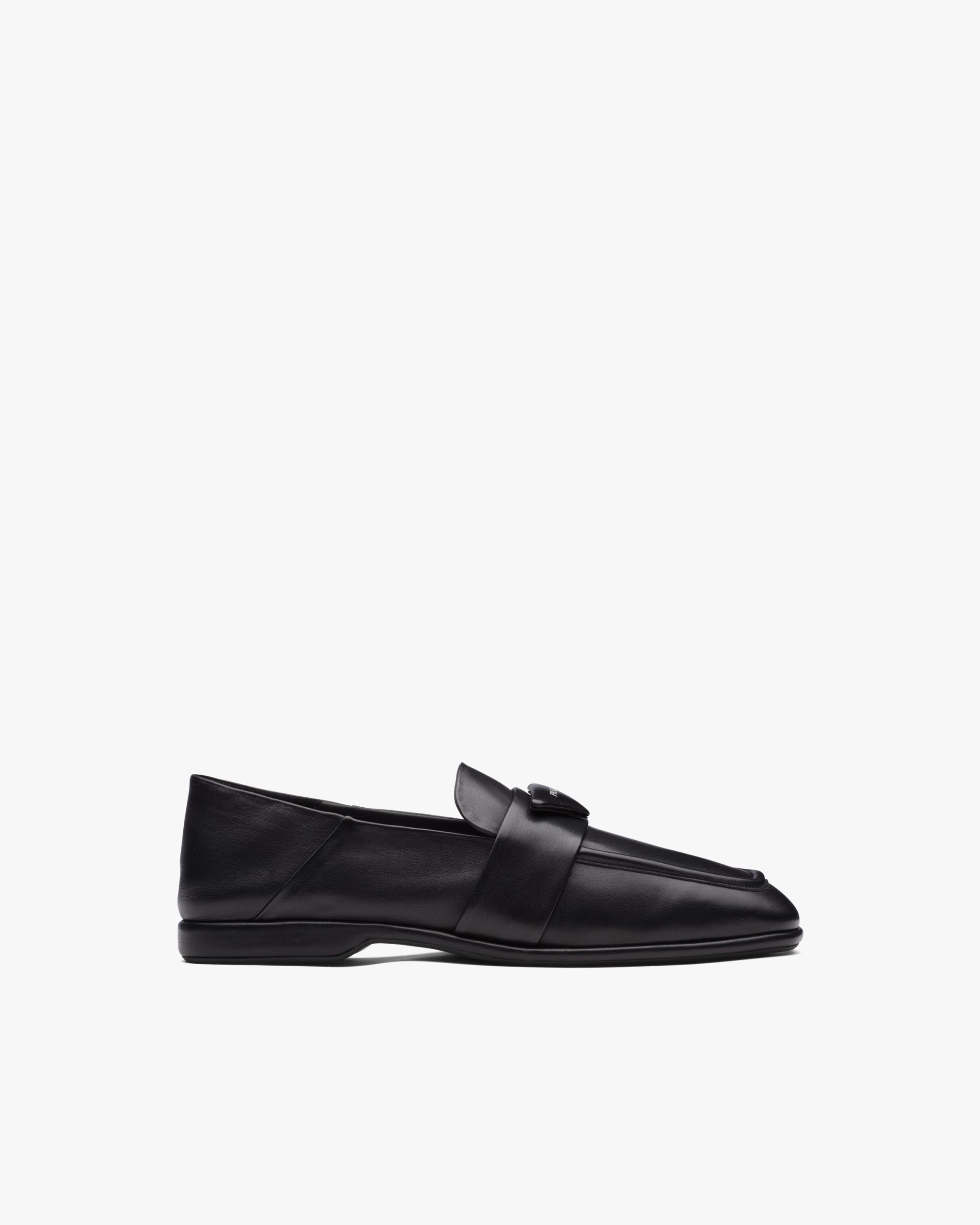 The iconic triangle comes in new variations, turning into a slightly padded leather element decorated with the screen-printed Prada logo2. The detail decorates this pair of soft nappa leather loafers with elegant charm.