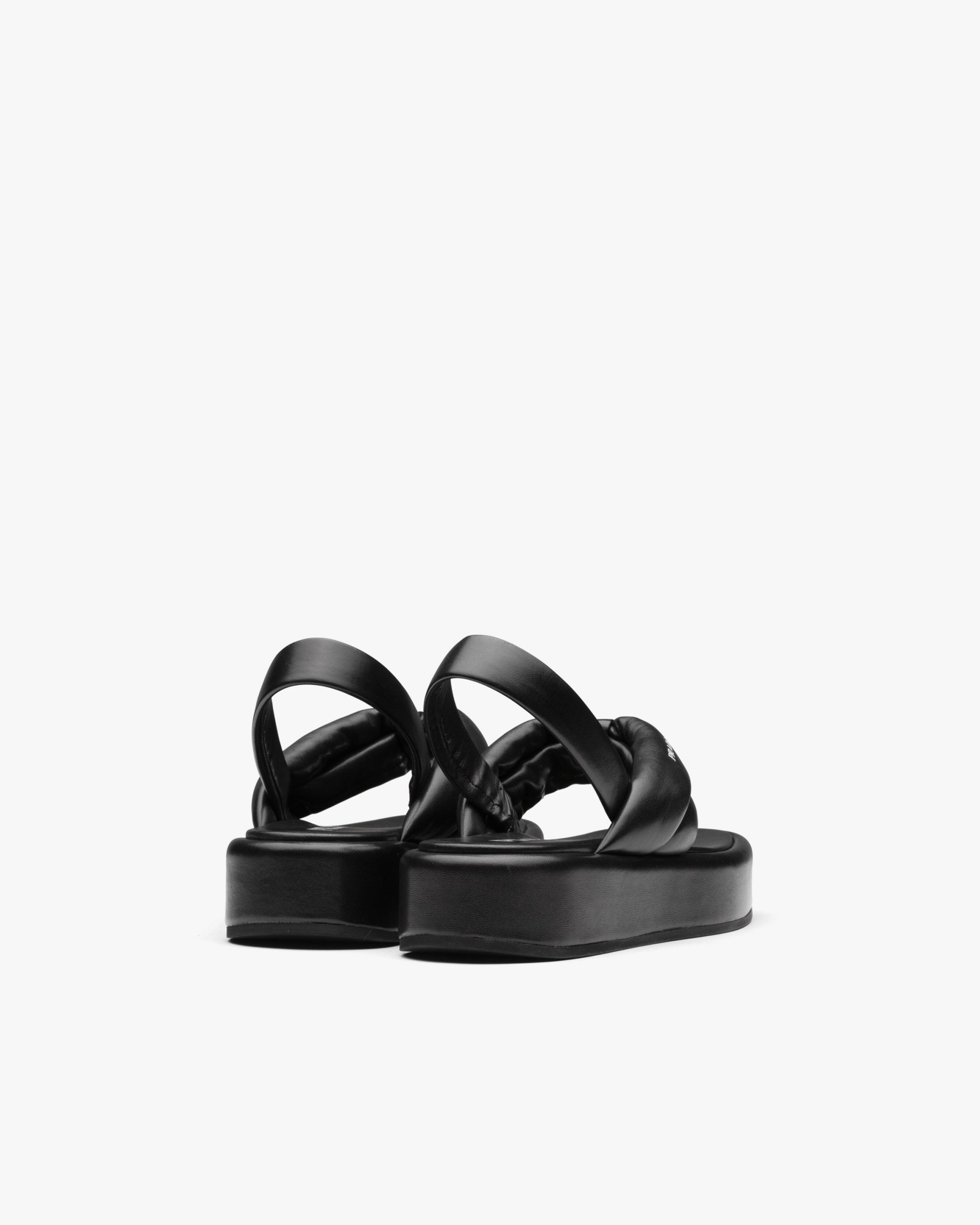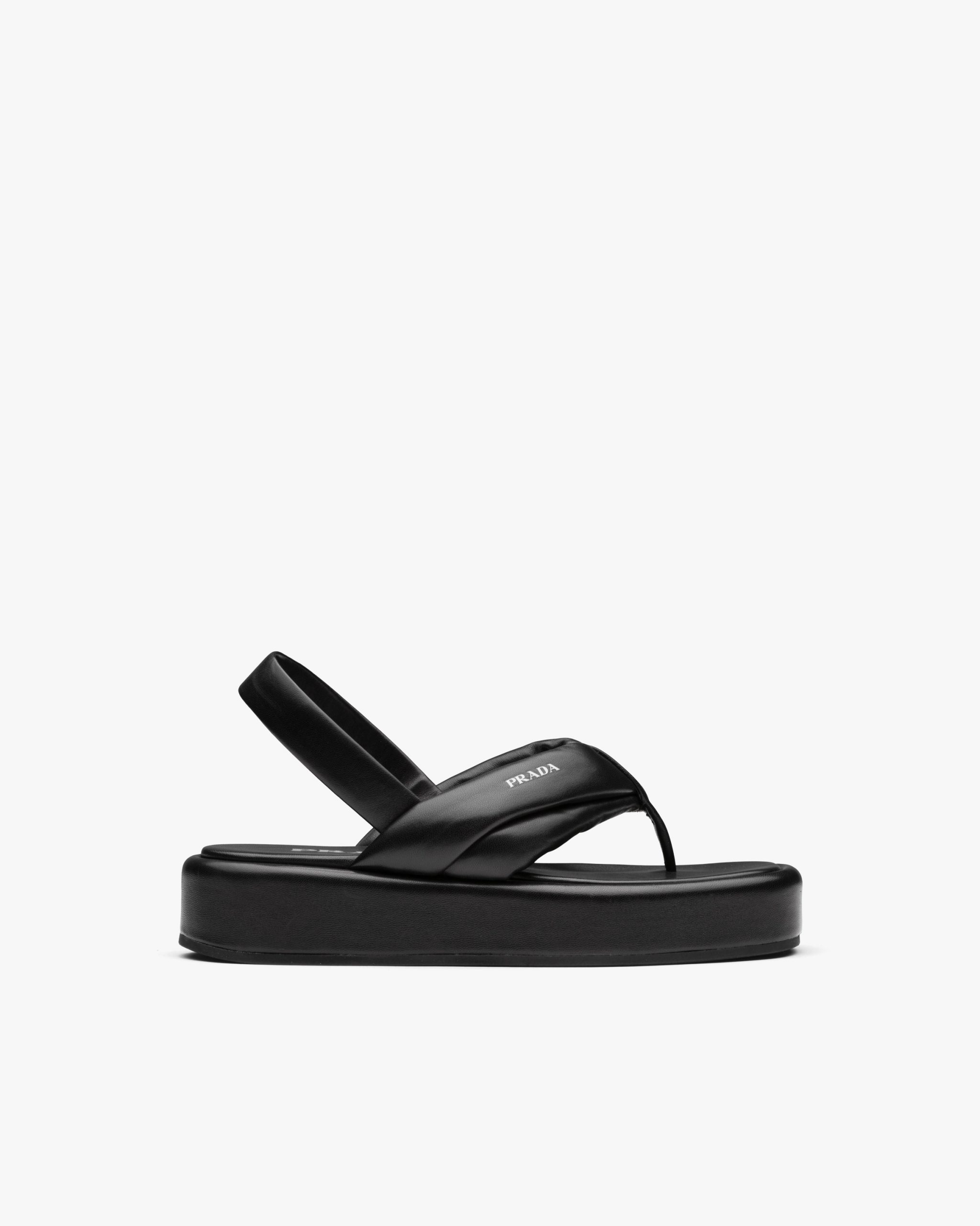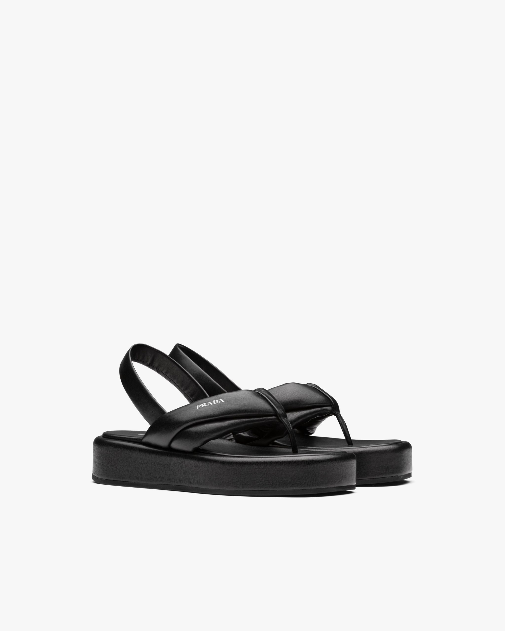 Volume, soft lines and references to the 90s define these thong sandals on a leather-covered flatform sole. The soft nappa leather tubular straps meet on the front and are accented by the Prada logo2.