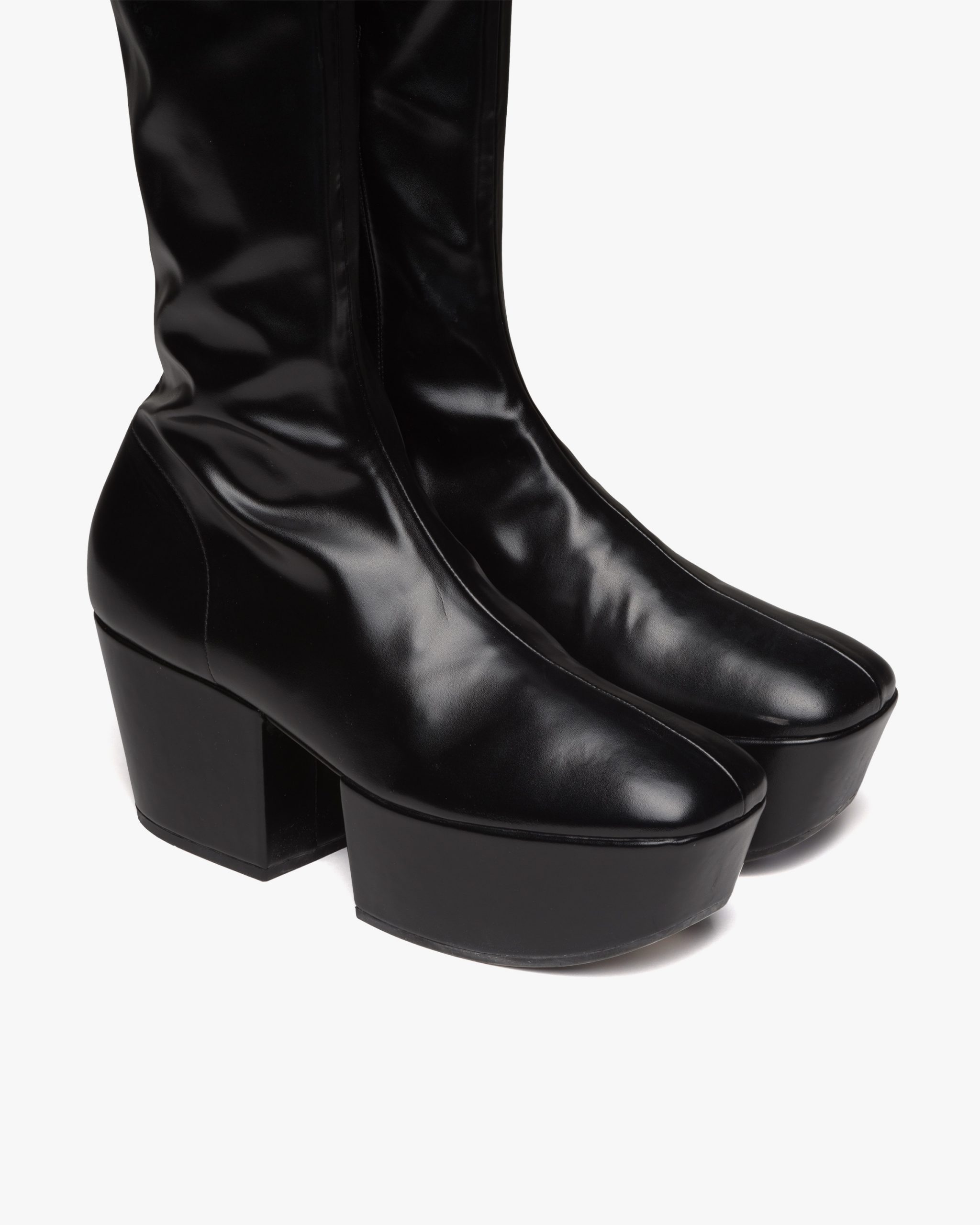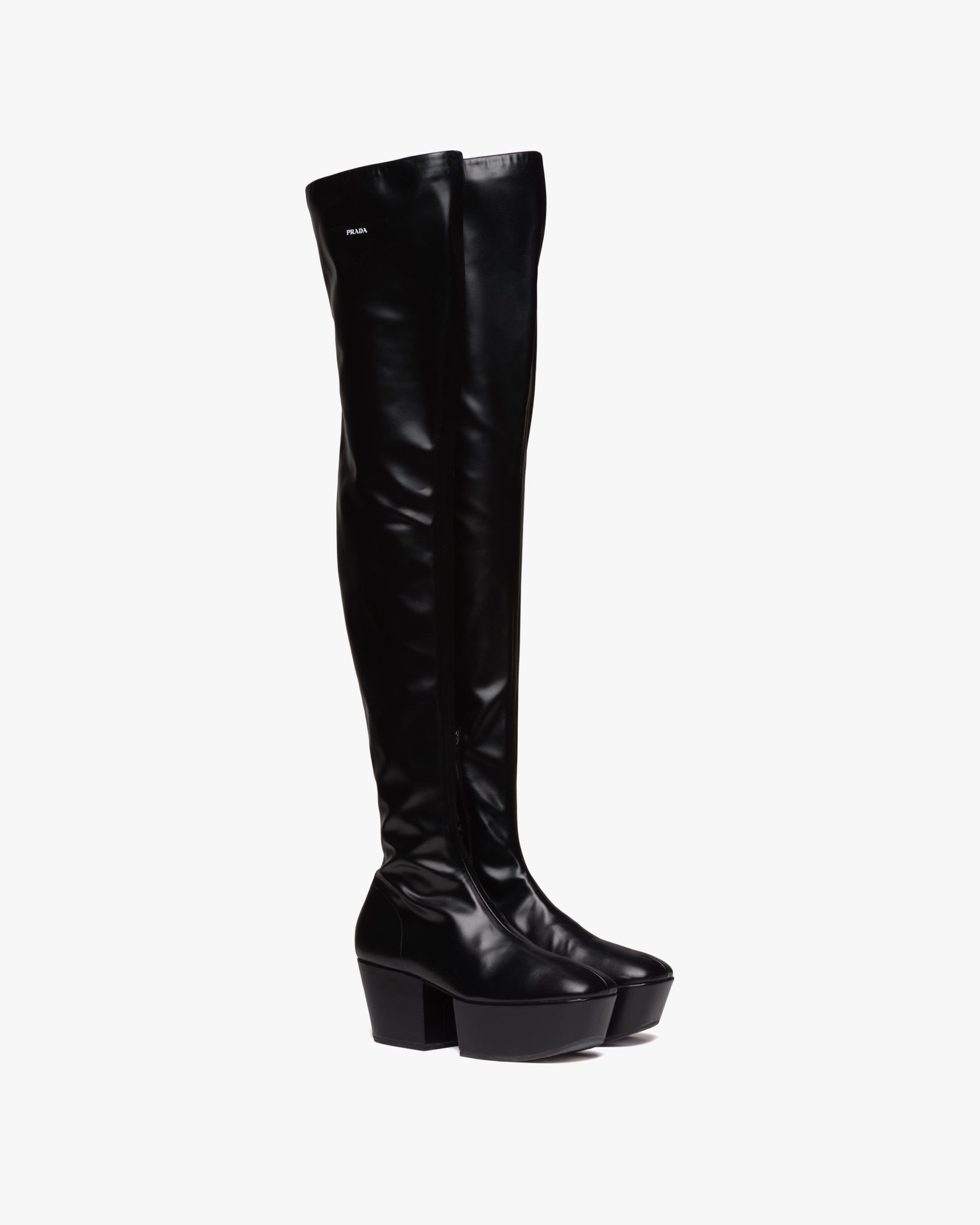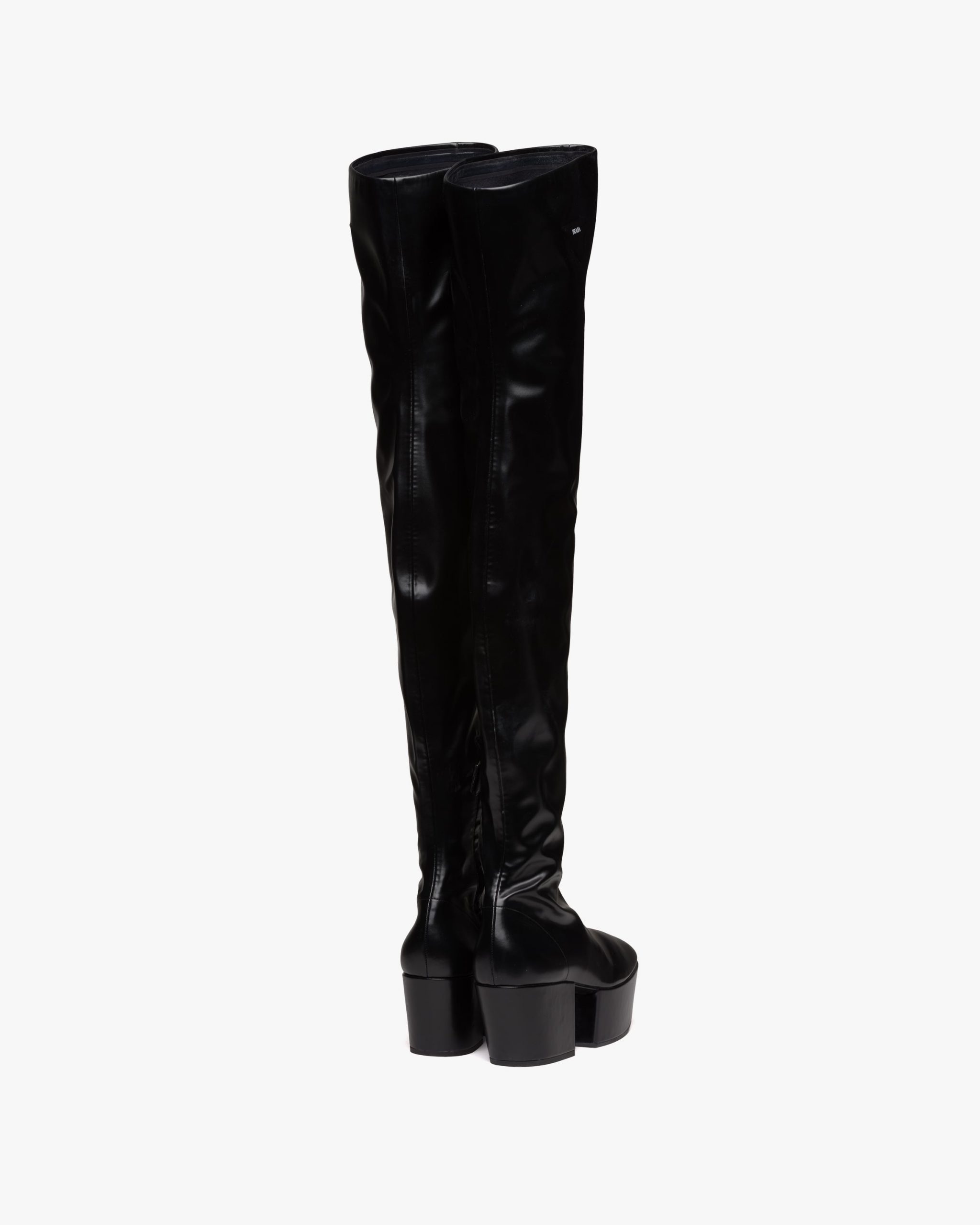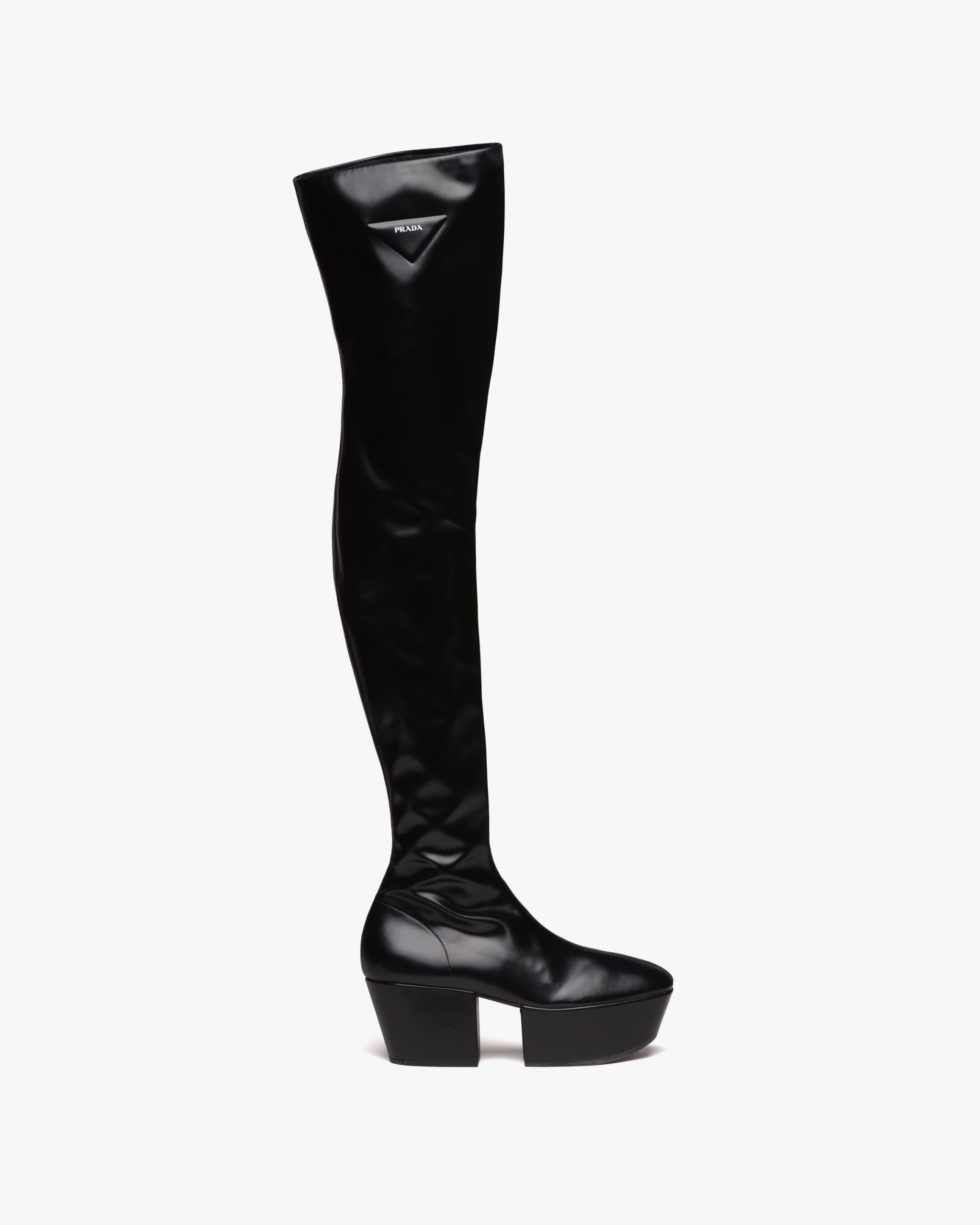 Defined by a platform that recalls architectural geometric shapes of the seventies, these over-the-knee boots are made of soft nappa tech, an innovative material. Infused with a modernist soul, the design reinterprets retro lines in a new way. The screen-printed triangle logo2 gives the product an iconic accent.