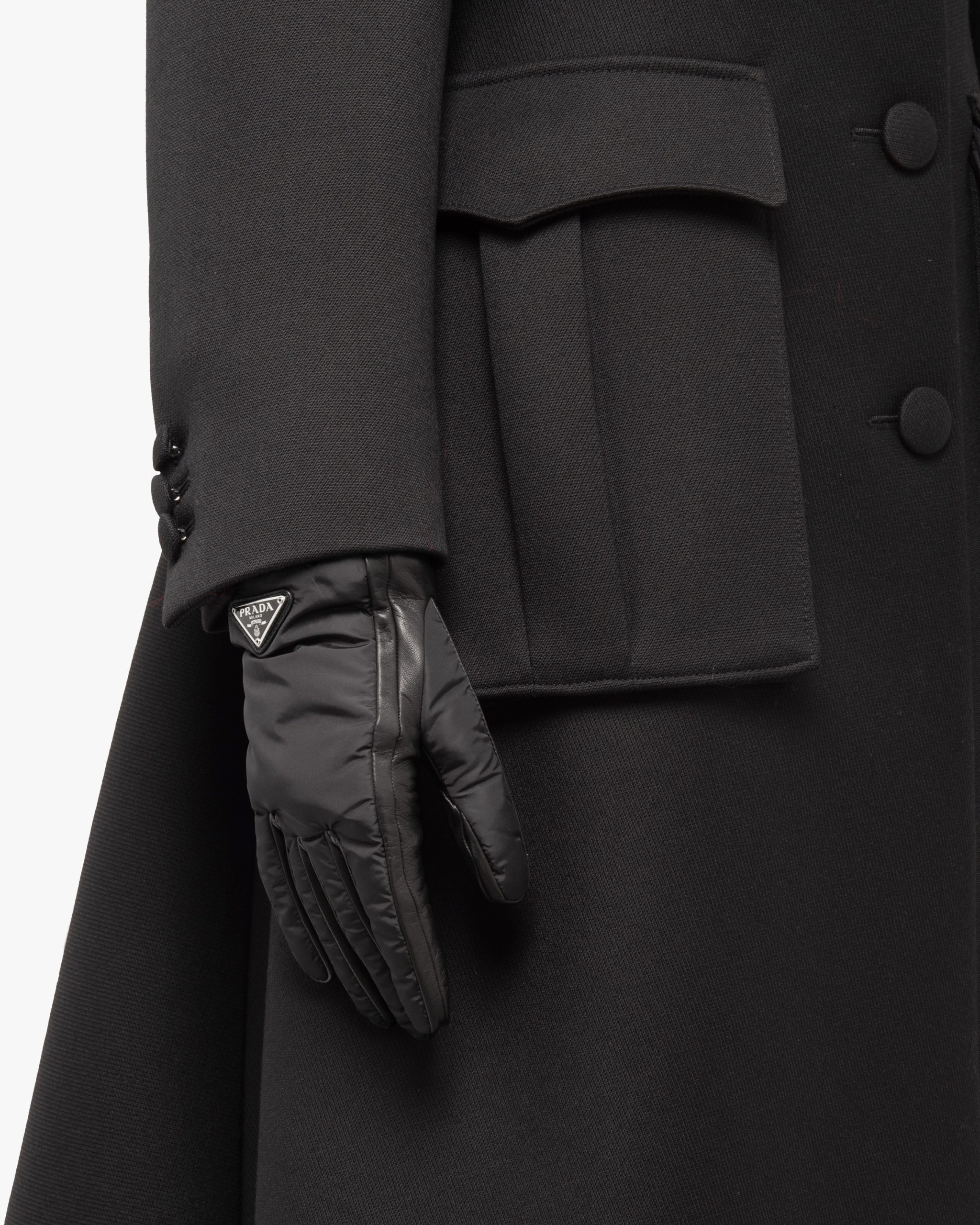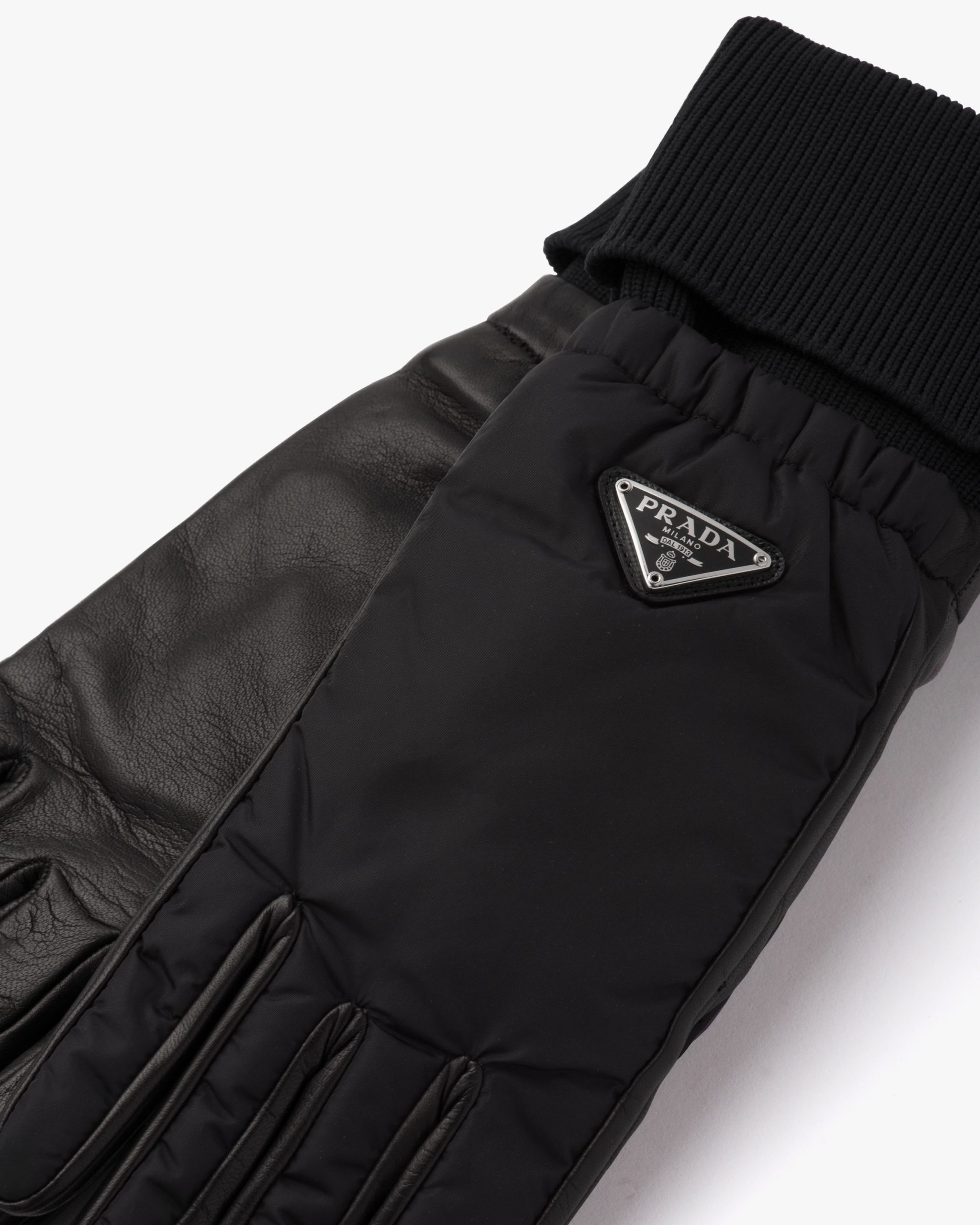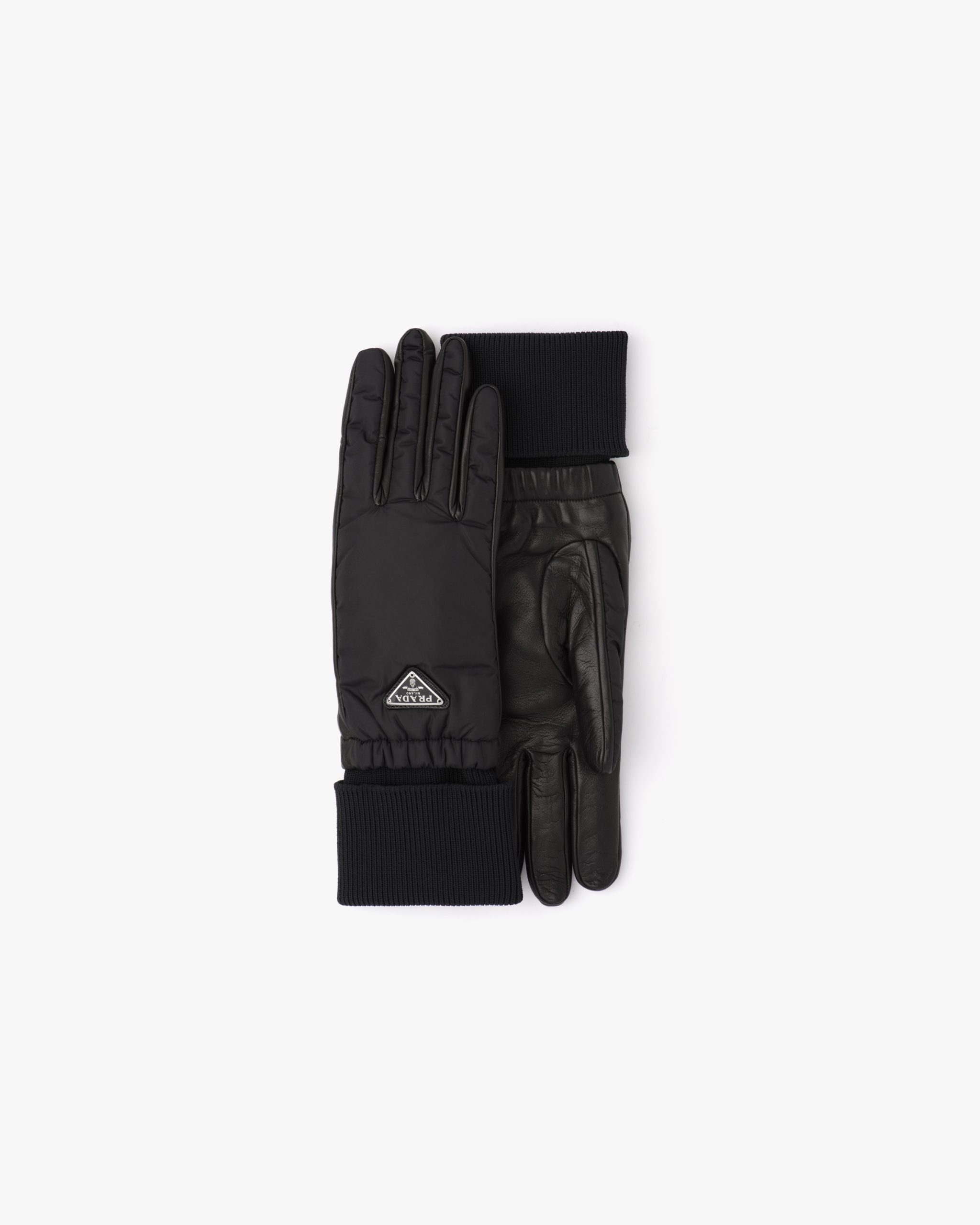 These gloves made of iconic Prada nylon have ribbed knit cuffs. With a nappa leather palm and soft cashmere lining, they are decorated with the enameled metal triangle logo2.