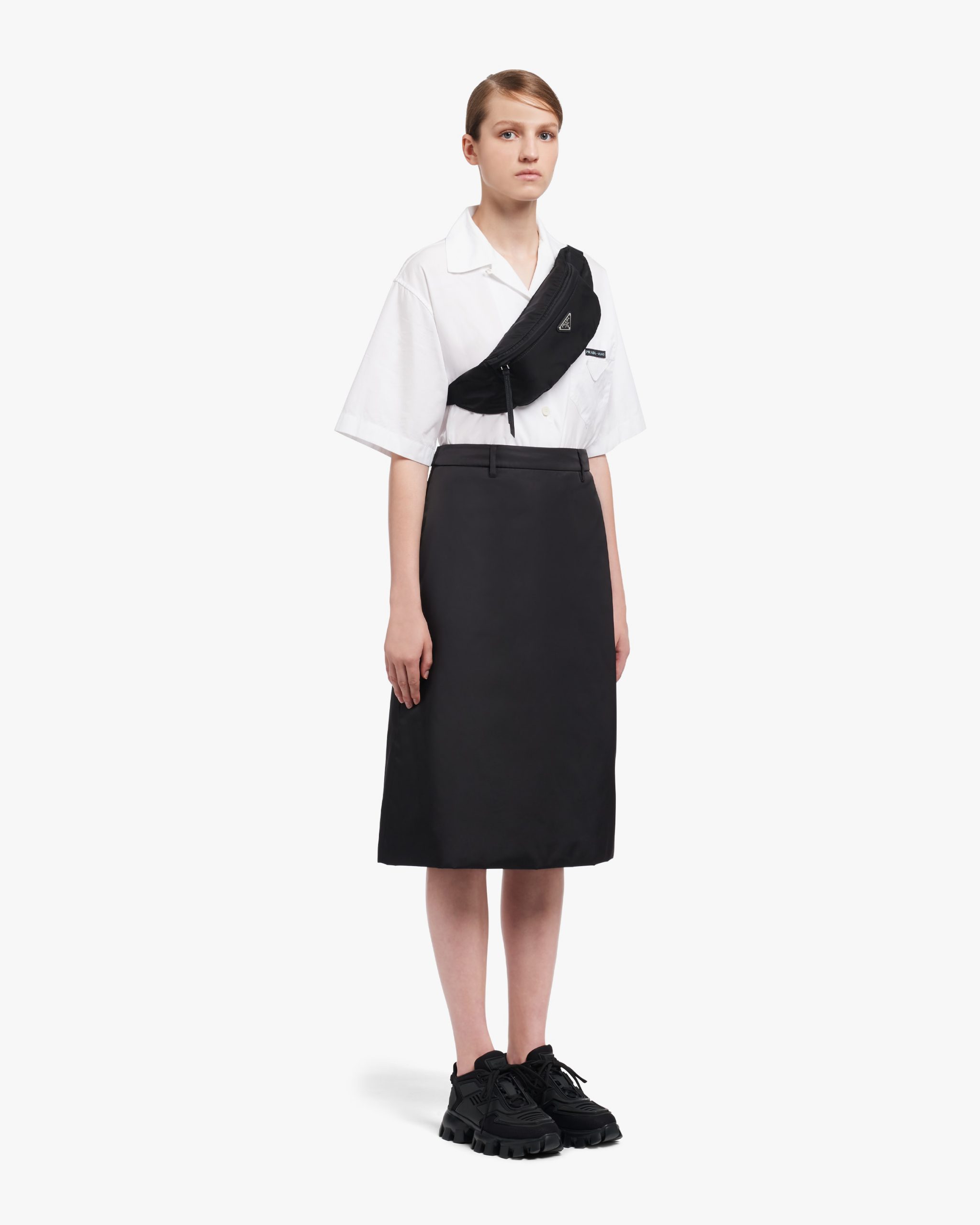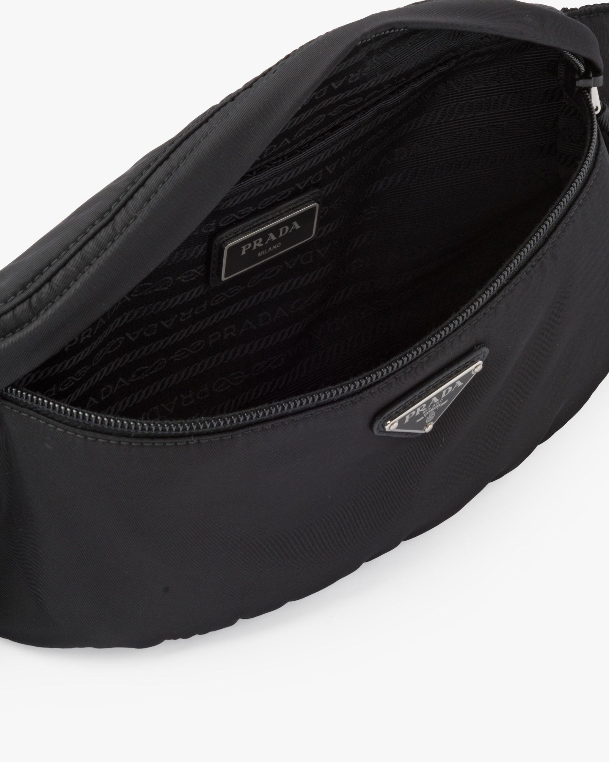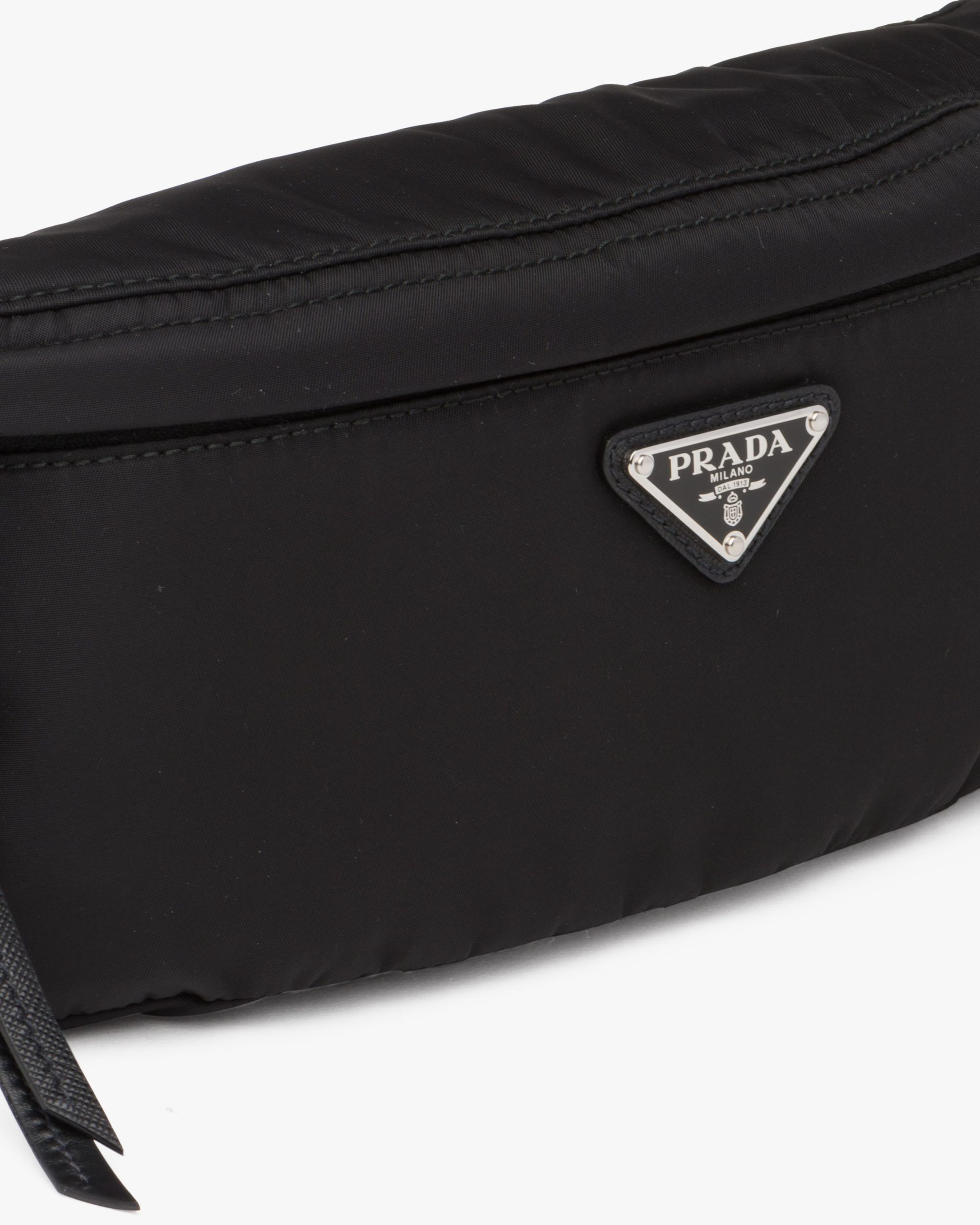 Influences from streetwear define this belt bag made of nylon, an iconic material of the brand that was first introduced in the luxury world by Prada. The enameled metal triangle logo2 accents the front.