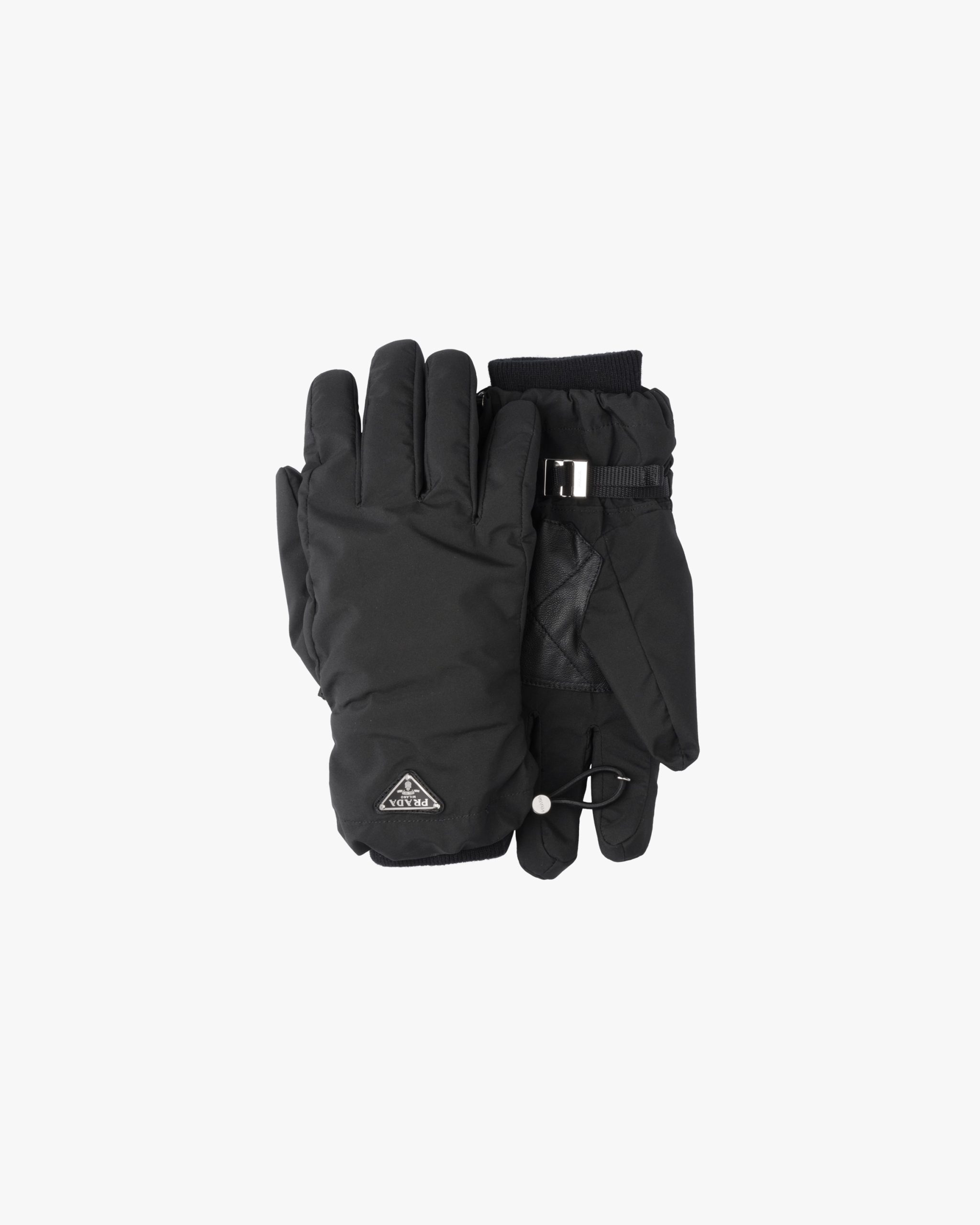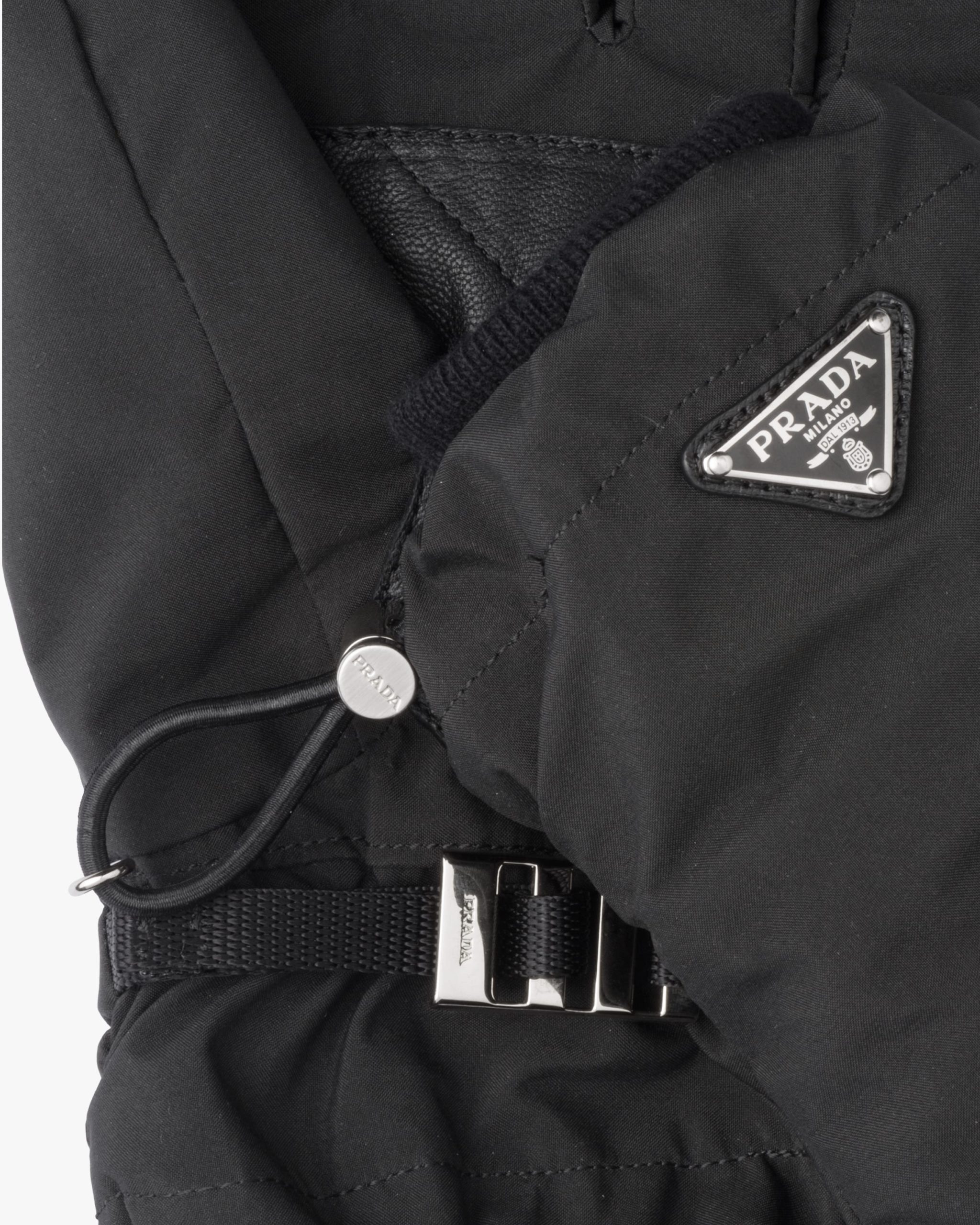 Nylon gloves with tonal leather inserts, drawstring on the cuff and small strap with buckle. They are decorated with the iconic enamel triangle logo2.
