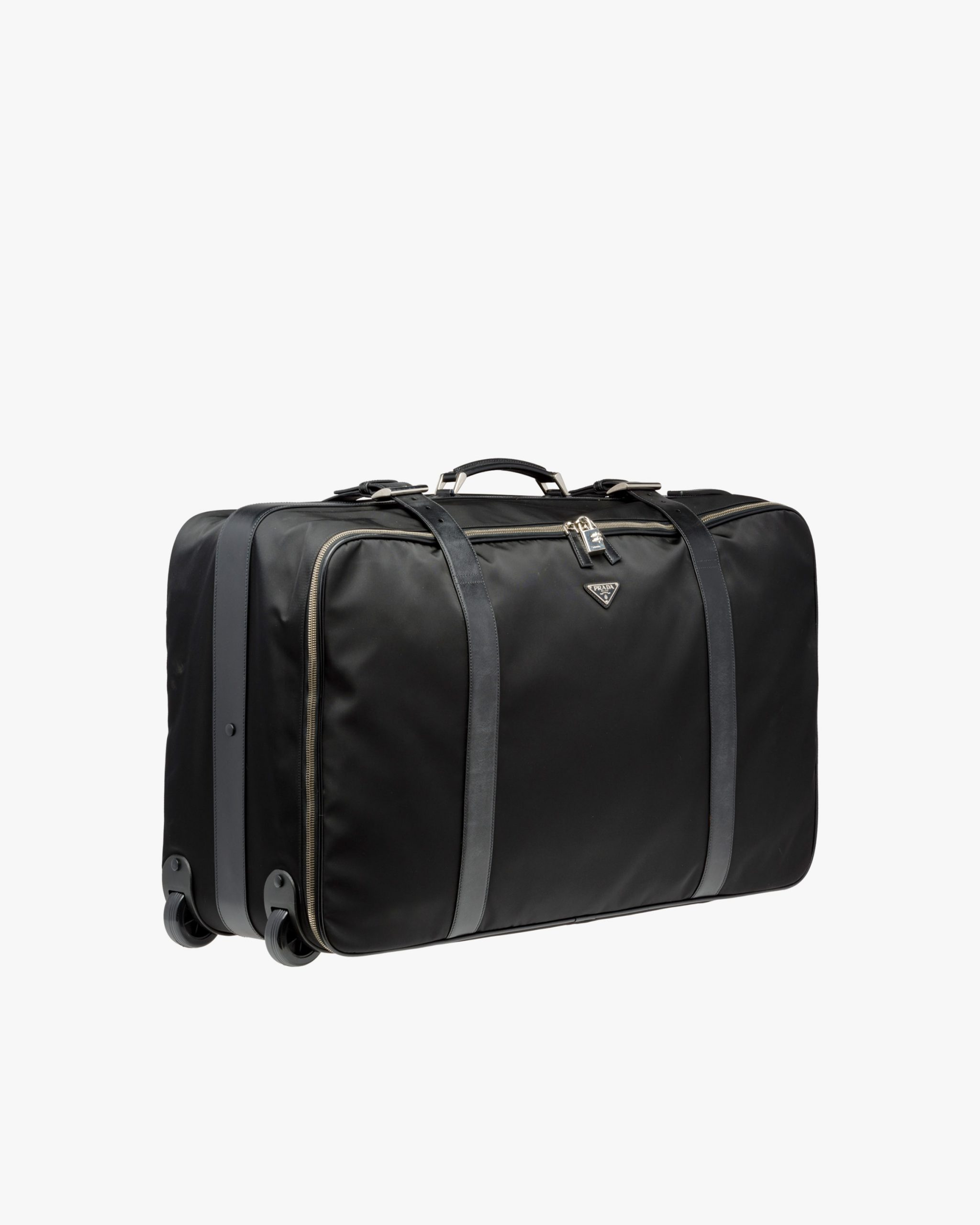 A semi-hardsided suitcase detailed with Prada logo2, combination lock and name tag. The two-way zipper opens onto one compartment with straps for securing clothes. There are two wheels and a detachable strap.