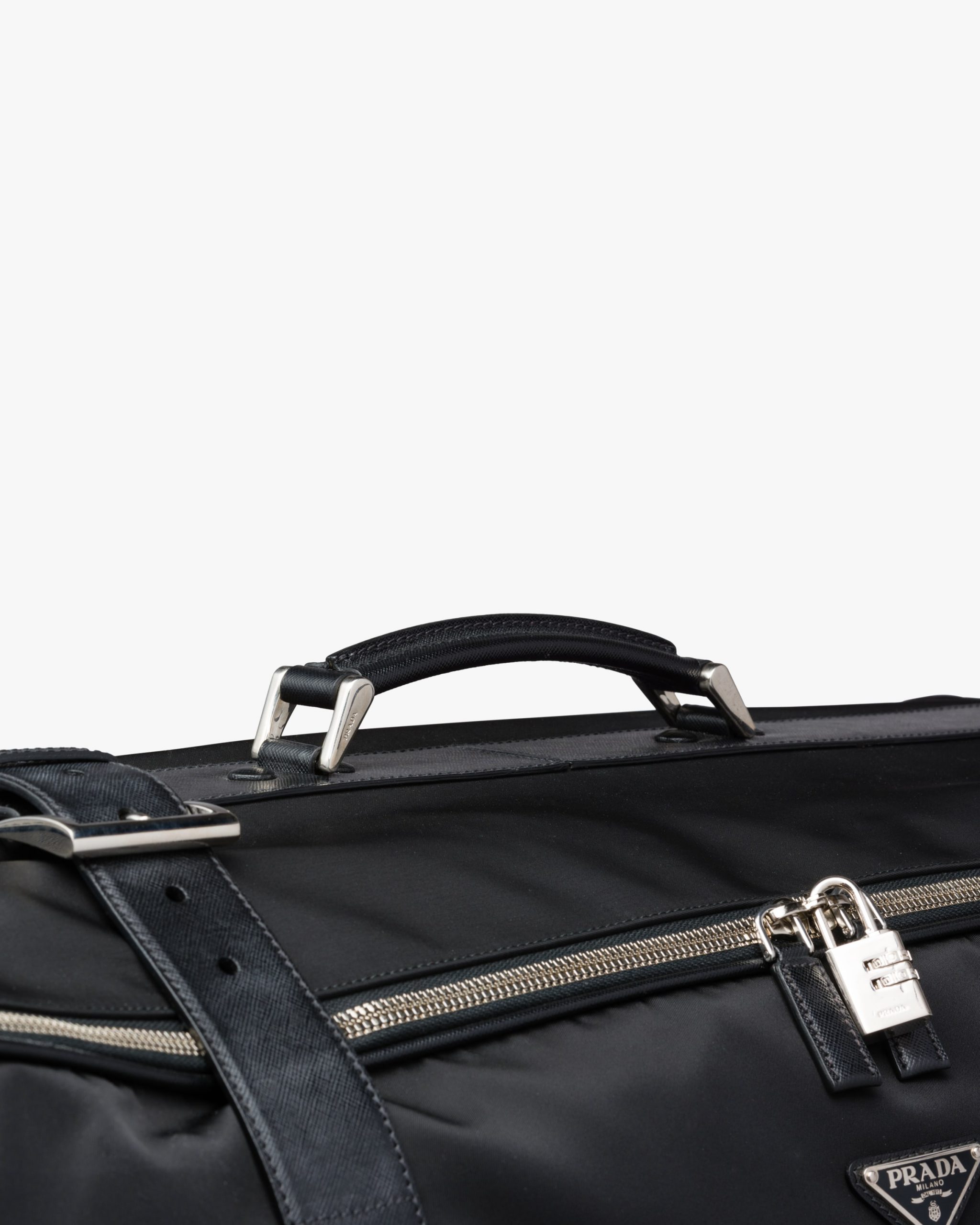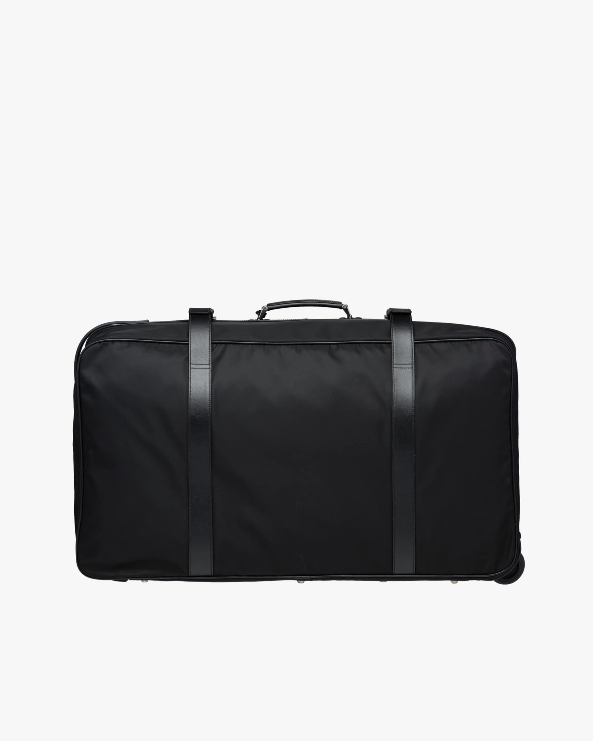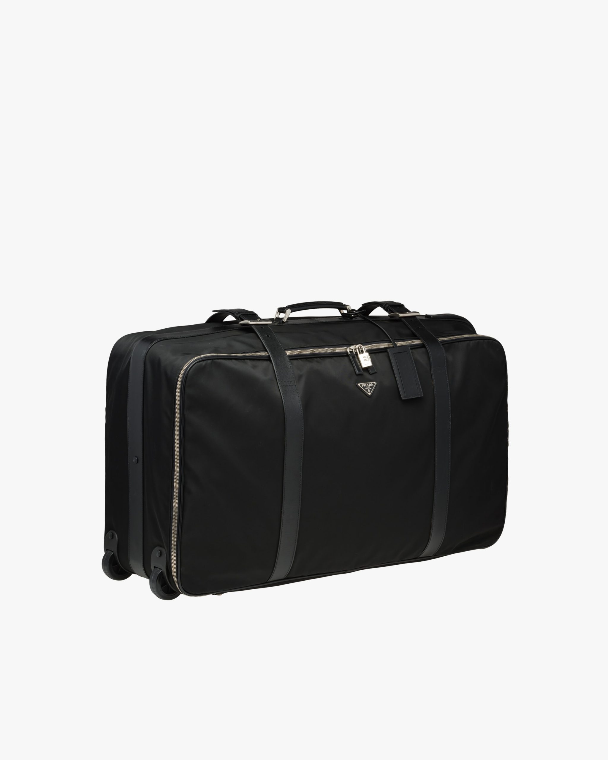 A semi-hardsided suitcase detailed with Prada logo2, combination lock and name tag. The two-way zipper opens onto one compartment with straps for securing clothes. There are two wheels and a detachable strap.
