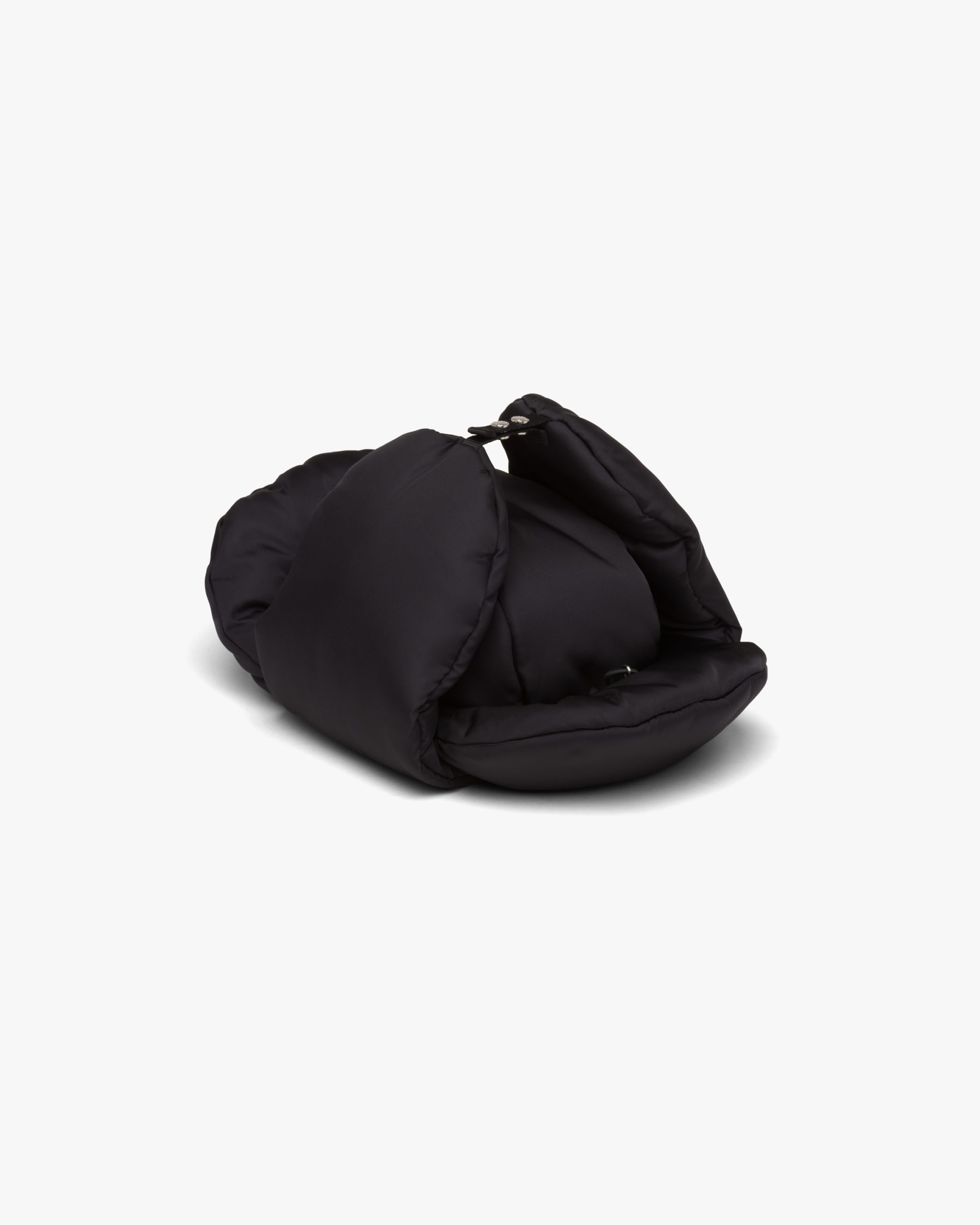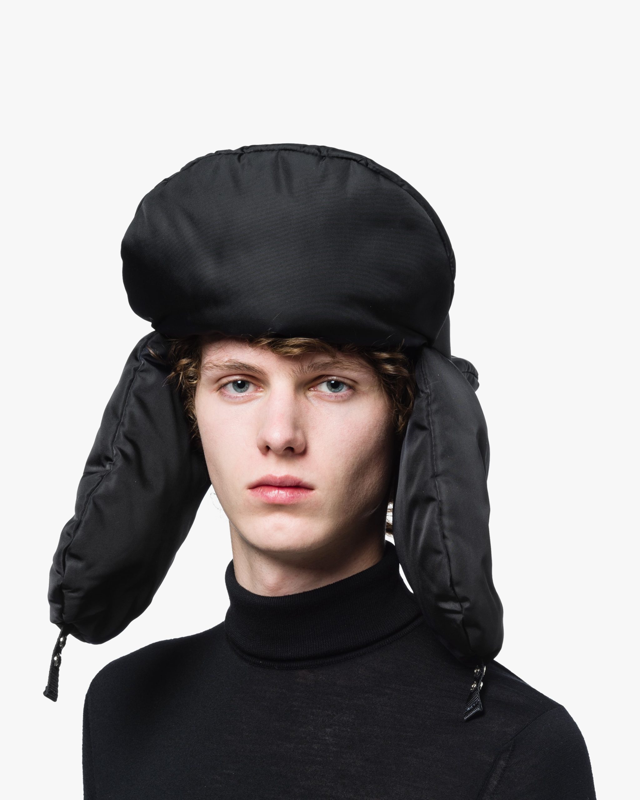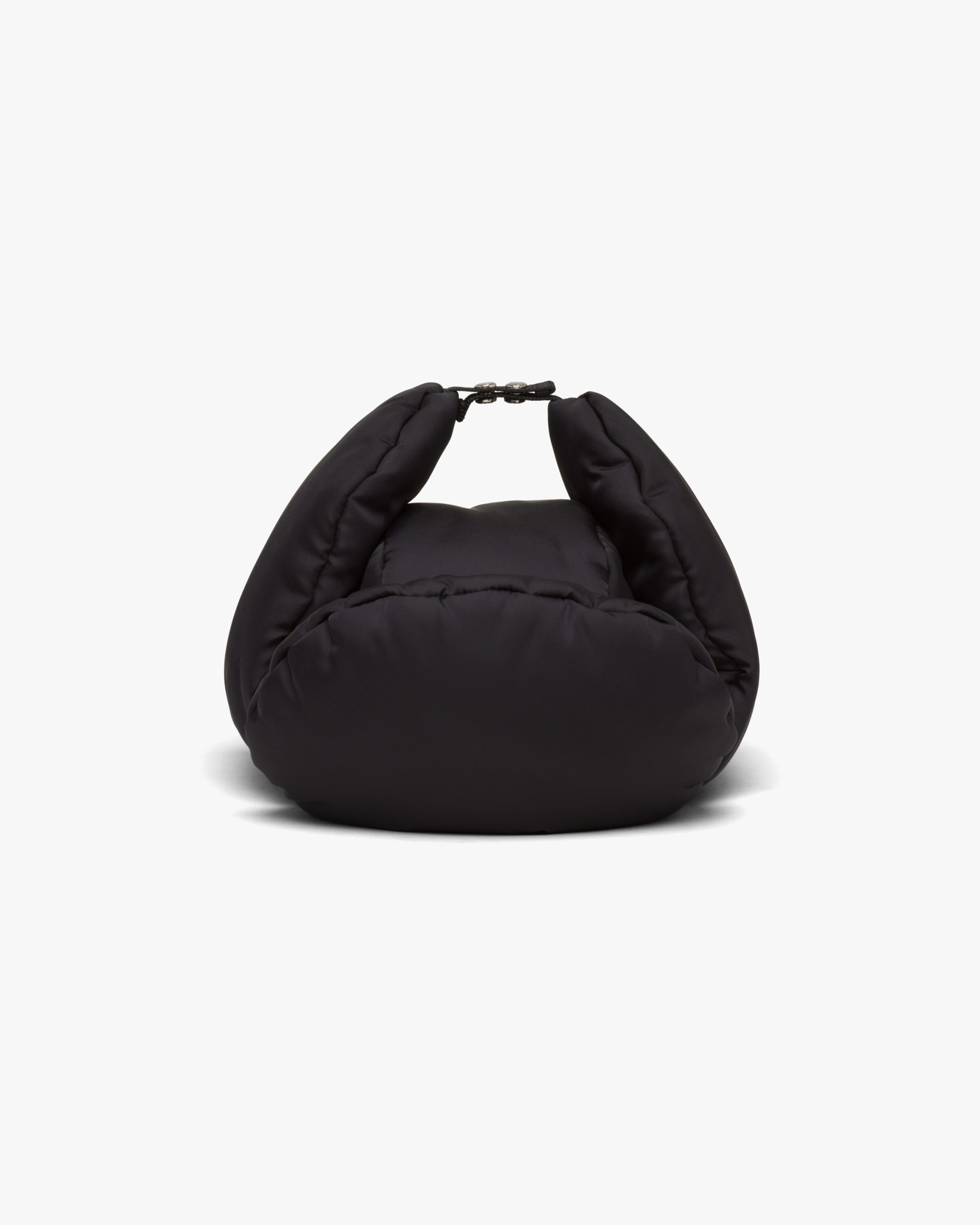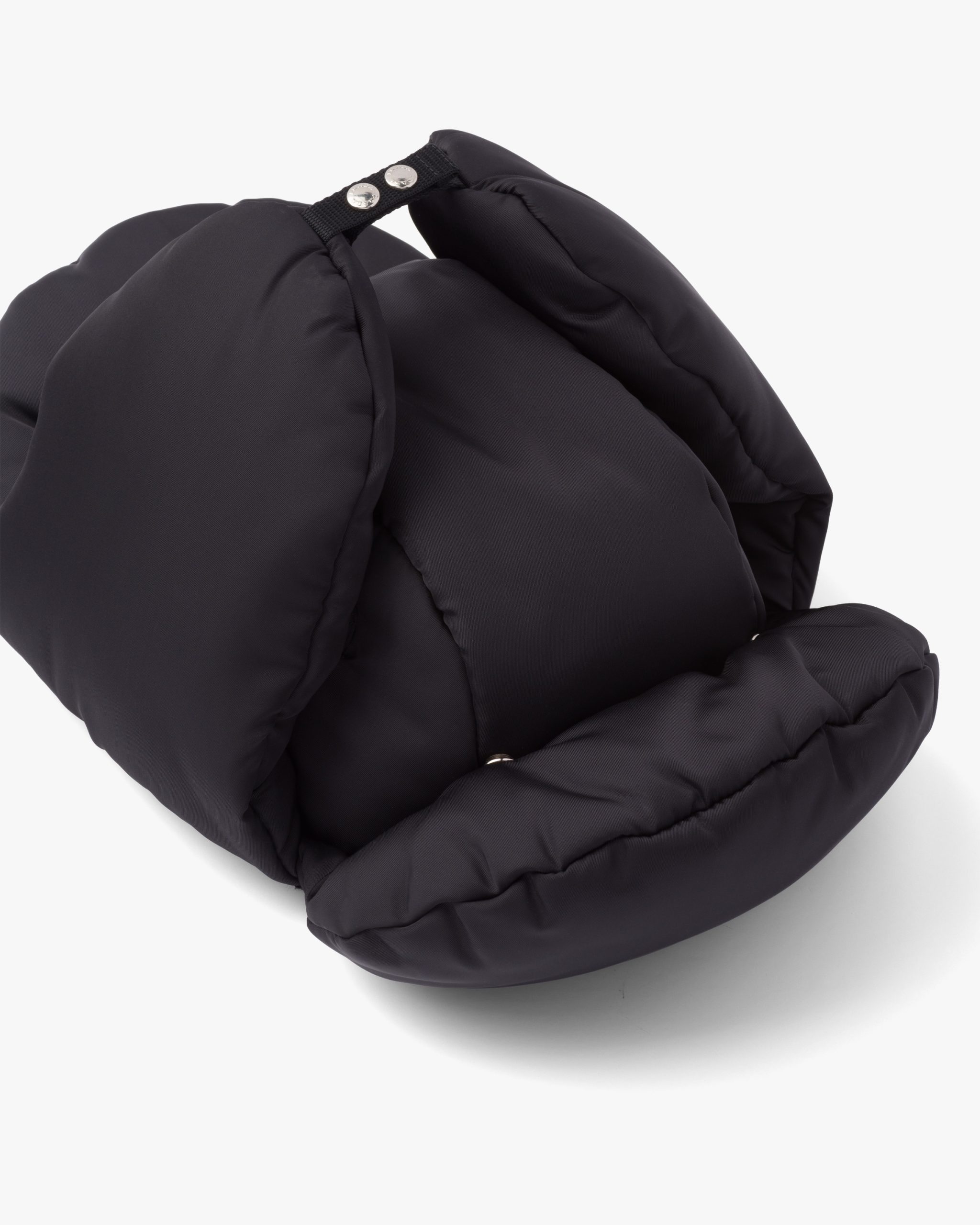 Padded nylon hat with ear flaps with snaps and drawstring on the back.