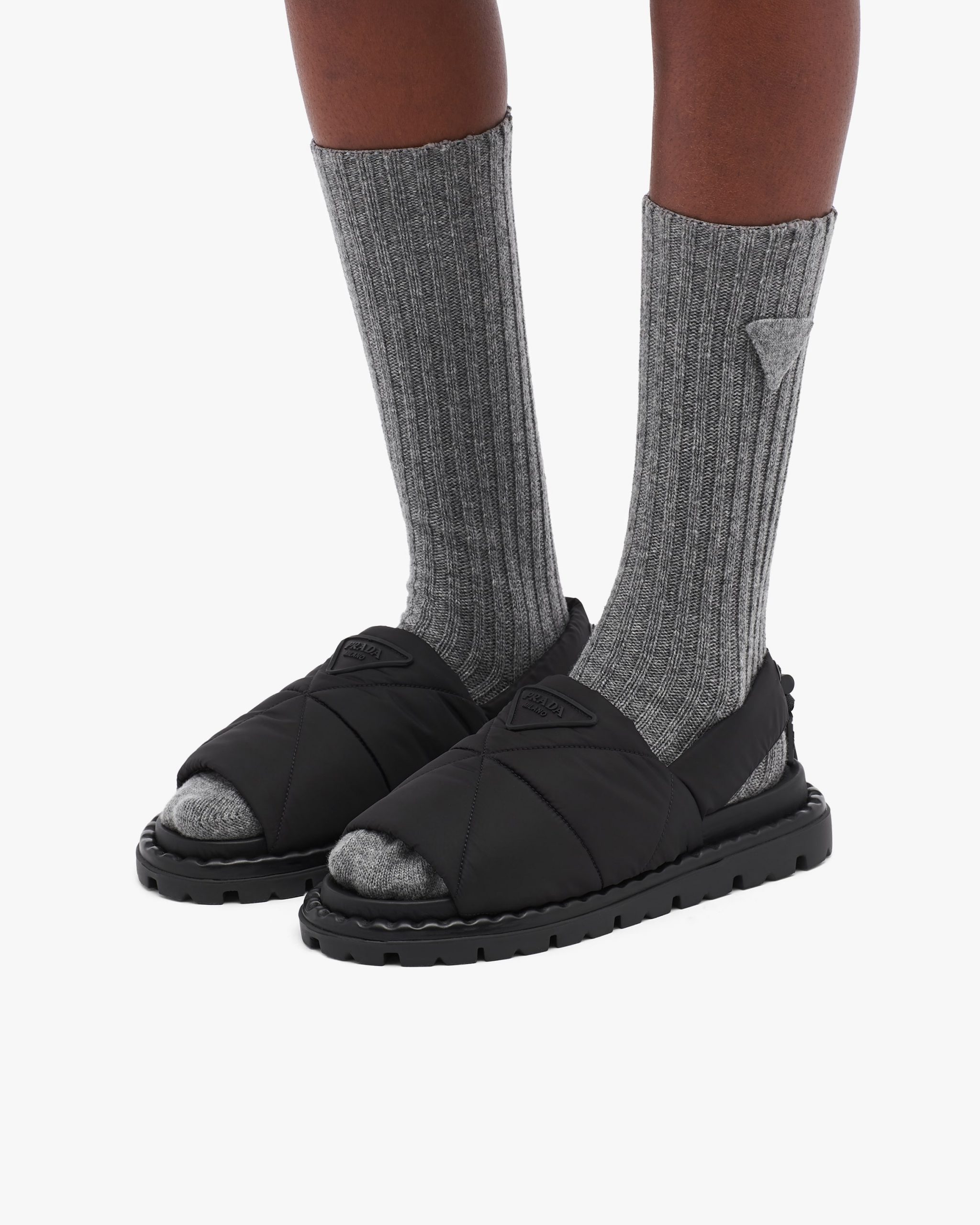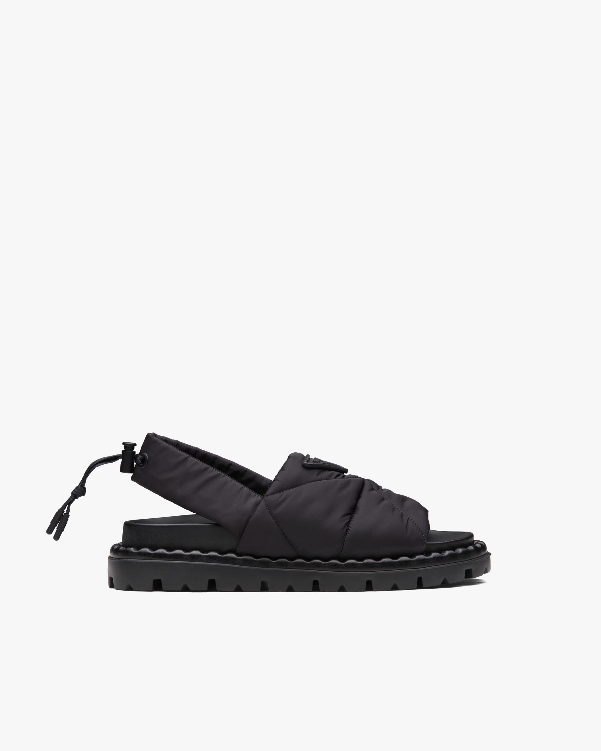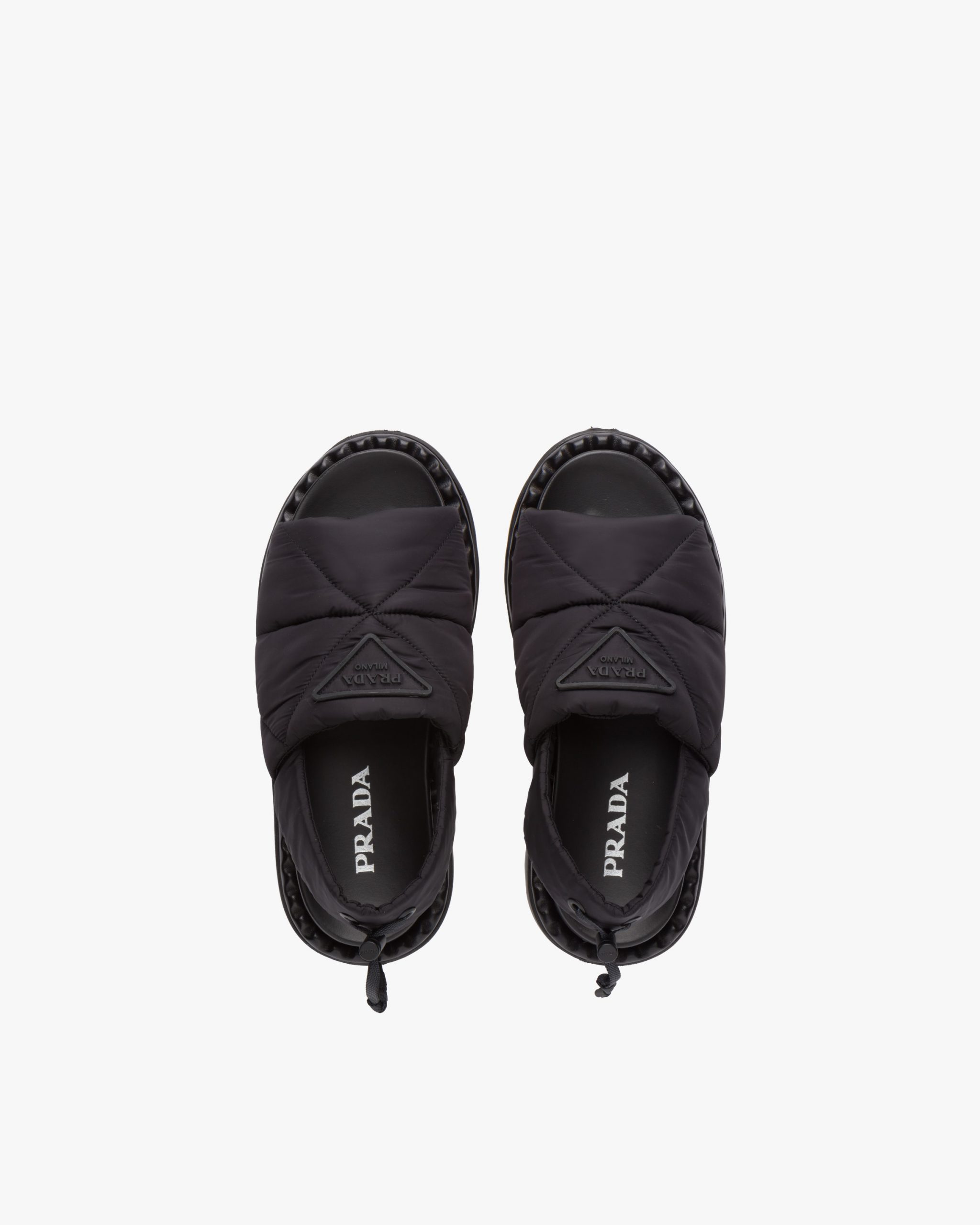 Masculine lines with sporty allure are redesigned to create original, contemporary silhouettes. The upper characterized by the quilted nylon texture is accented by the elasticized drawstring and embossed triangle logo2.